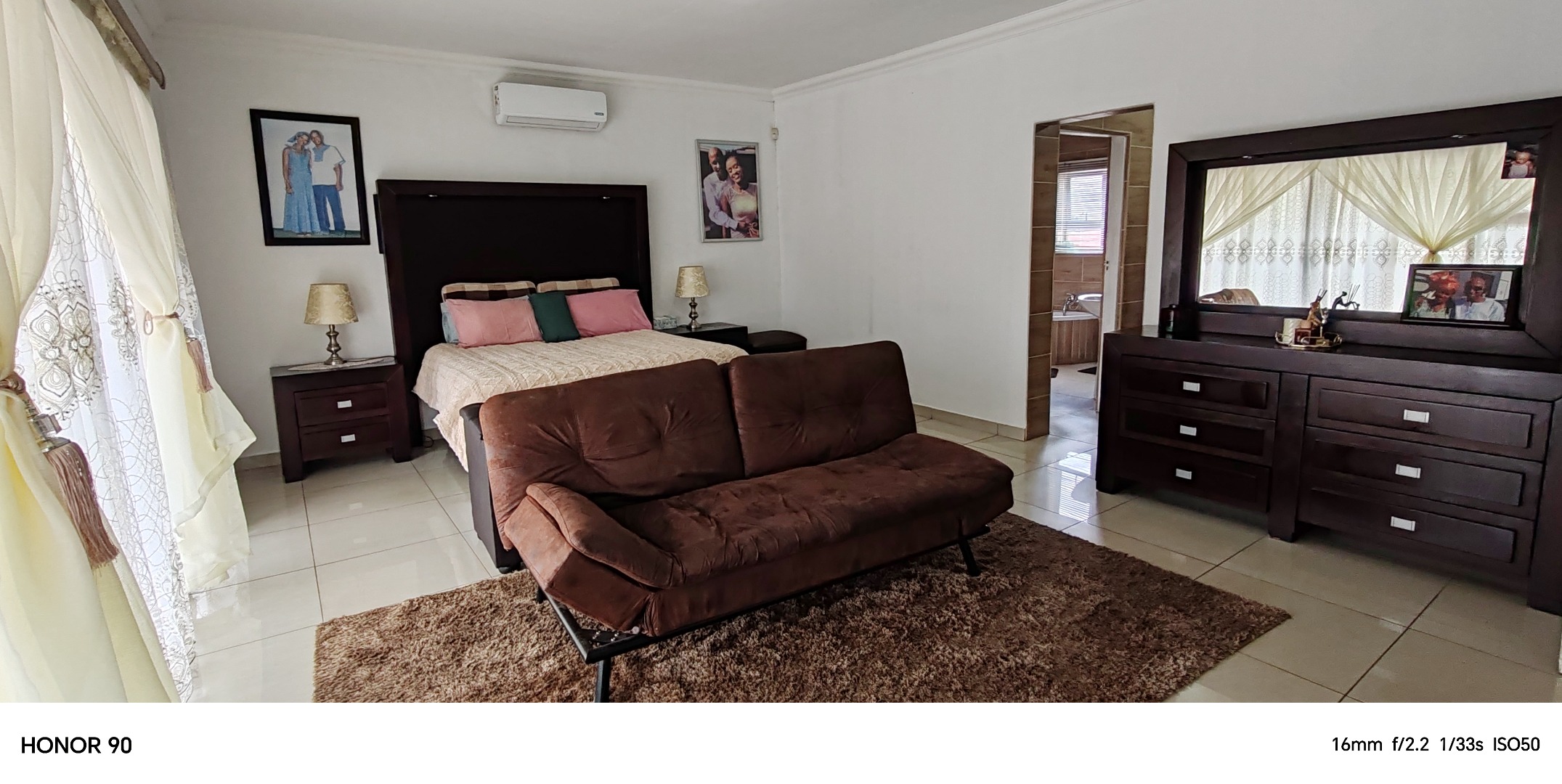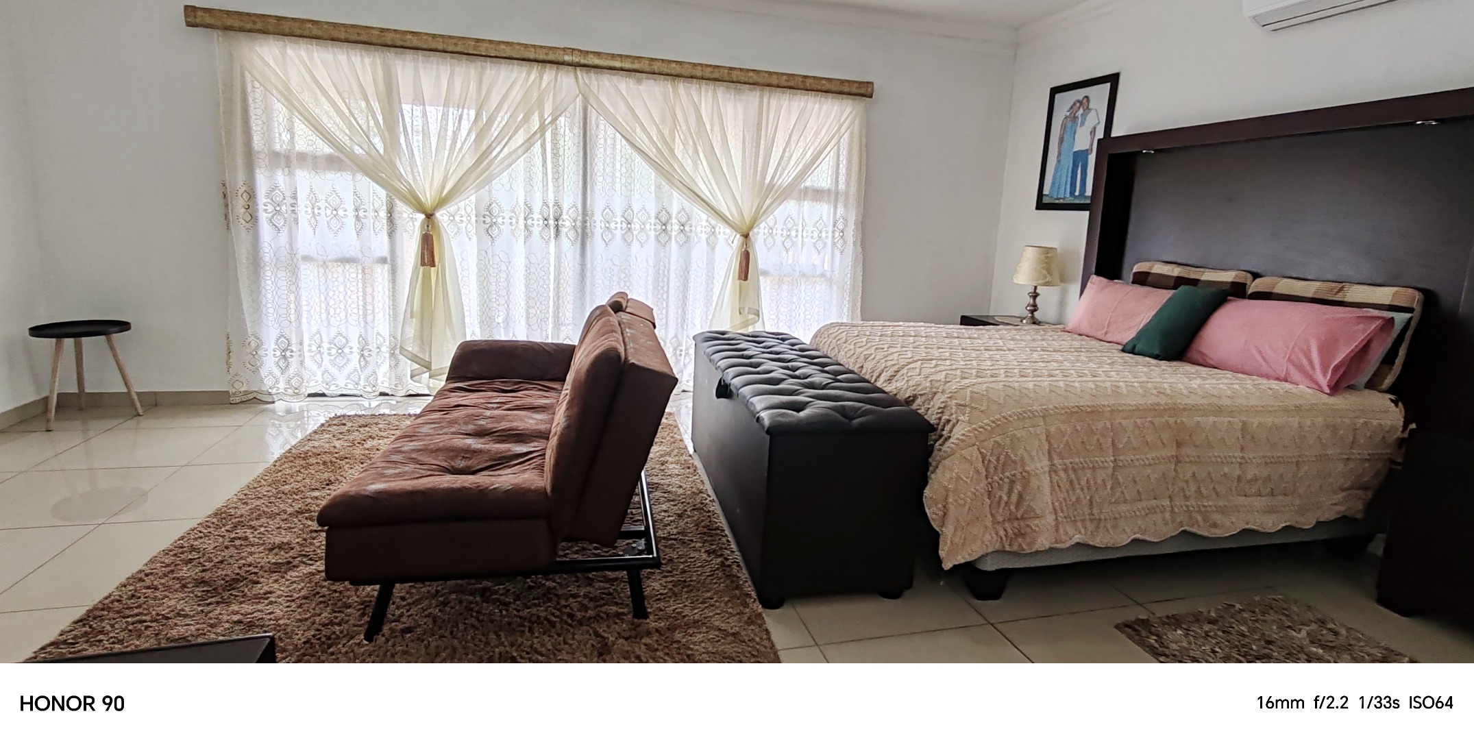 Security is paramount with an access gate, alarm system, CCTV surveillance, and burglar bars, all within a totally walled property. This home also embraces modern sustainability with installed solar panels and a battery inverter, ensuring energy efficiency and backup power.