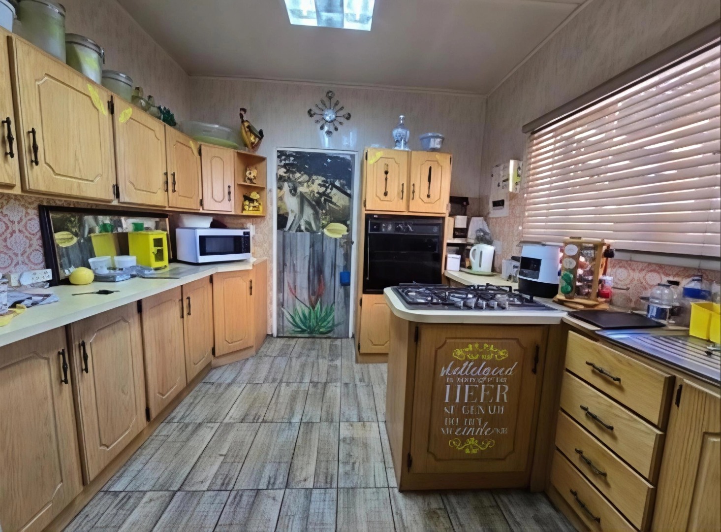 Inside, the home features a functional layout designed for everyday convenience. The kitchen is equipped with ample light wood-tone cabinetry, a gas hob, and a built-in oven, alongside a practical double sink, all set on durable wood-look tiled flooring. Adjacent to this, a dedicated dining room and a spacious lounge provide versatile areas for relaxation and entertaining. Additional interior spaces include a dedicated study and a convenient laundry room.