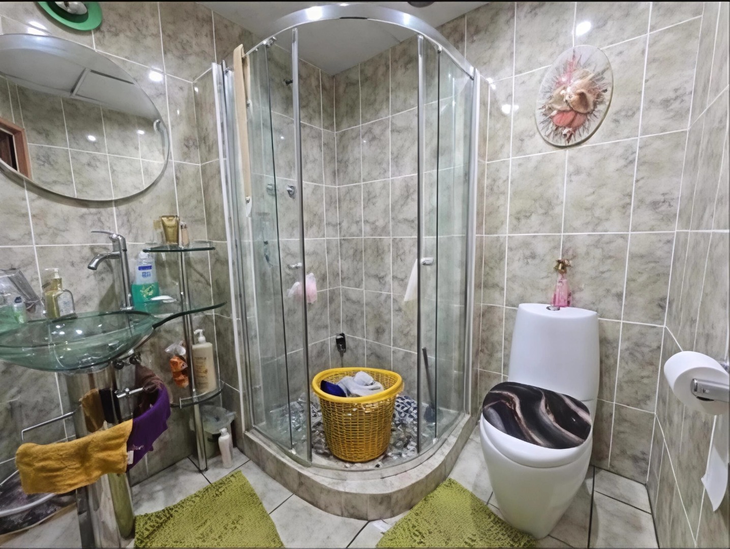 The four bedrooms offer comfortable accommodation, with one featuring air conditioning for enhanced comfort. The two bathrooms include a main bathroom with a full-sized bathtub and vanity, and an ensuite bathroom with a modern corner glass shower and a stylish glass basin. A guest toilet adds further practicality. Tiled flooring extends throughout much of the home, ensuring easy maintenance.