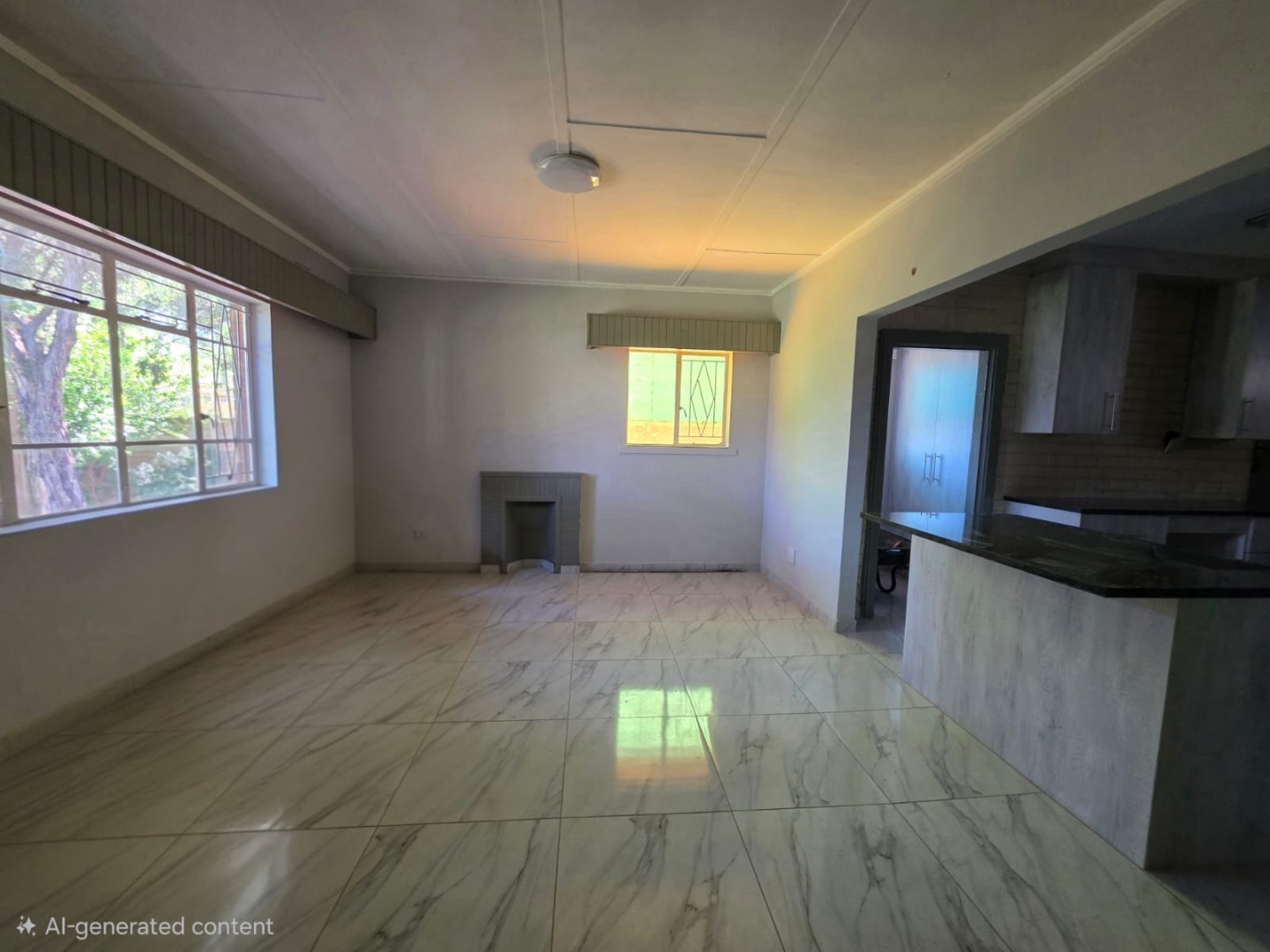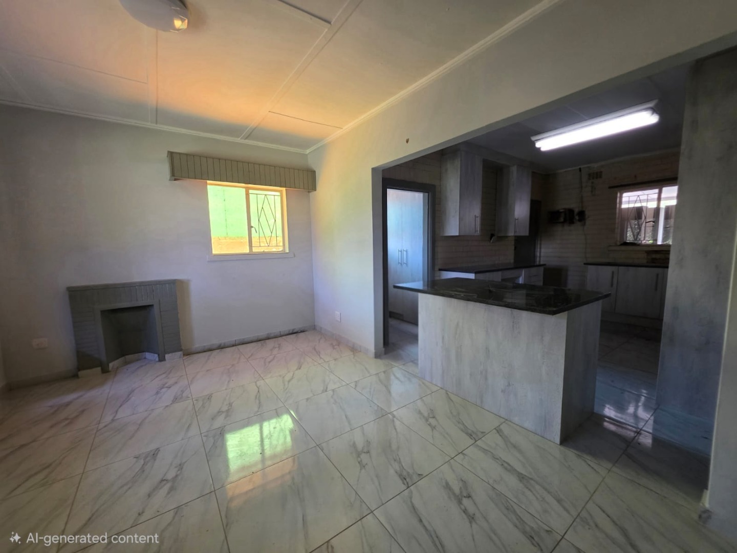 The interior boasts an open-plan layout, seamlessly connecting the living spaces. The lounge features modern tiled flooring and ample natural light, creating a bright and welcoming atmosphere. An updated kitchen, complete with new light-colored cabinetry, dark countertops, and a convenient breakfast bar, forms the heart of the home. Unique exposed brick accents in the kitchen add character, while the tiled flooring extends throughout for a cohesive finish. A decorative fireplace in the living area provides a charming focal point.