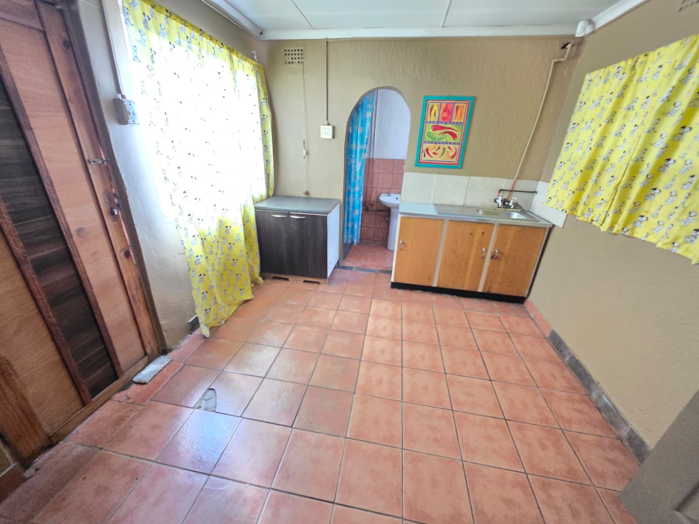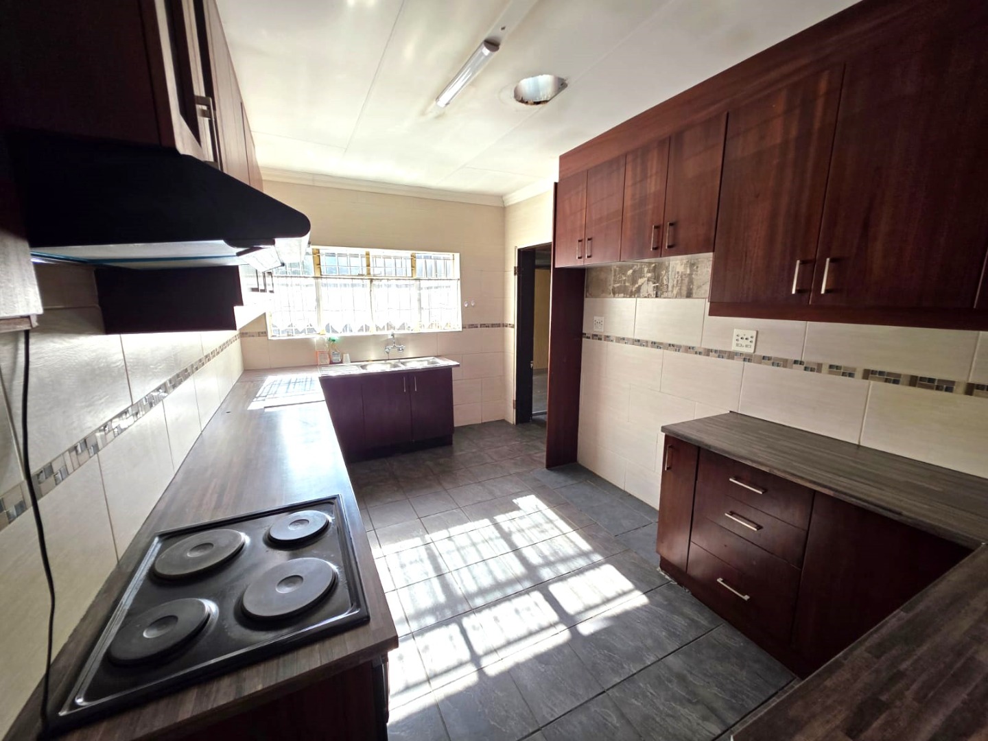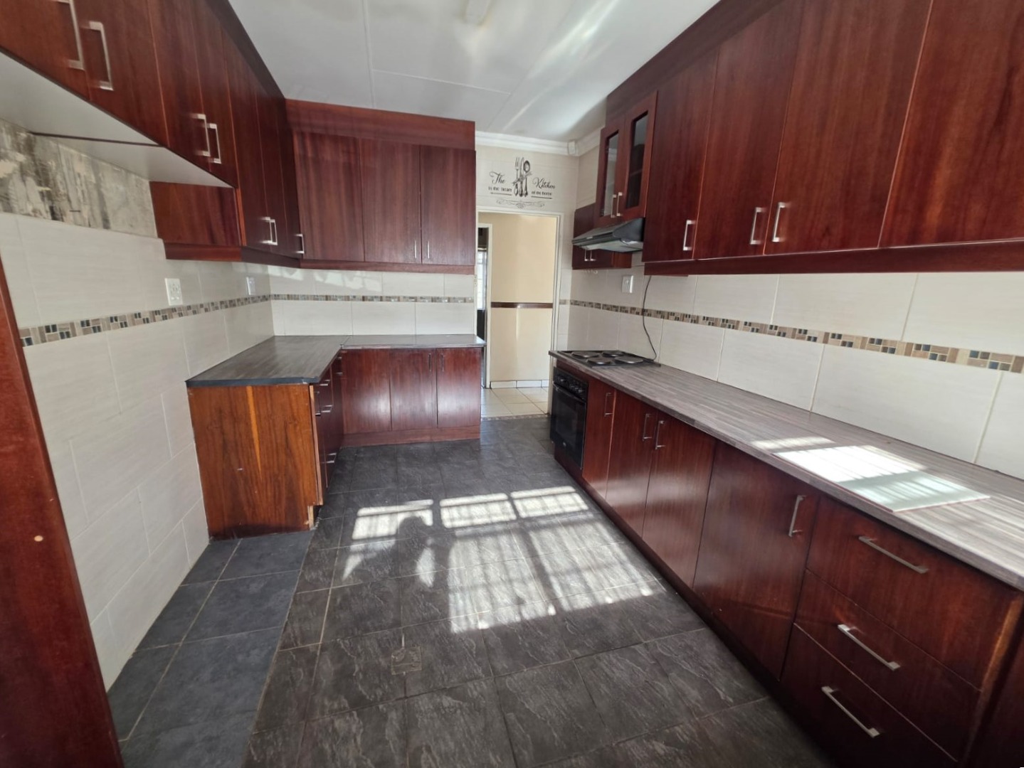 Step into a large kitchen fitted with beautiful wooden built-in cupboards, a stove (HOB), and ample workspace for effortless meal preparation. A separate laundry area adds convenience and practicality to the home.