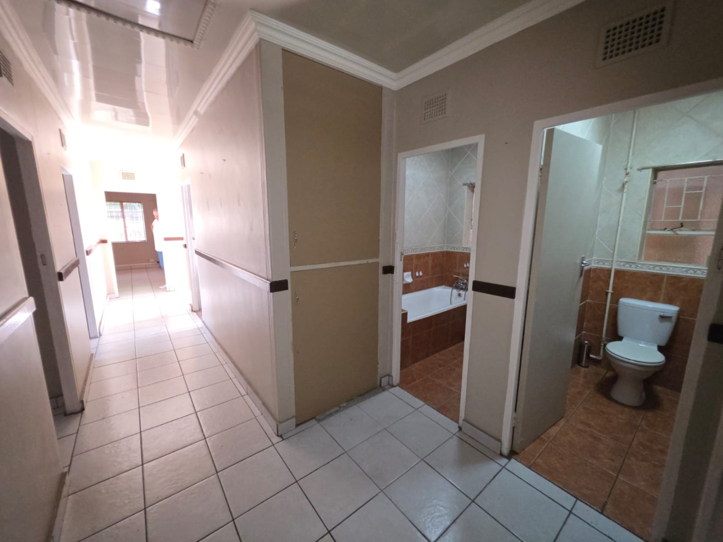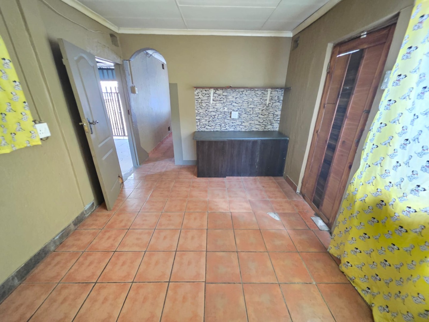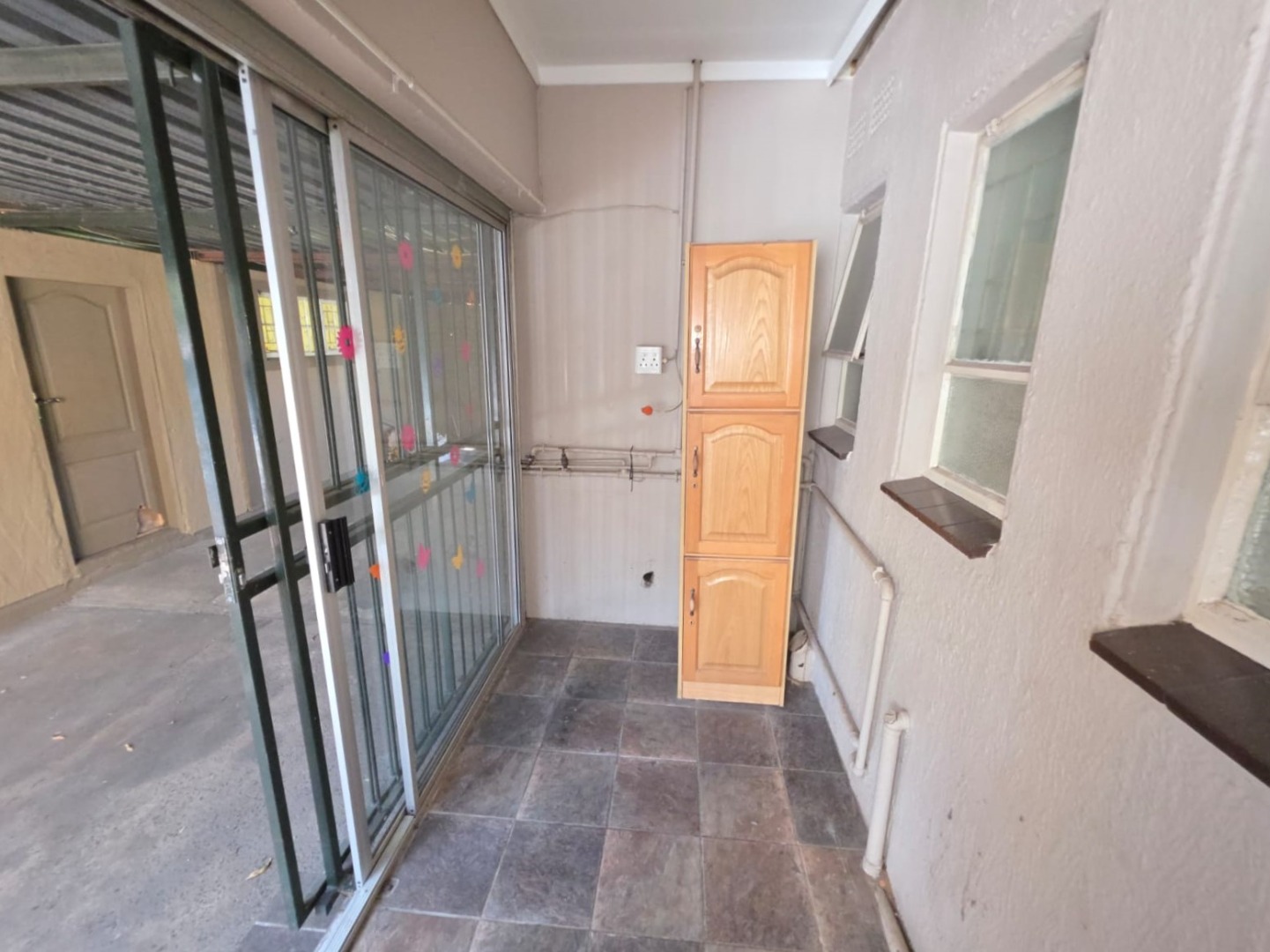 Step into a large kitchen fitted with beautiful wooden built-in cupboards, a stove (HOB), and ample workspace for effortless meal preparation. A separate laundry area adds convenience and practicality to the home.