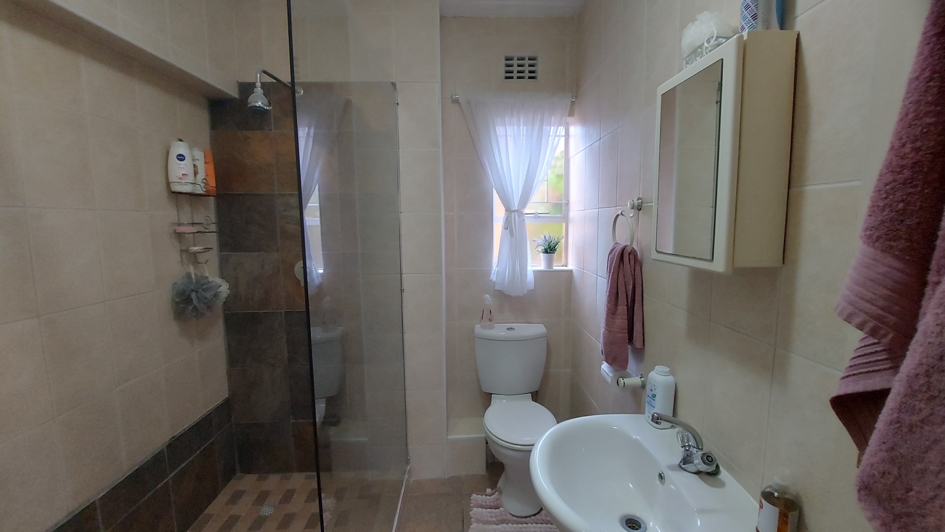 - The bathroom is spacious with a extra large shower, a toilet and a basin.