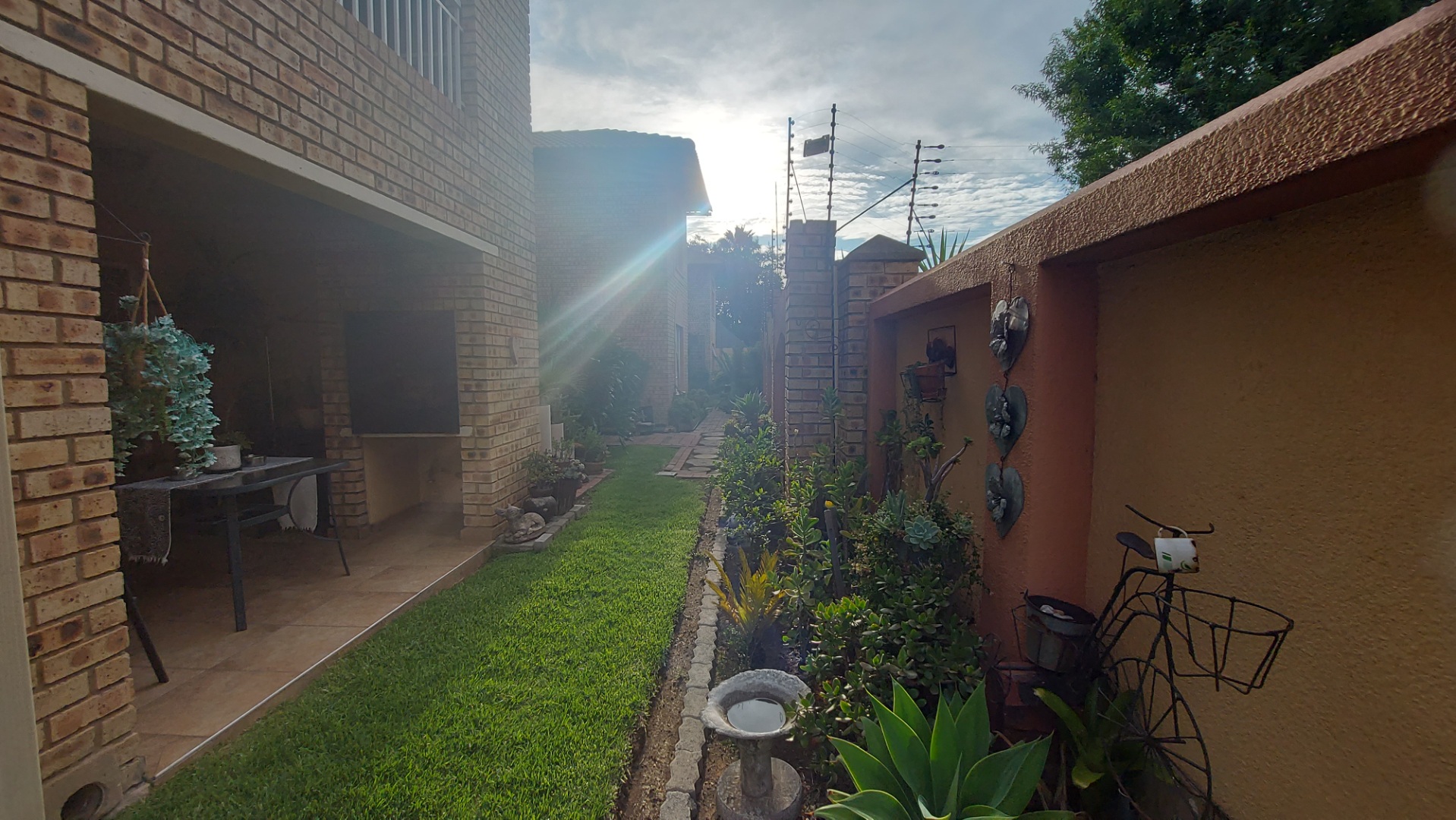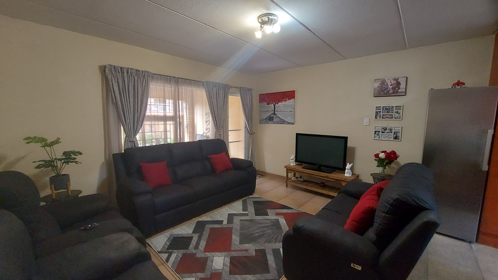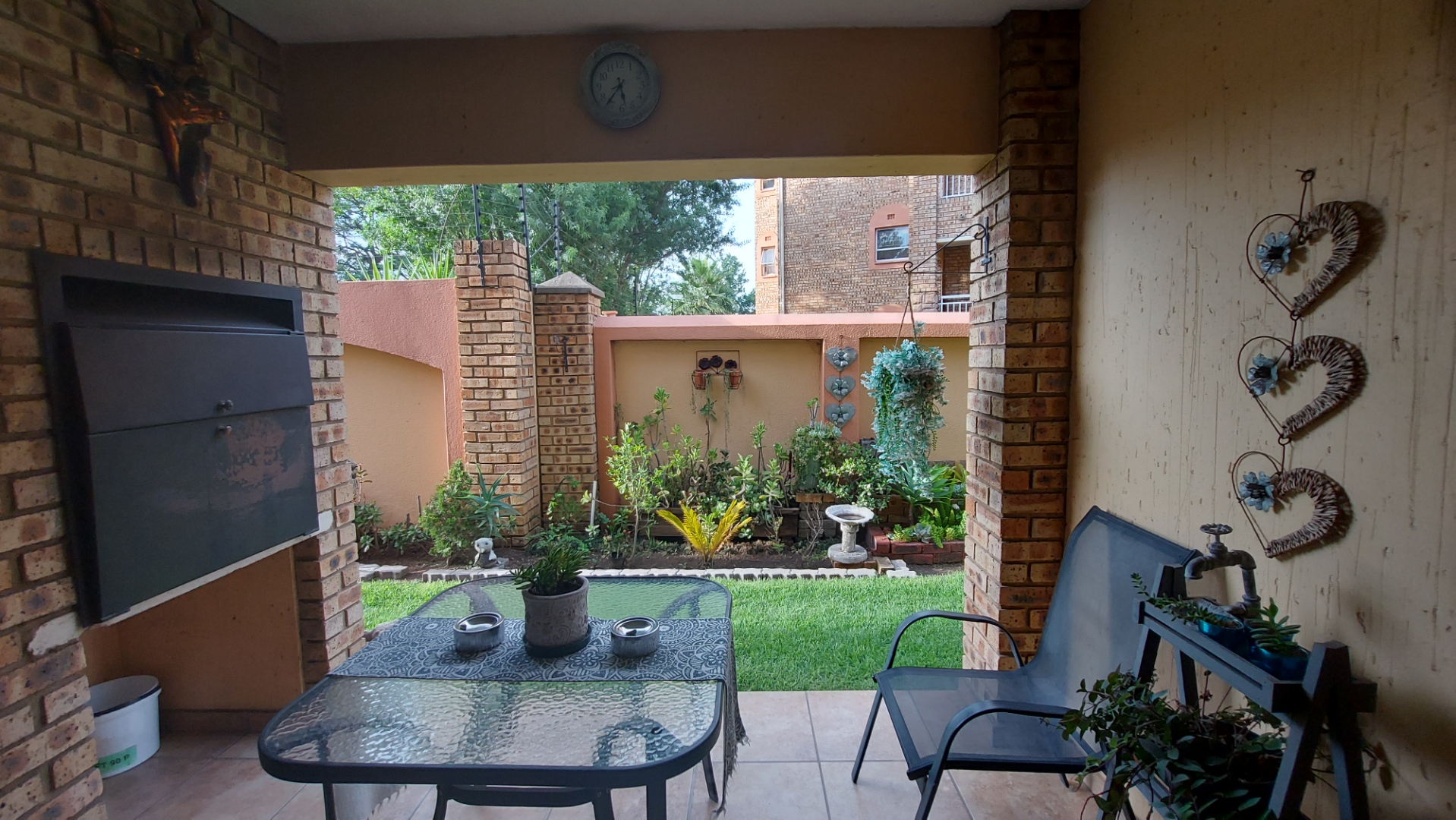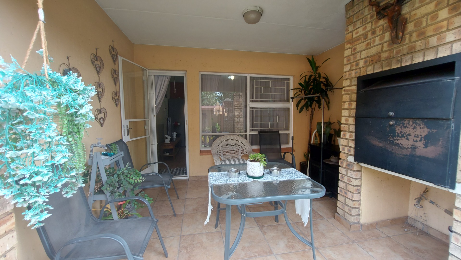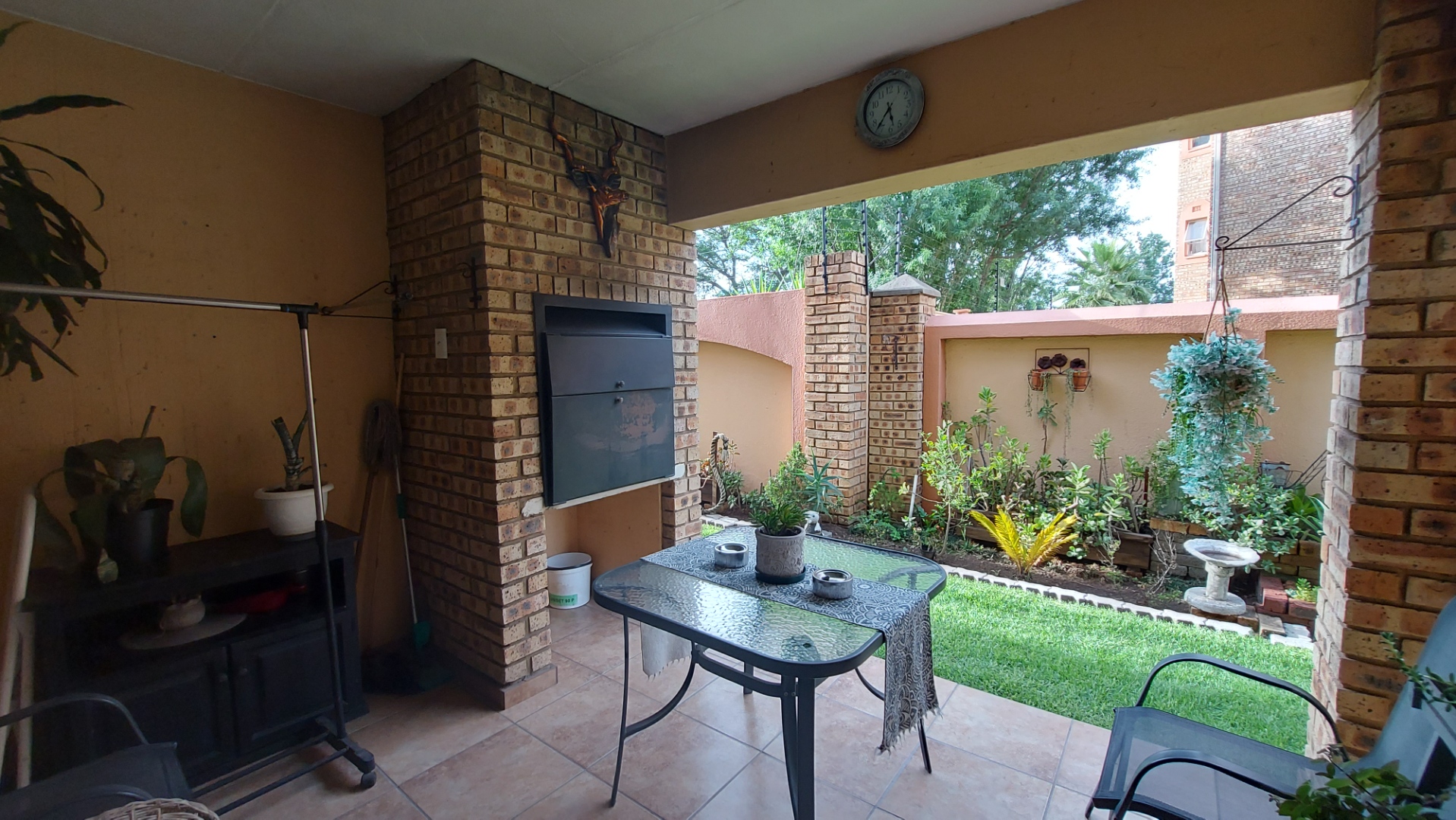 -Living area has a door leading to an outside patio with a built-in braai.