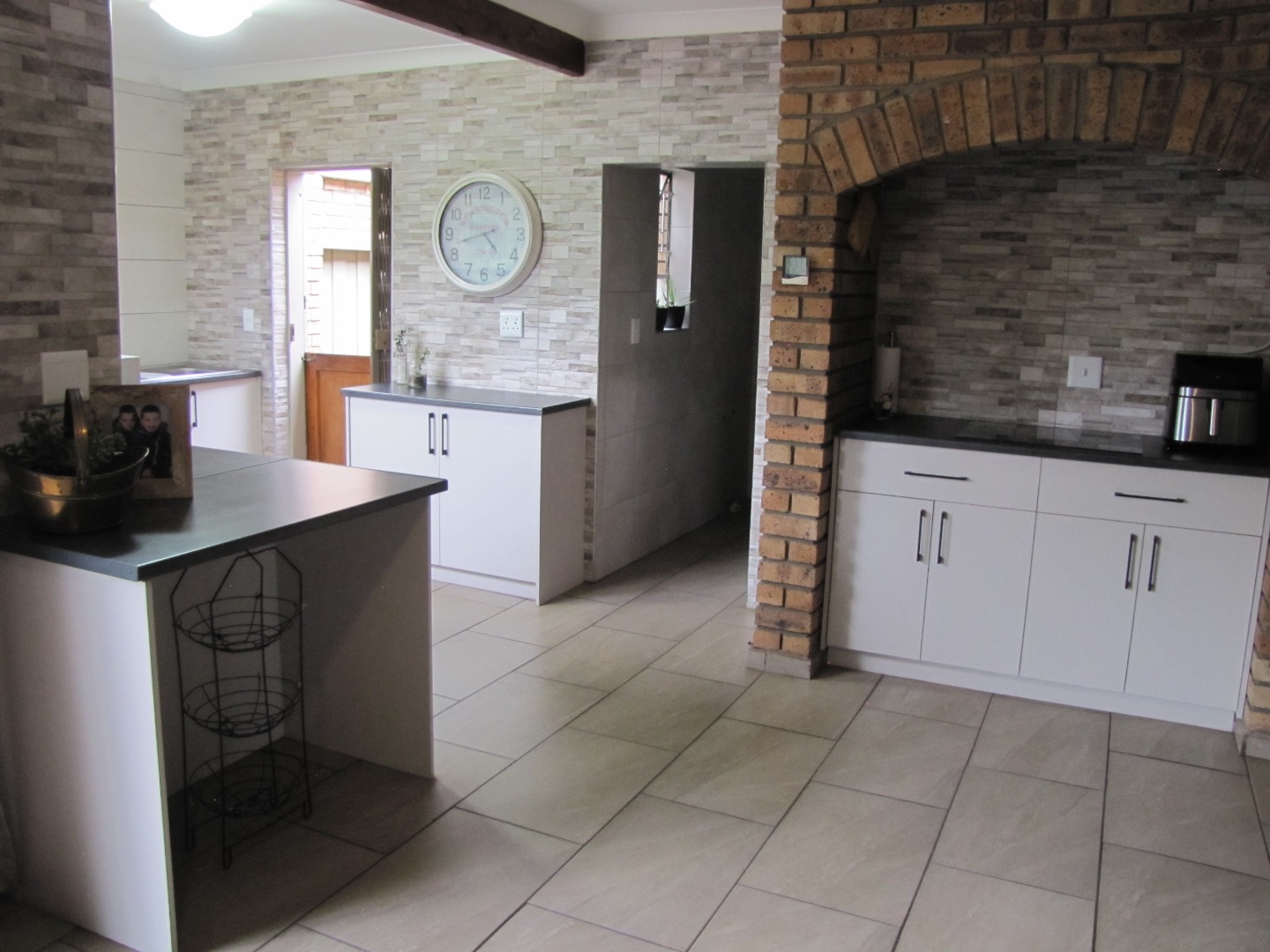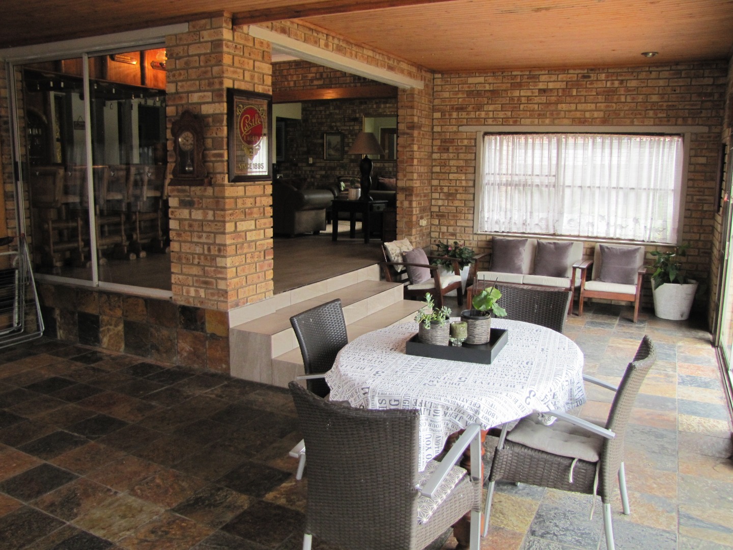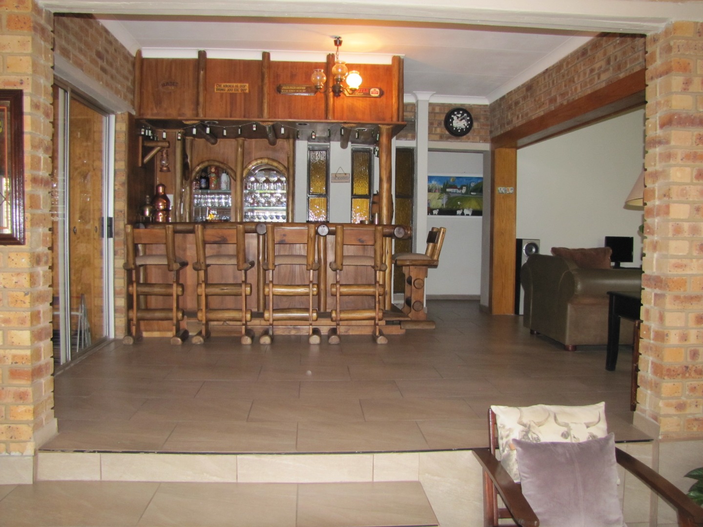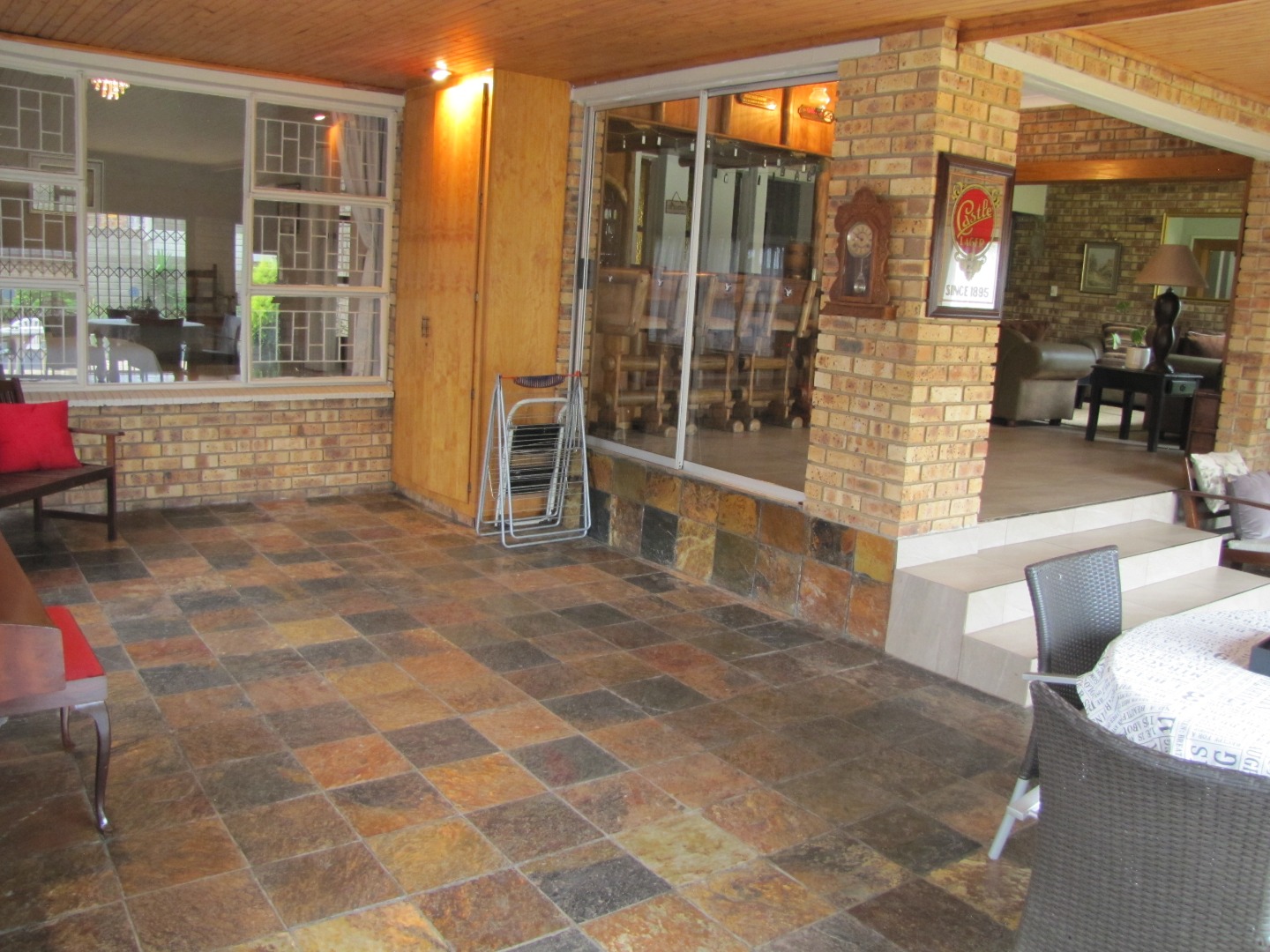 The inviting kitchen is large and has a table top stove, eye-level oven, ample built-in cupboards and a scullery/laundry area. An added extra is that there is an open plan dining area in the kitchen.