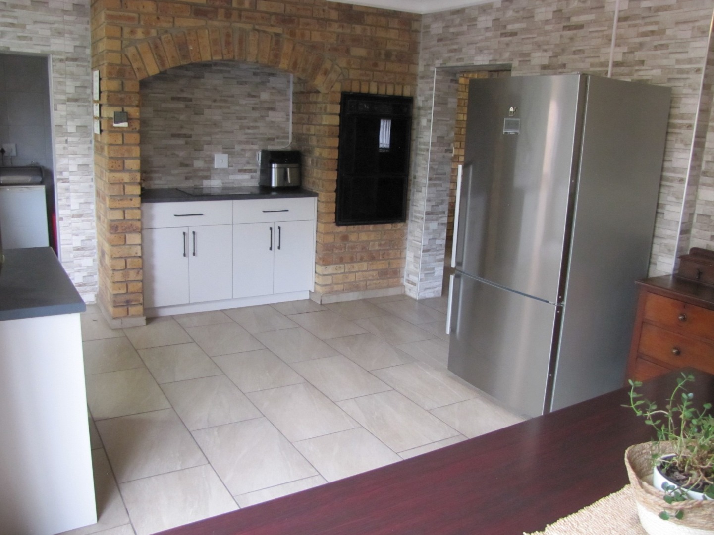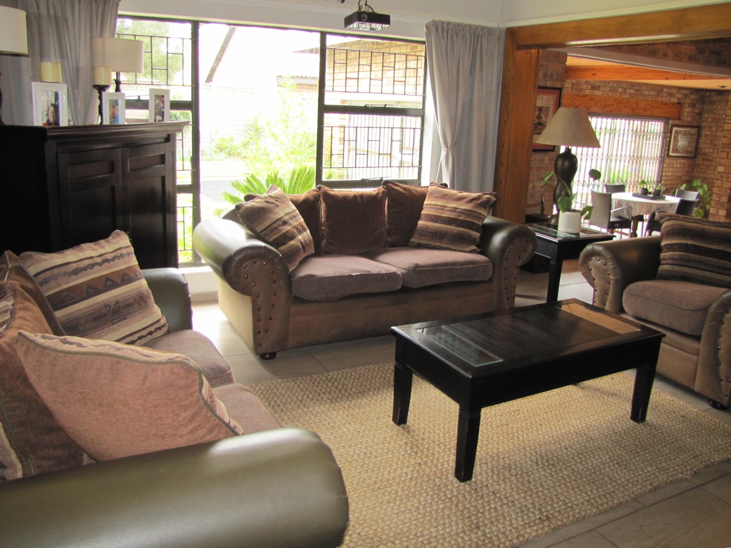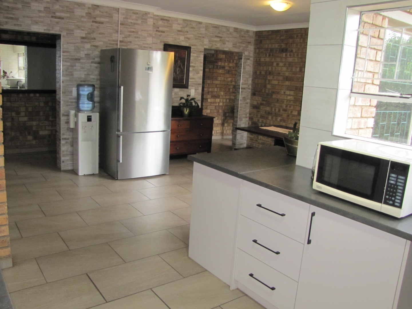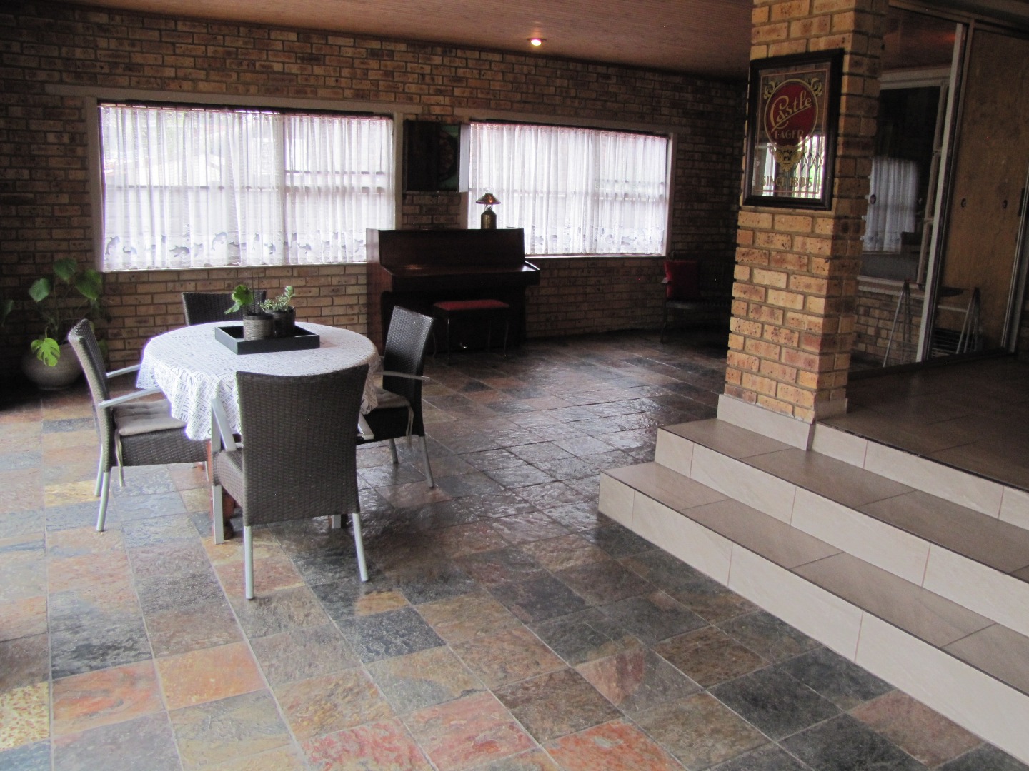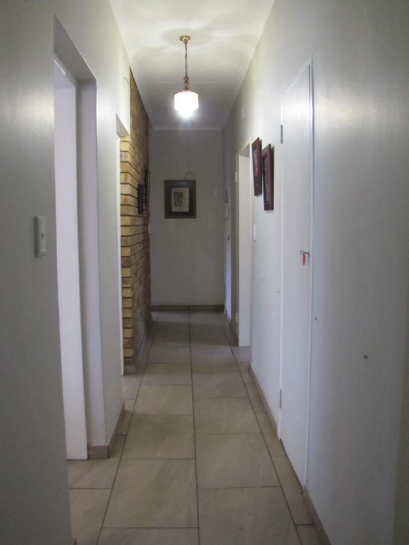 The inviting kitchen is large and has a table top stove, eye-level oven, ample built-in cupboards and a scullery/laundry area. An added extra is that there is an open plan dining area in the kitchen.