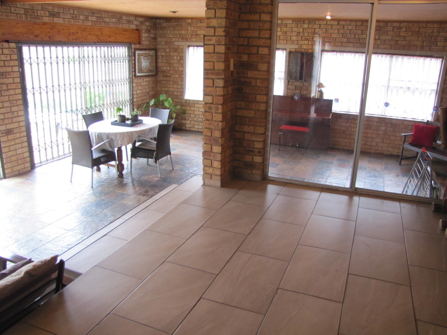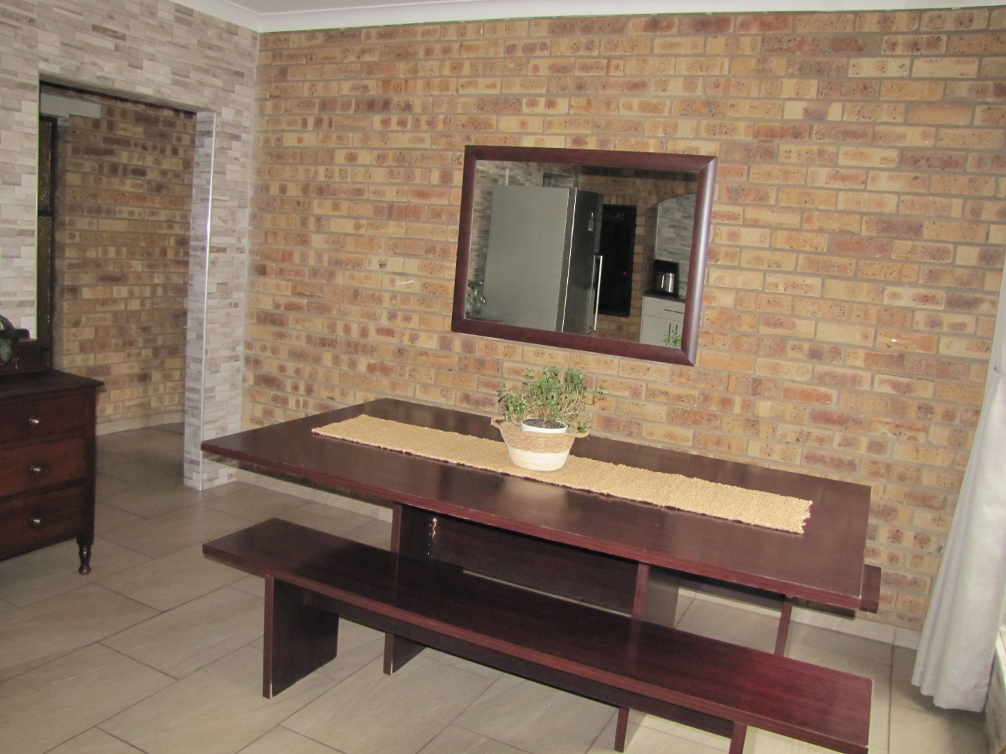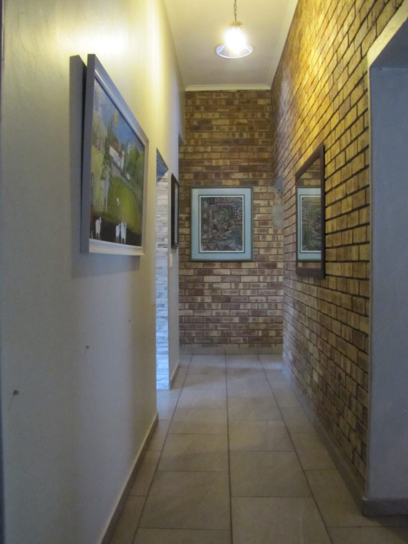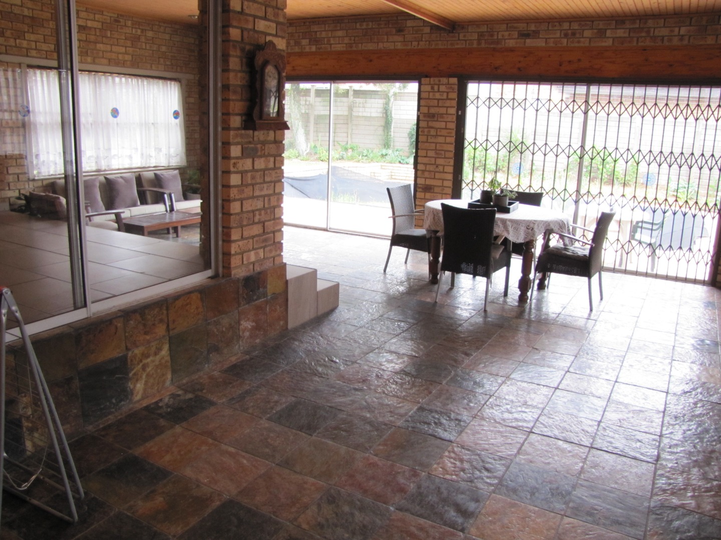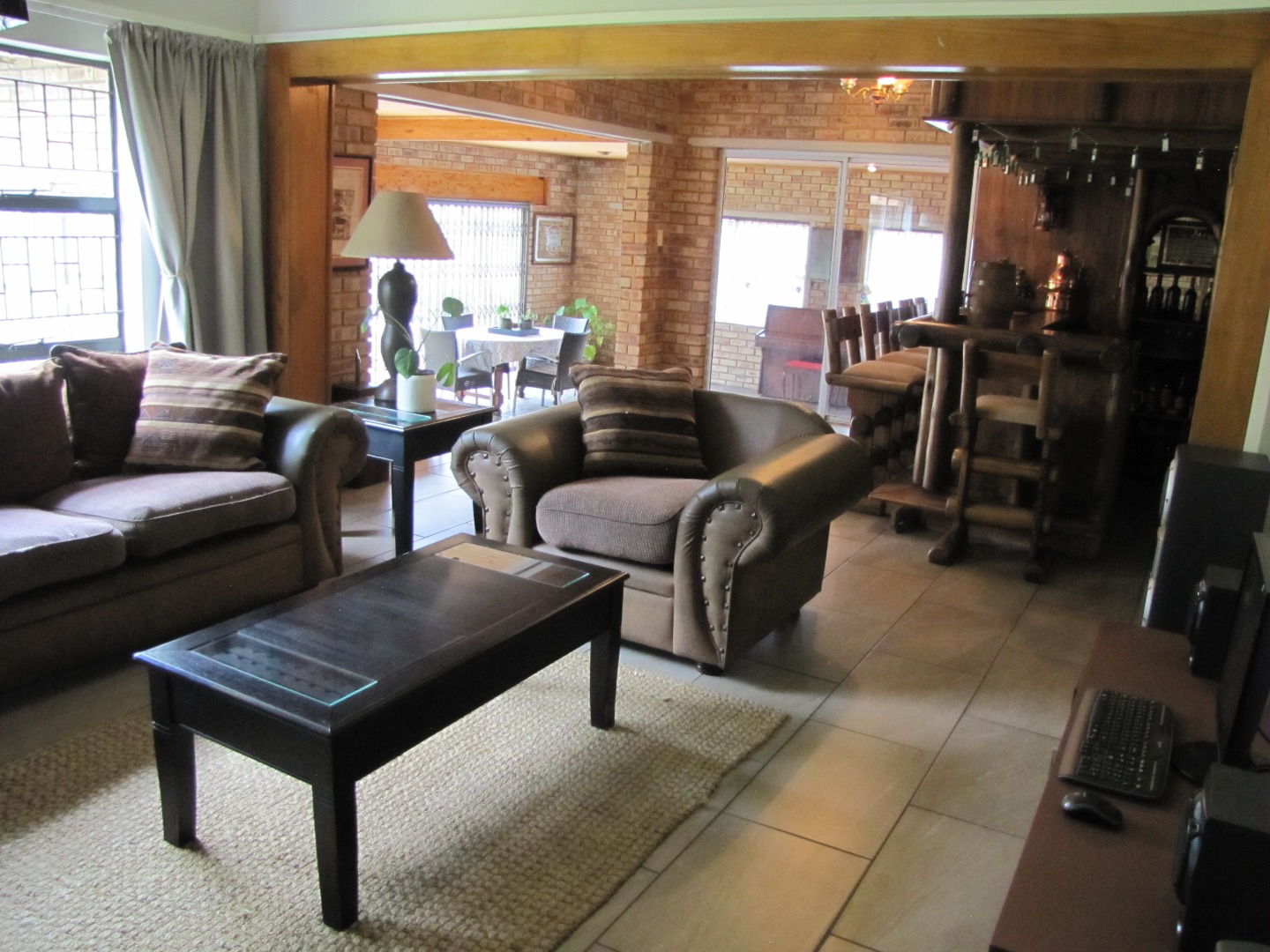 The inviting kitchen is large and has a table top stove, eye-level oven, ample built-in cupboards and a scullery/laundry area. An added extra is that there is an open plan dining area in the kitchen.