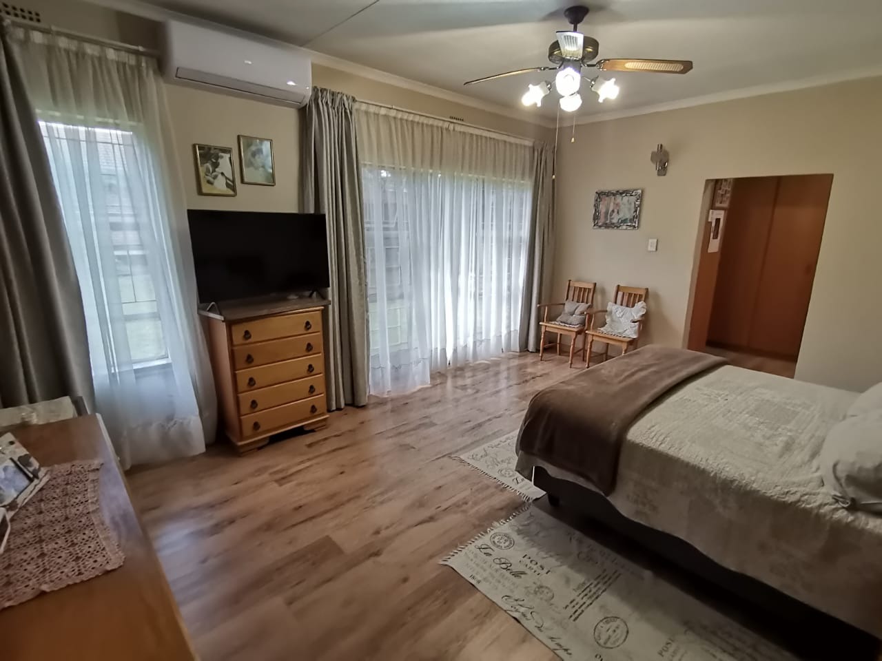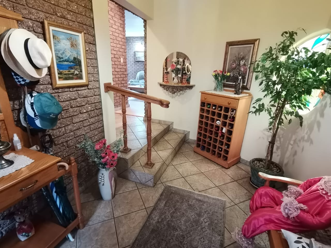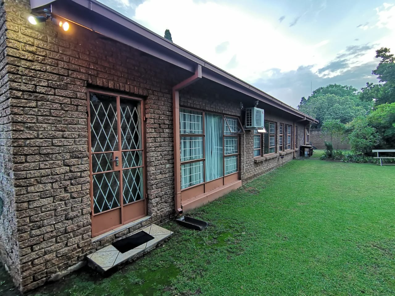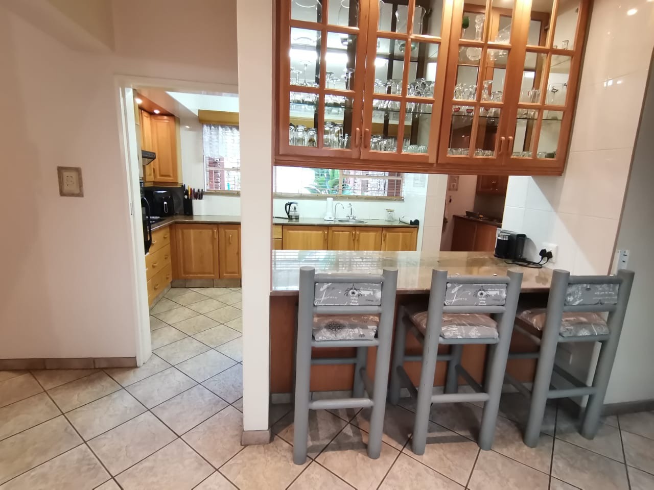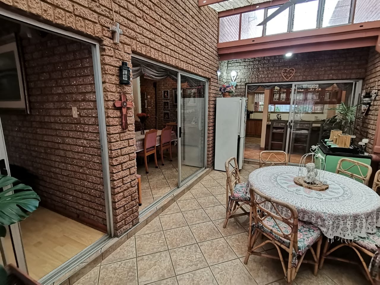 Step into a bright, welcoming entrance hall with staircase that flows seamlessly into a spacious living room and separate dining area. From here, glass doors open onto a covered, sun-drenched patio complete with a built-in braai—perfect for effortless entertaining, just steps from the kitchen. This thoughtfully designed home is ideal for family living.The property boasts four well-appointed bedrooms and two bathrooms, including an en-suite in the main bedroom. The master suite features abundant built-in cupboards, air-conditioning, elegant flooring, and direct access to the outdoors.