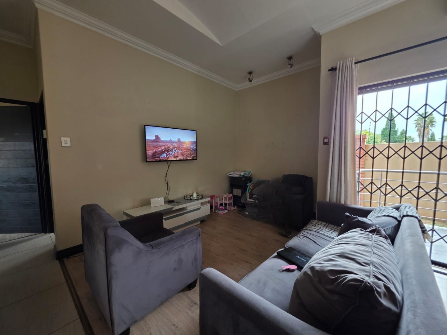 Step outside to a private, tiled patio, secured by a modern stainless steel railing and a security gate, offering an ideal spot for relaxation or outdoor dining. The property is equipped with an air conditioning unit for climate control and enhanced security features including security bars on all windows. A dedicated parking bay adds to the convenience of this charming home.