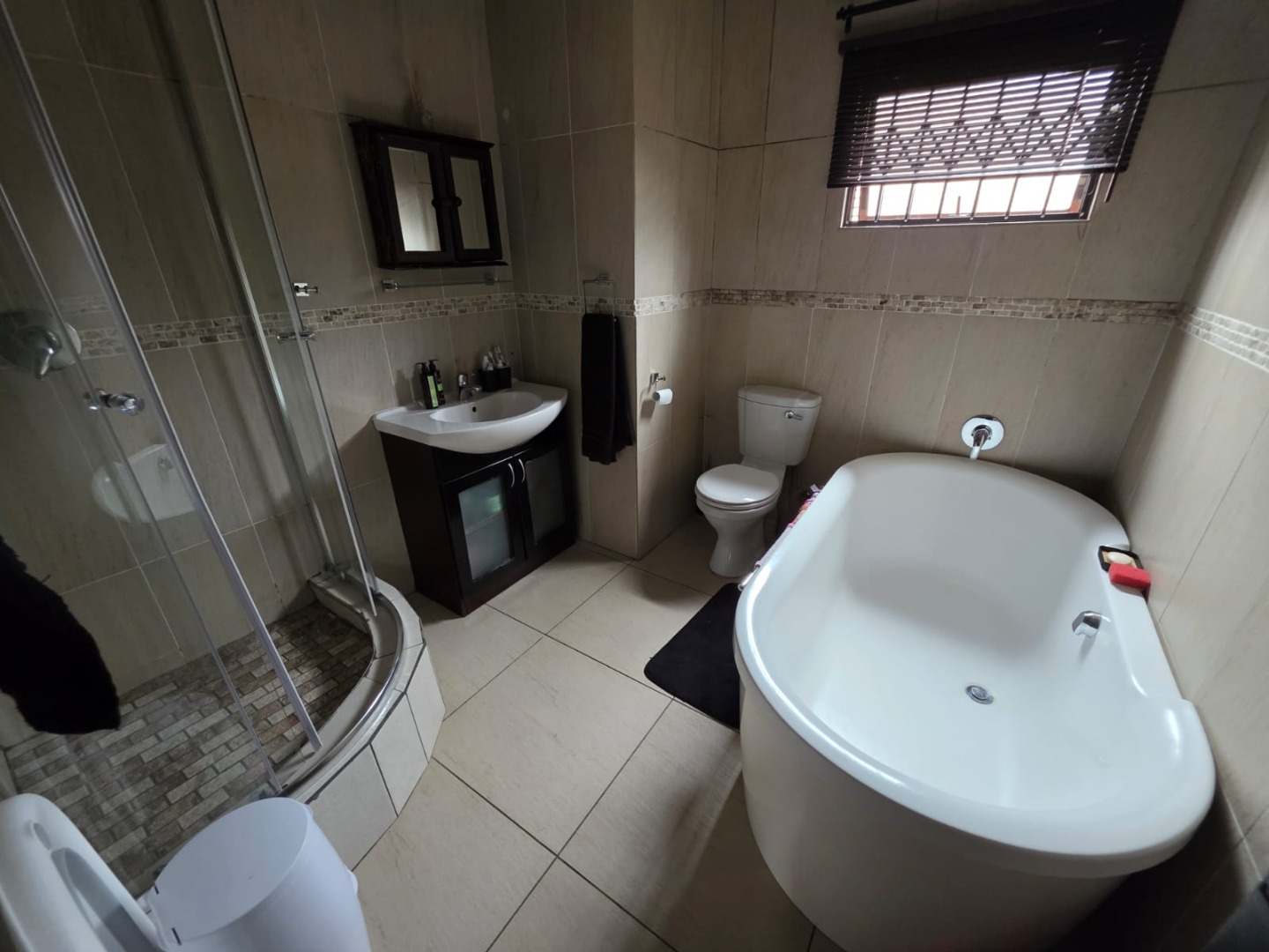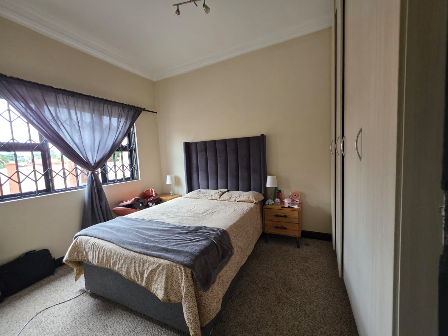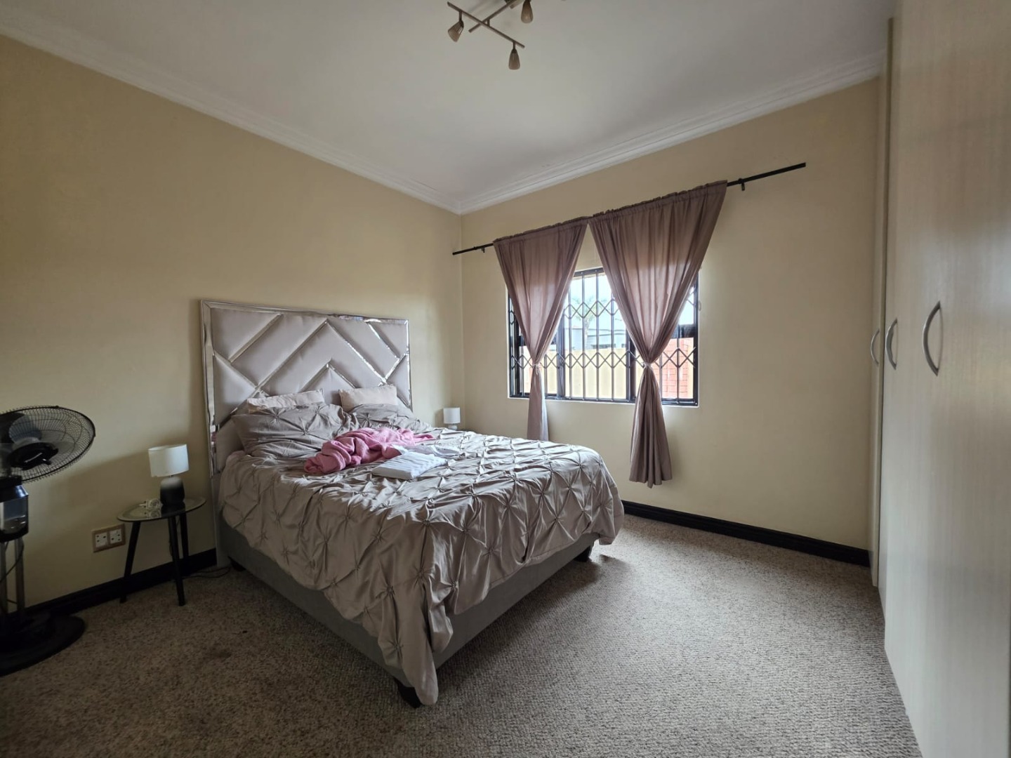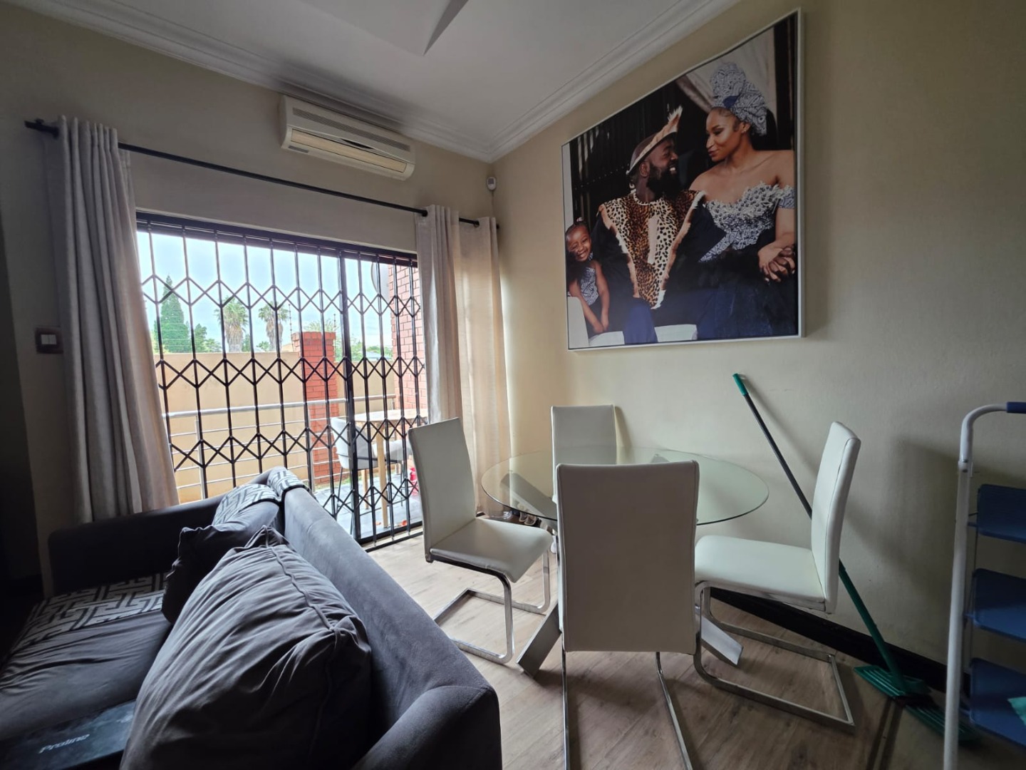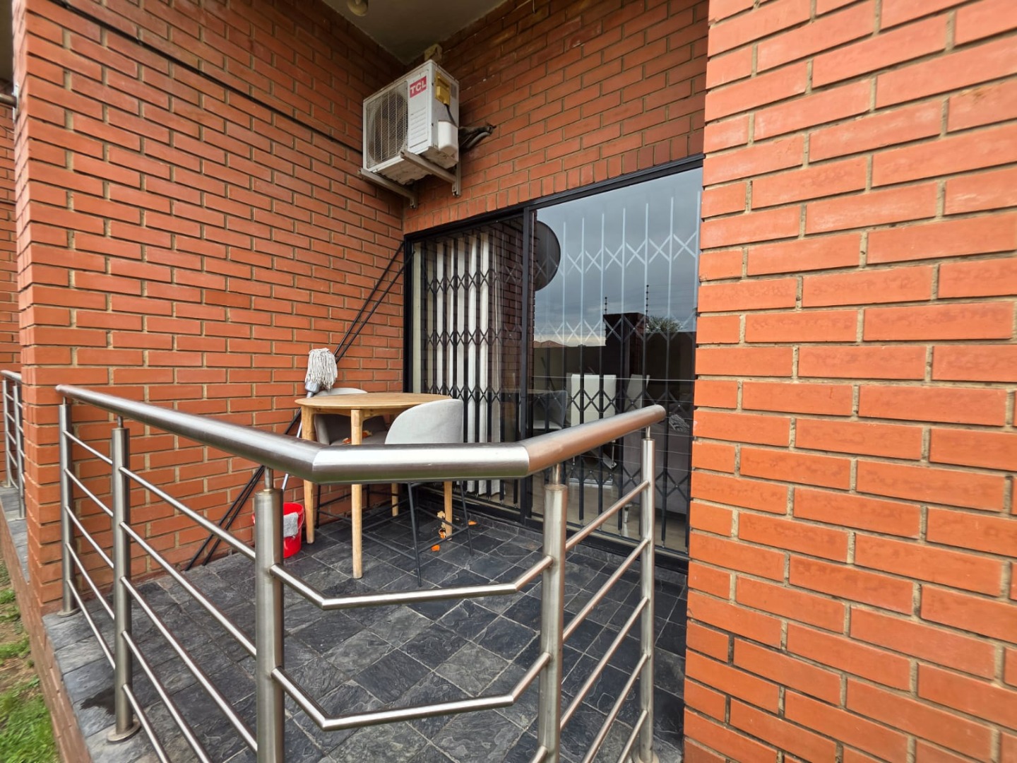 Step outside to a private, tiled patio, secured by a modern stainless steel railing and a security gate, offering an ideal spot for relaxation or outdoor dining. The property is equipped with an air conditioning unit for climate control and enhanced security features including security bars on all windows. A dedicated parking bay adds to the convenience of this charming home.