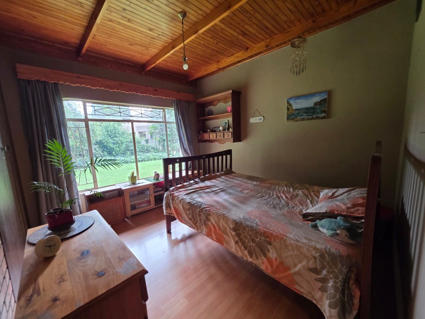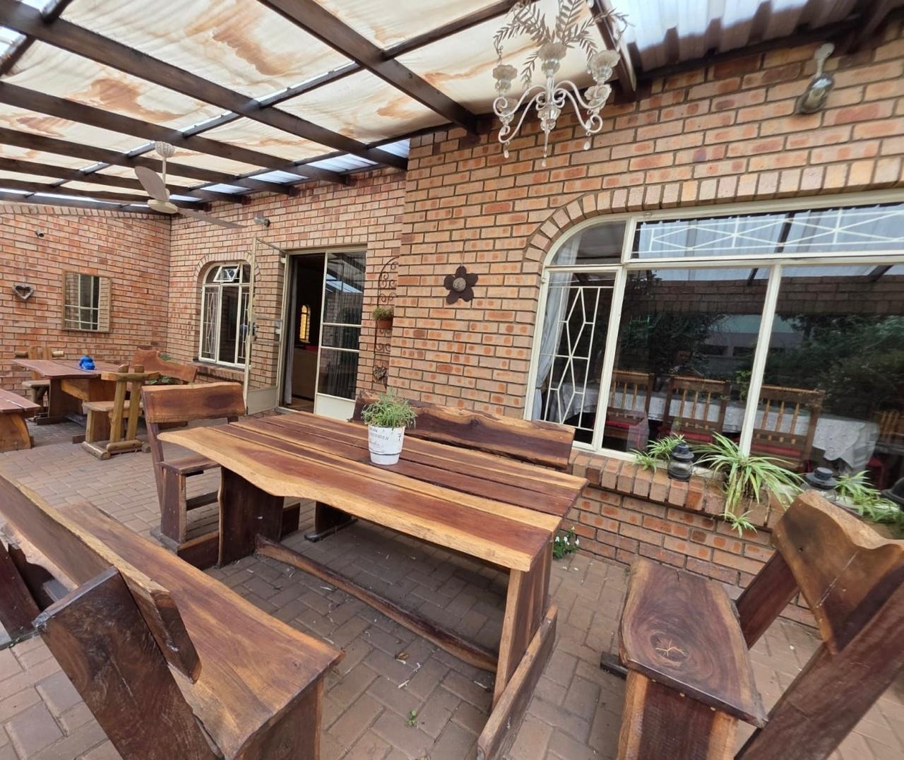 Accommodation includes three well-proportioned bedrooms and two bathrooms, providing ample space for residents. The property truly shines with its outdoor amenities, featuring a private swimming pool and a covered patio, ideal for leisure. A built-in braai and spacious paved entertainment areas, including a lapa, ensure memorable gatherings. The large garden benefits from an irrigation system and a borehole, while practical features include two garages, three additional parking spaces, and outside toilets.