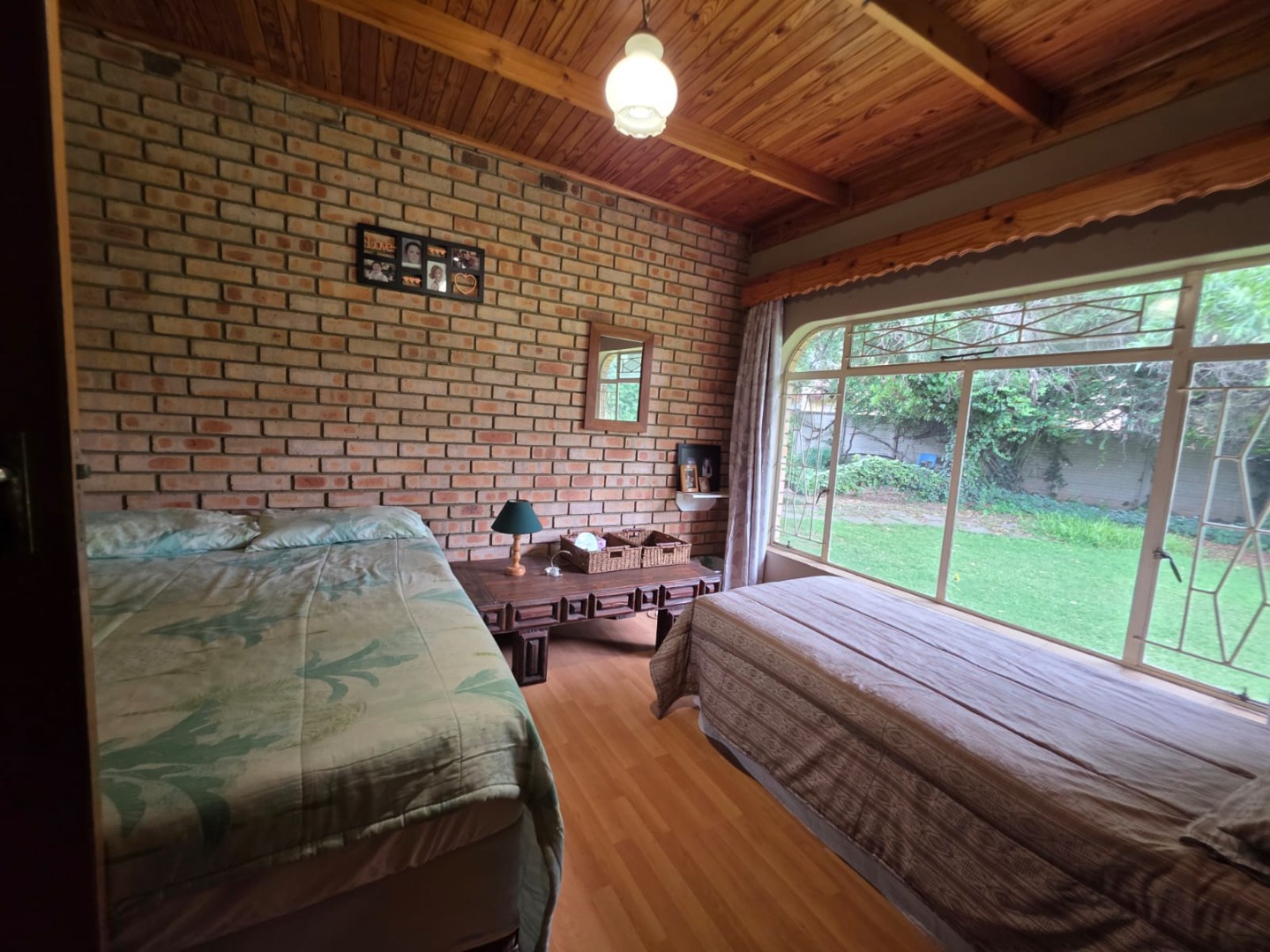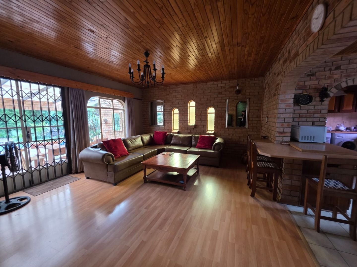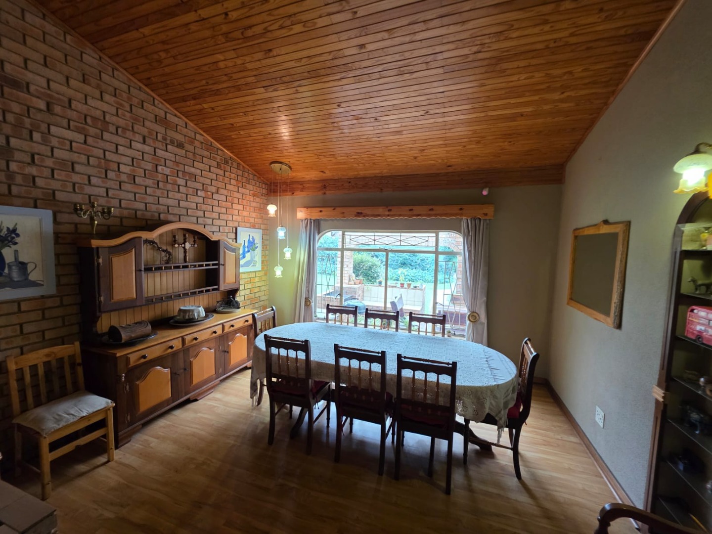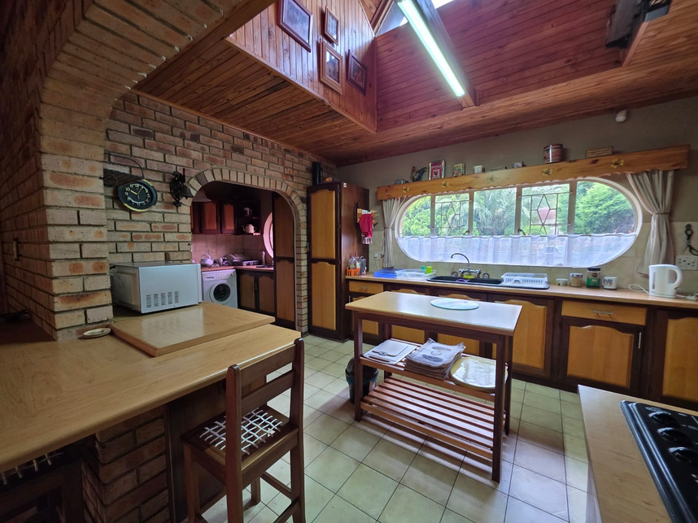 The interior boasts a functional layout designed for comfortable family living. The home offers two spacious lounges and a dedicated dining room, perfect for both relaxation and entertaining. The rustic-style kitchen is a focal point, featuring a vaulted wooden ceiling, unique oval window, and practical brick archways. It is equipped with extensive wooden cabinetry, a built-in double oven, a cooktop on an island, and a convenient breakfast bar. The dining room complements this with a prominent brick accent wall, a sloped wooden ceiling, and wood laminate flooring.