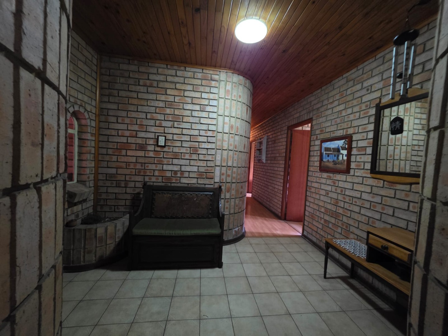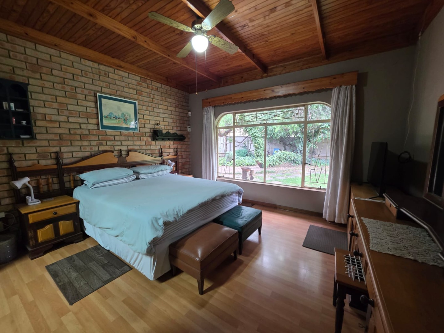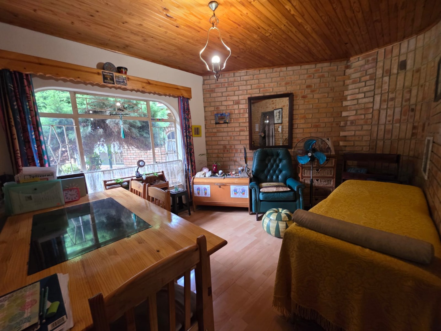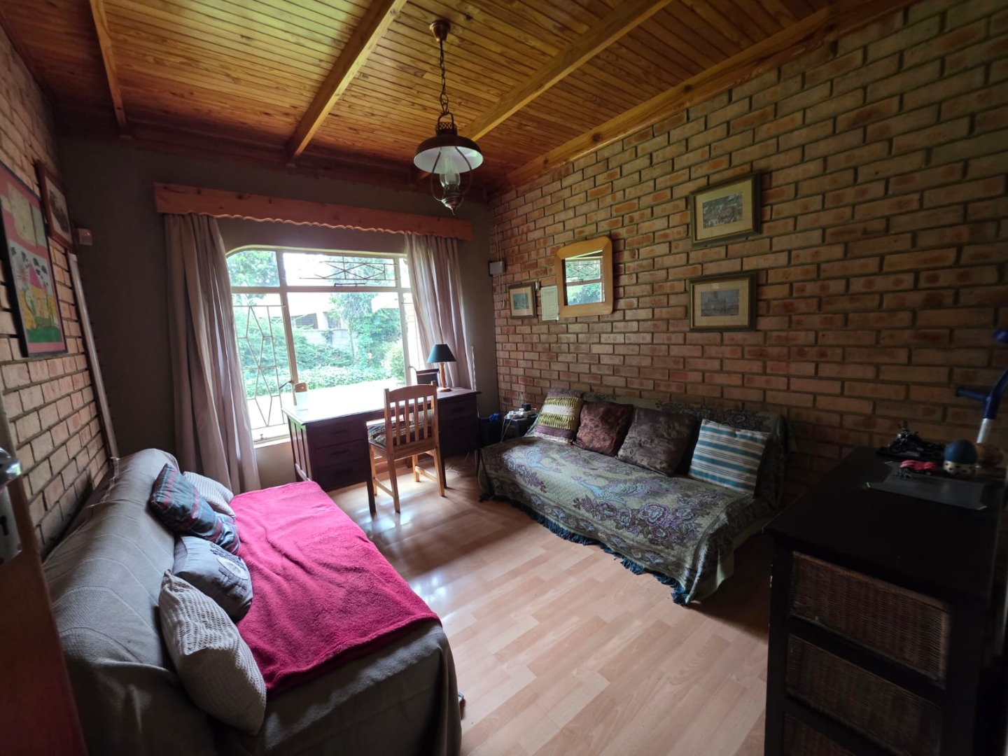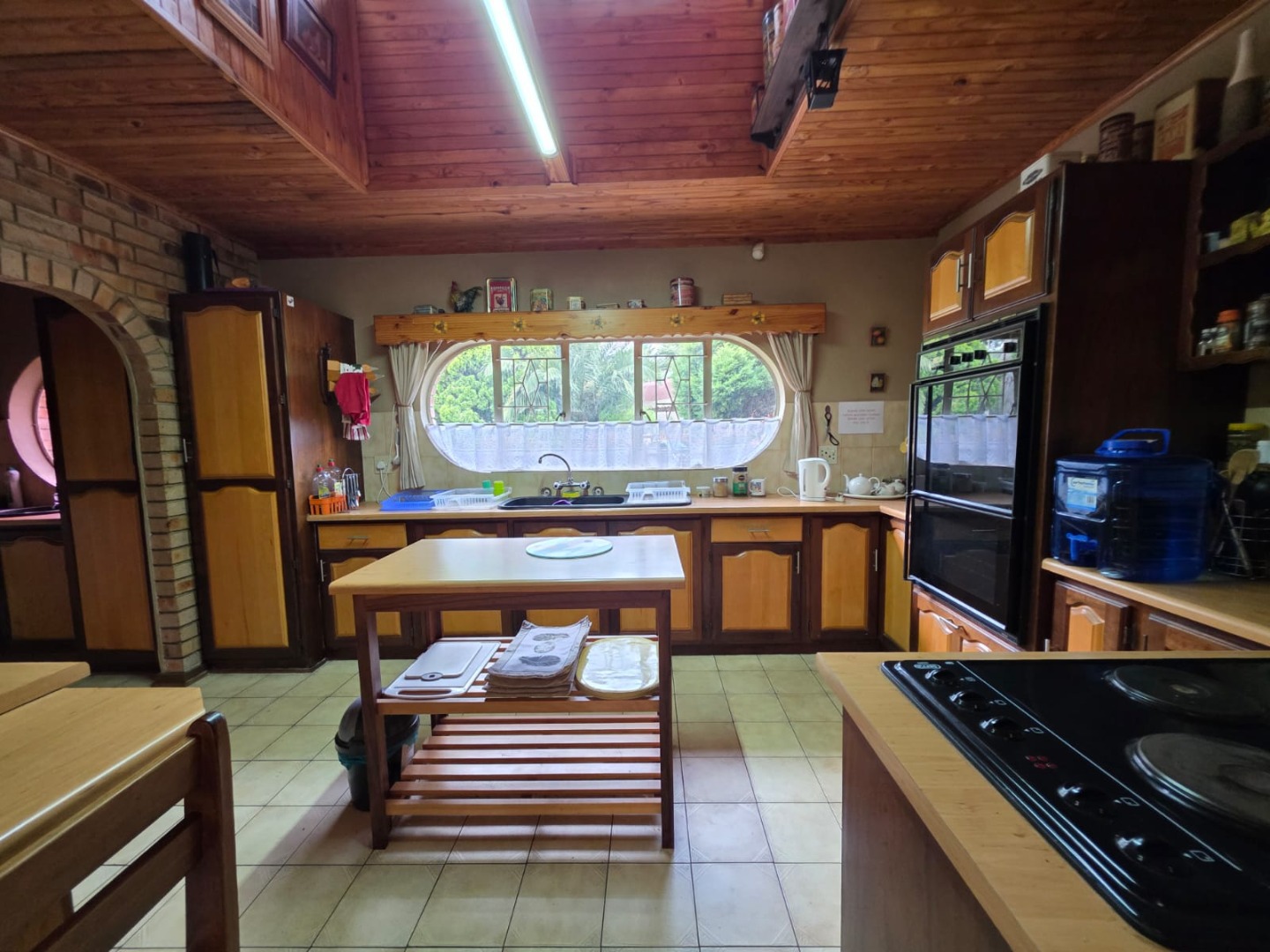 The interior boasts a functional layout designed for comfortable family living. The home offers two spacious lounges and a dedicated dining room, perfect for both relaxation and entertaining. The rustic-style kitchen is a focal point, featuring a vaulted wooden ceiling, unique oval window, and practical brick archways. It is equipped with extensive wooden cabinetry, a built-in double oven, a cooktop on an island, and a convenient breakfast bar. The dining room complements this with a prominent brick accent wall, a sloped wooden ceiling, and wood laminate flooring.