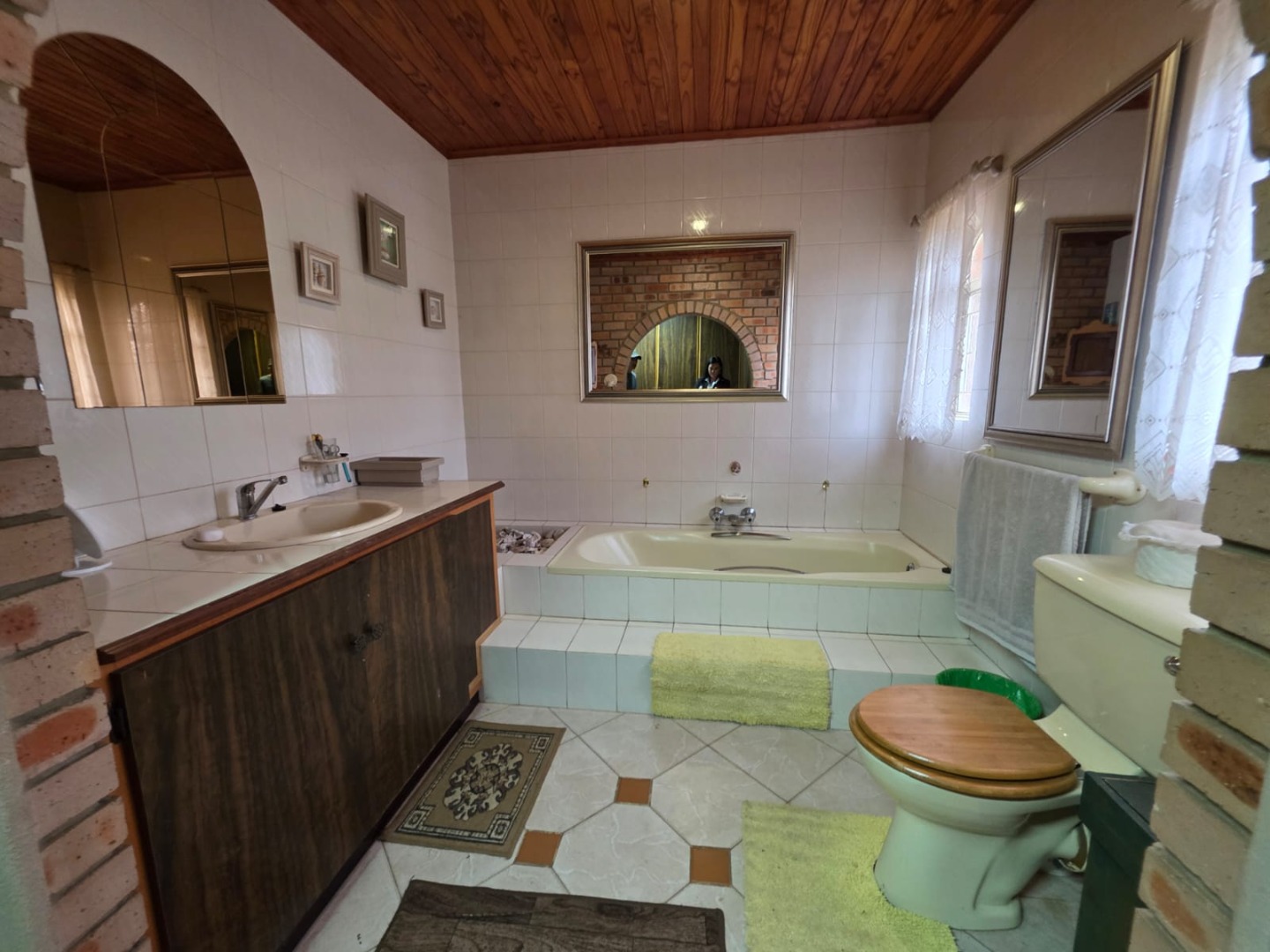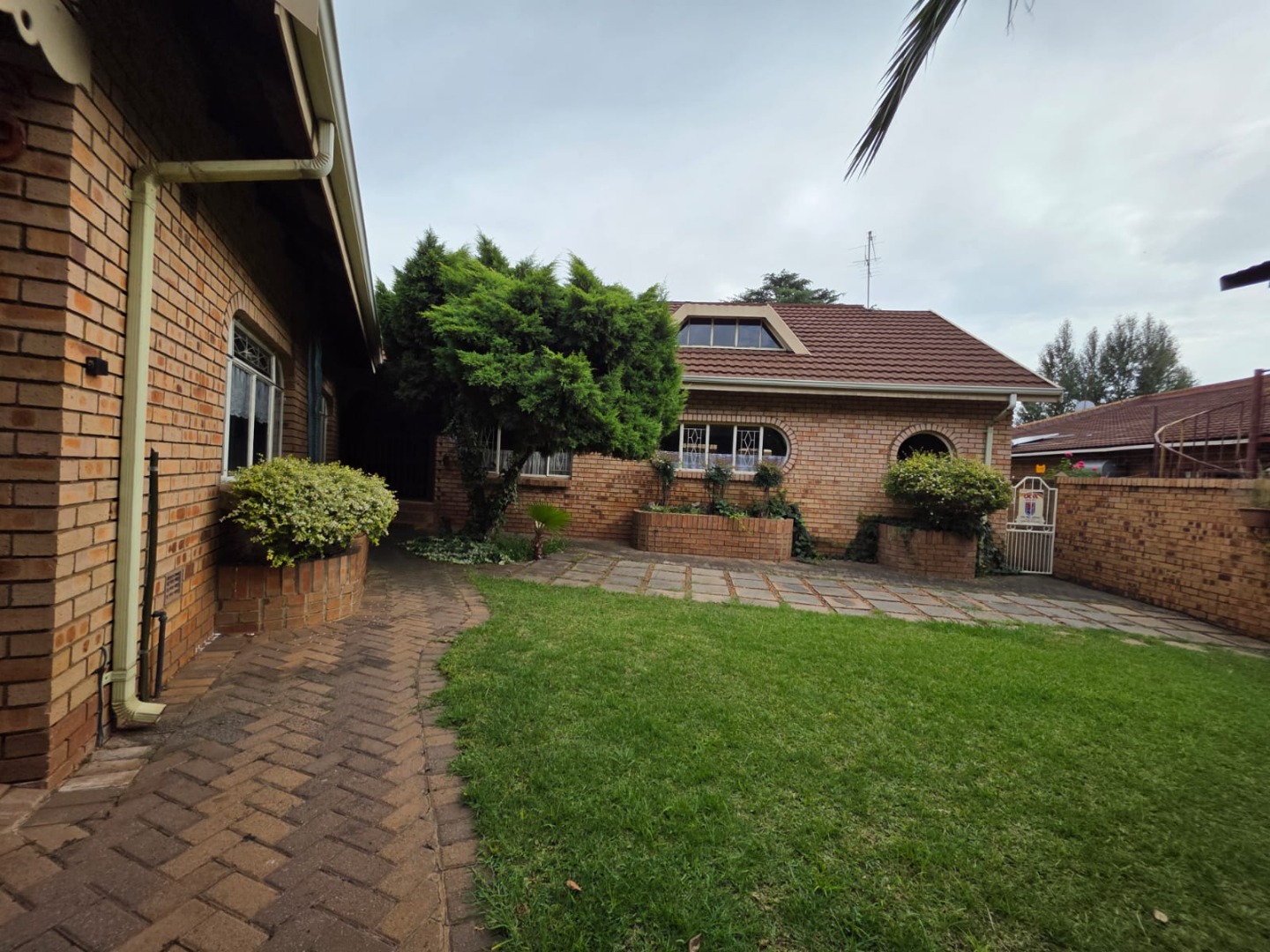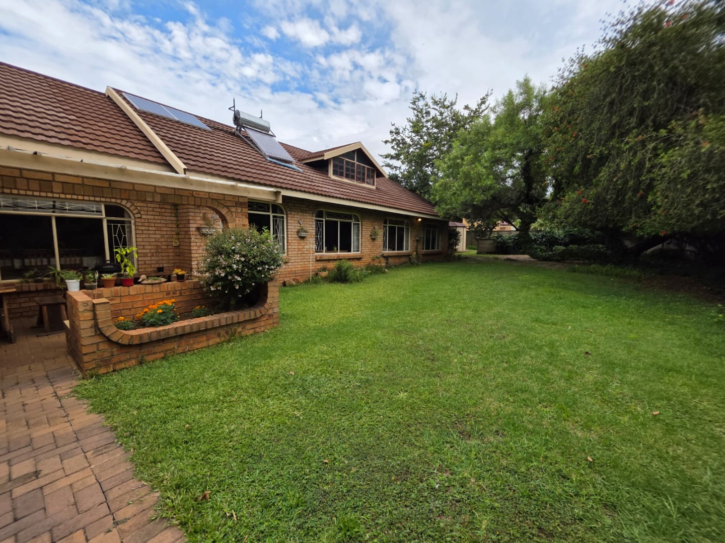 Discover this charming residential property located in the suburban heart of Vanderbijlpark SE 4. This traditional brick home, featuring a durable tiled roof and distinctive architectural elements like round windows, presents a welcoming kerb appeal with its well-maintained lawn, mature trees, and paved pathways. Energy efficiency is enhanced by the presence of solar panels on the roof, contributing to sustainable living.