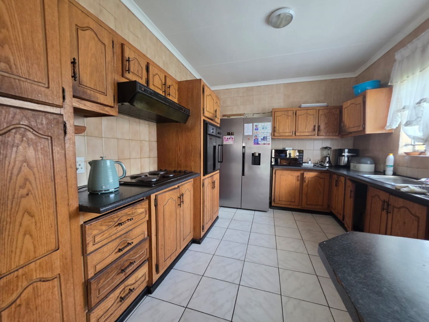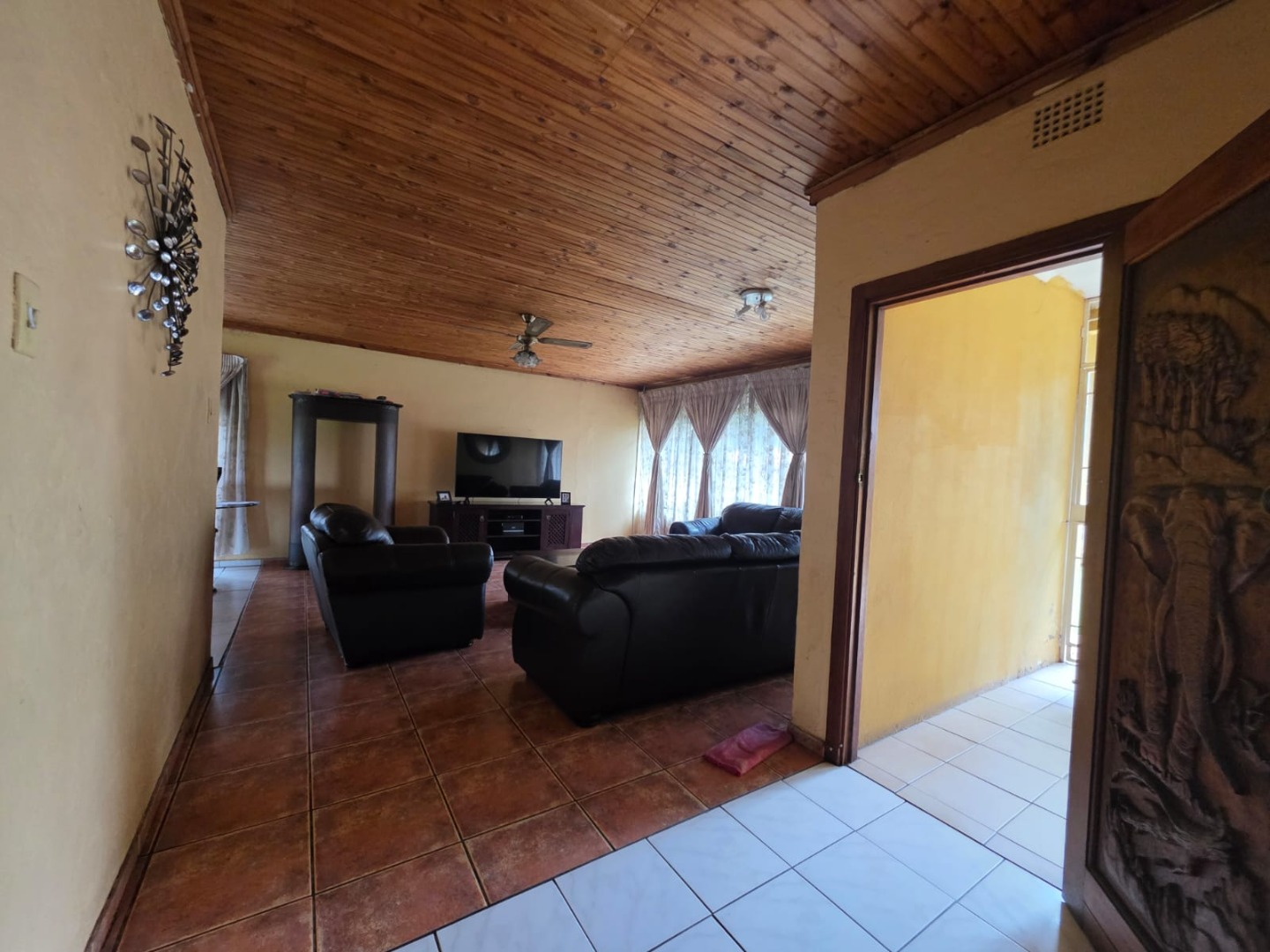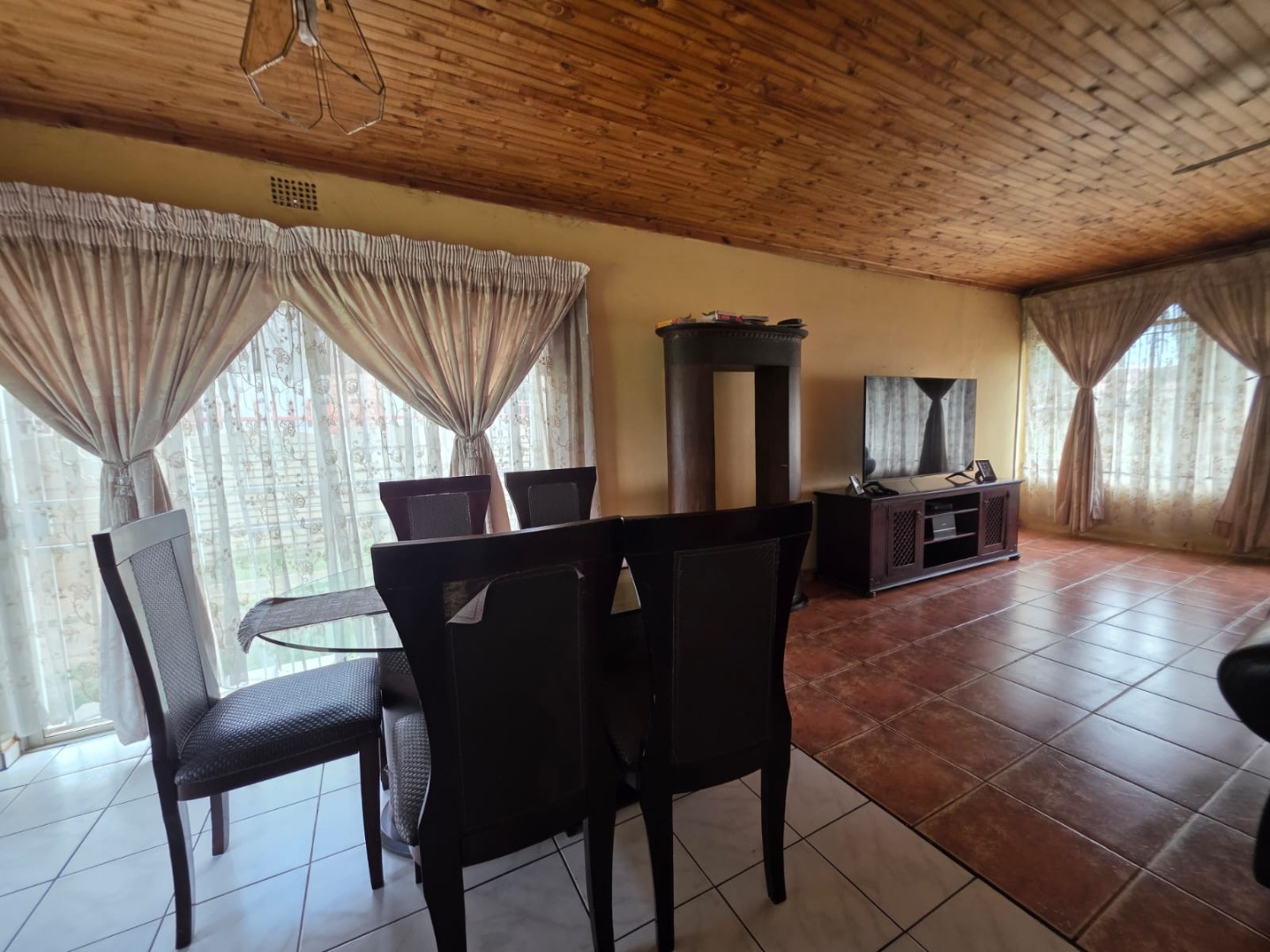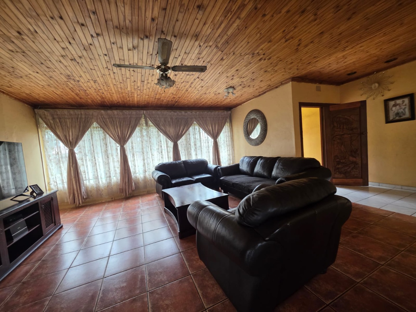 The spacious kitchen features extensive wooden cabinetry, ample counter space, a double sink, and a practical breakfast bar, ideal for casual meals. Adjacent, the dining area, characterized by a rustic wooden slatted ceiling and durable tiled flooring, perfect for entertaining. The main lounge is equally generous, featuring a unique wooden paneled ceiling and large windows, offering a warm and welcoming environment.