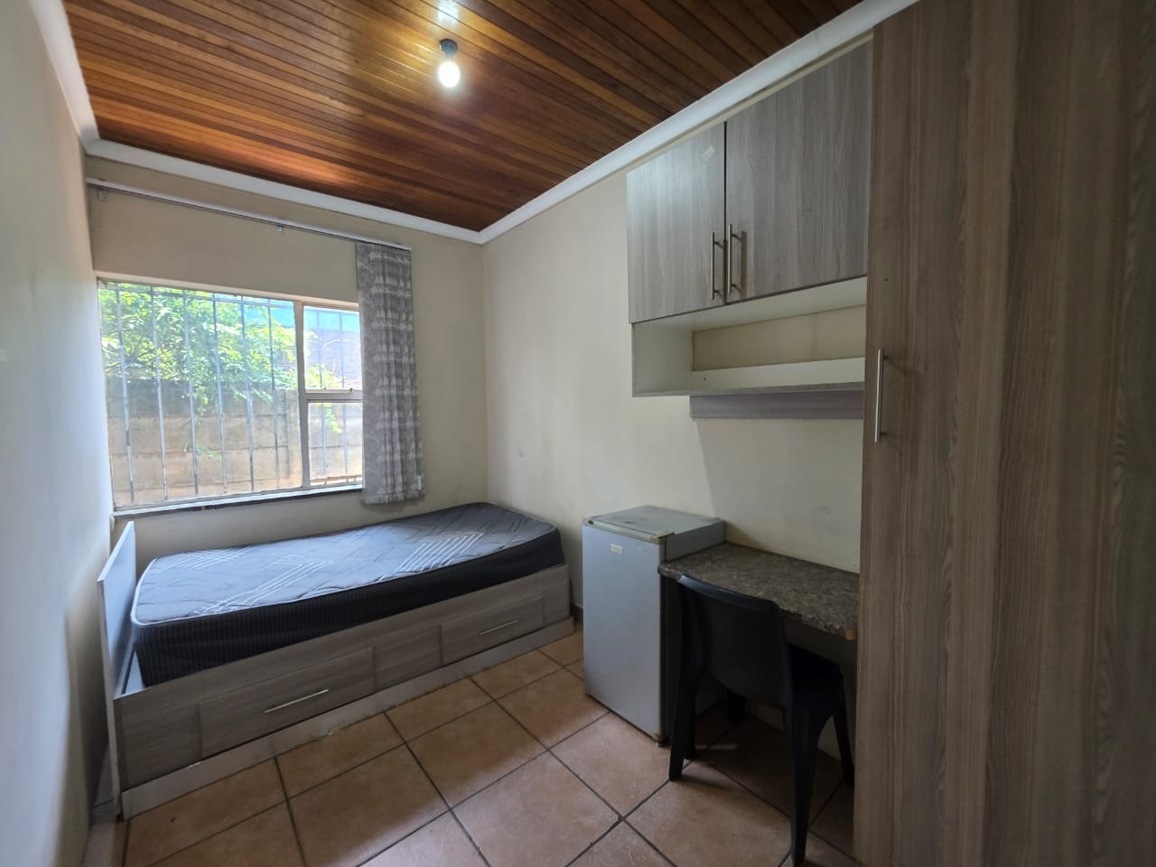 This expansive property features 15 well-appointed bedrooms and 11 bathrooms, designed to comfortably house multiple students. Each room is thoughtfully furnished, including beds with integrated storage, desks, chairs, and built-in cabinetry, ensuring a functional and private living space. Natural light floods through windows, each secured with burglar bars for peace of mind. The property boasts a large, communal kitchen, a central hub for residents. This bright space is equipped with two cooking ranges, a double sink, extensive cabinetry, and L-shaped bench seating, all set on durable tiled floors and walls for easy maintenance. A mounted TV adds to the communal appeal, while security bars on the windows enhance safety.