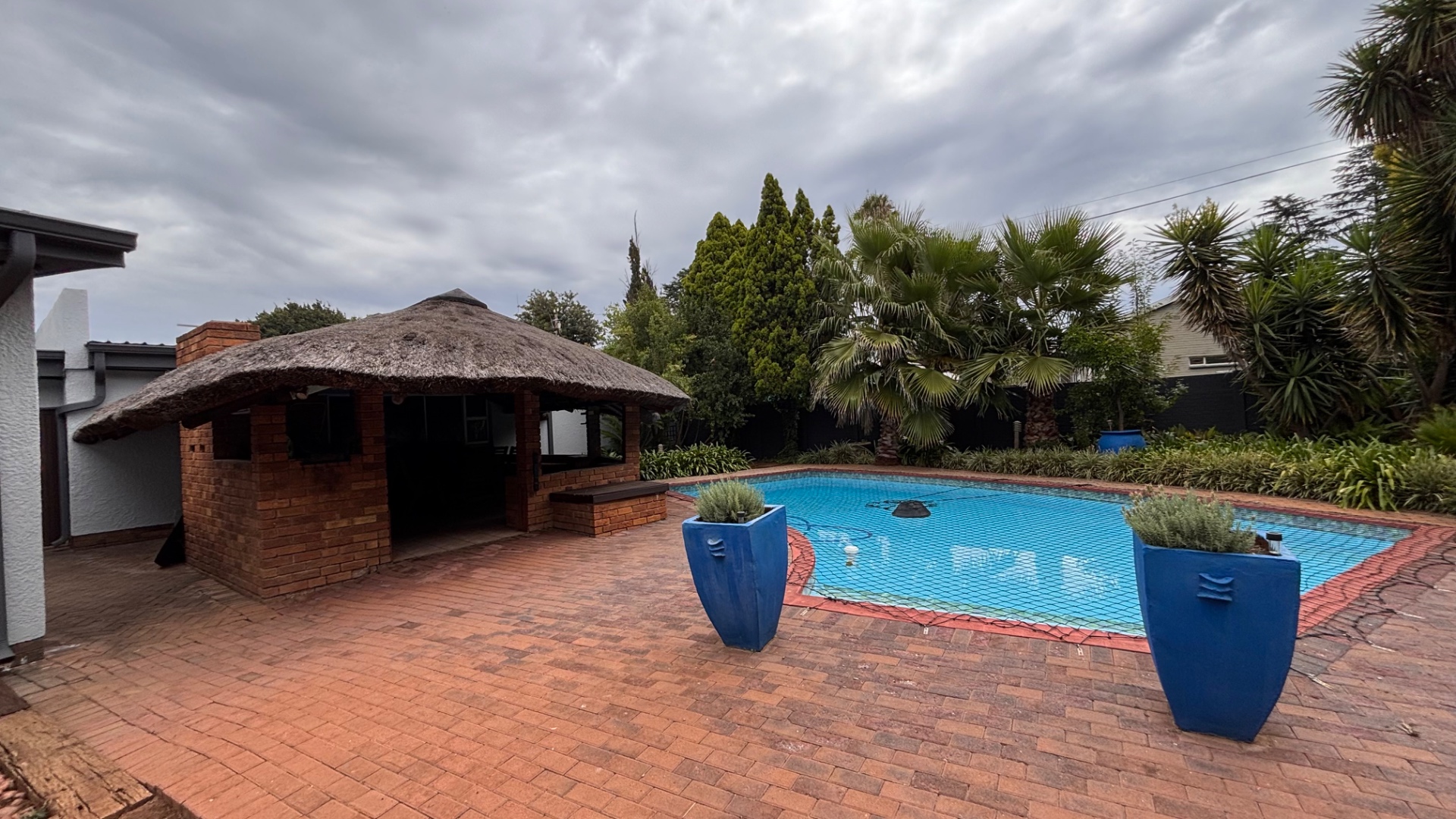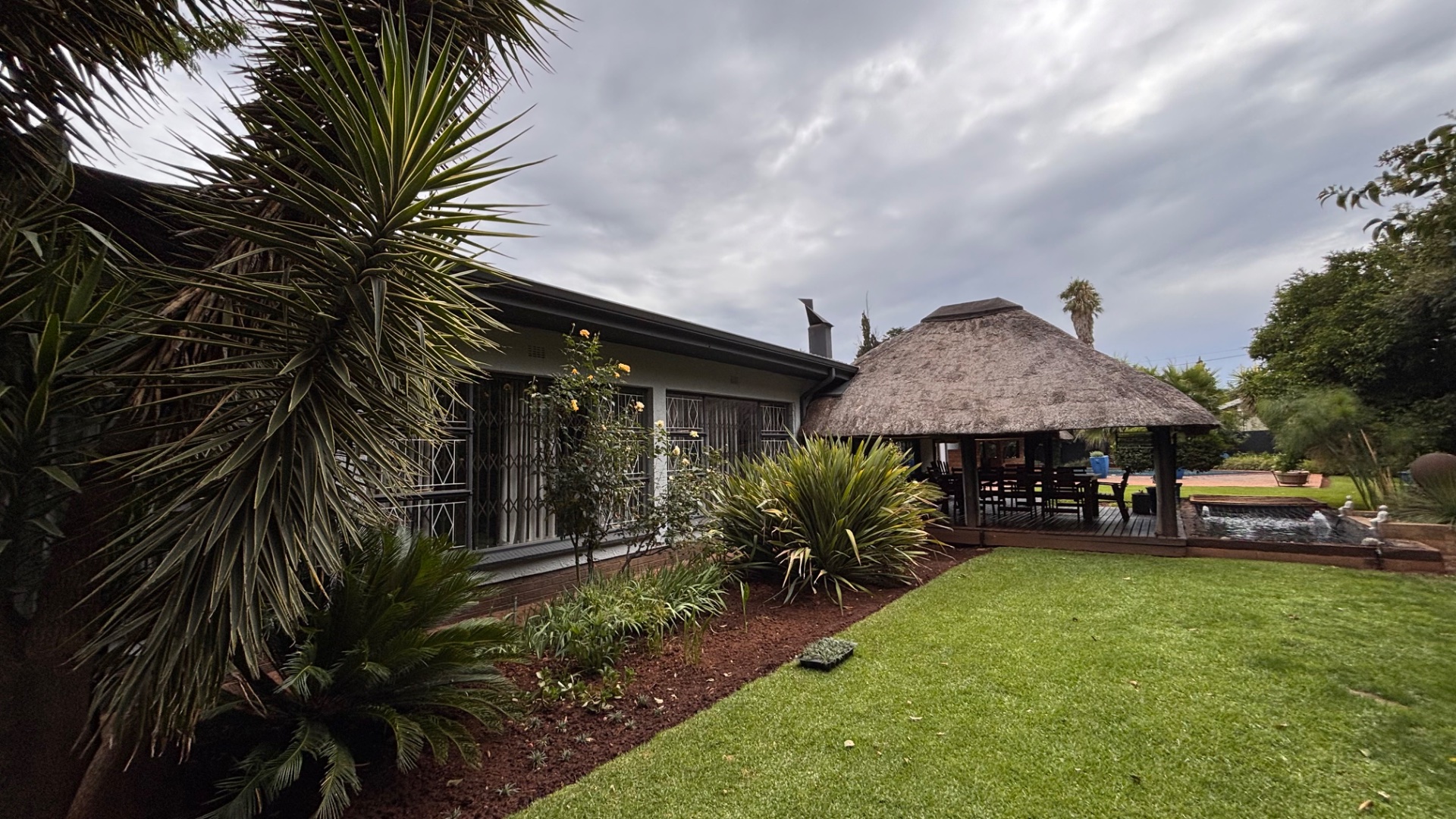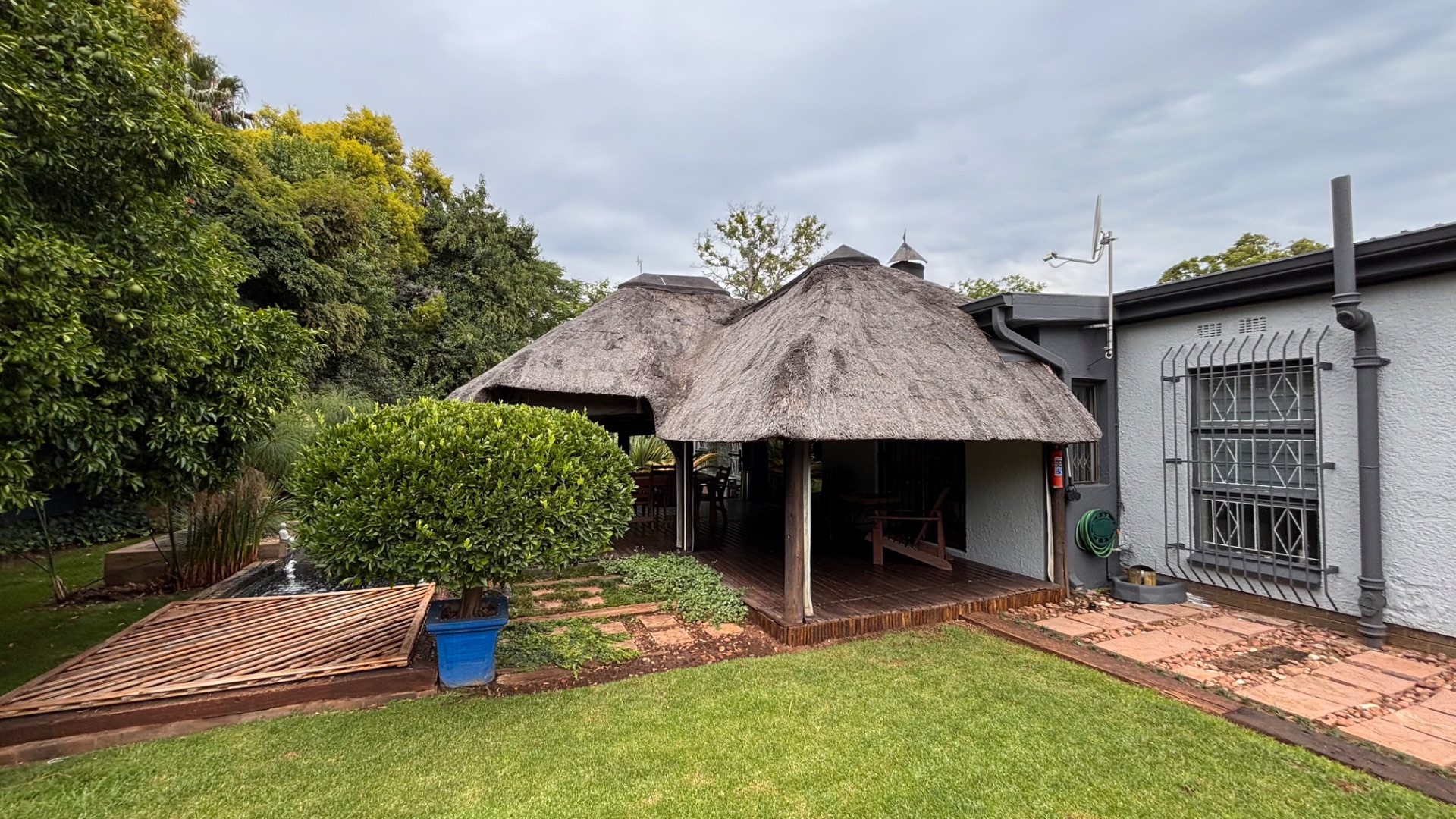 The outdoor spaces are designed for relaxation and entertainment. A lush, well-maintained garden boasts mature trees, a spacious lawn, and a tranquil water feature. The highlight is a charming thatched lapa with a wooden deck, perfect for outdoor entertaining, complete with a built-in braai and a projector. A private swimming pool with a safety net further enhances the leisure options. The property also benefits from four garages and four additional parking spaces.