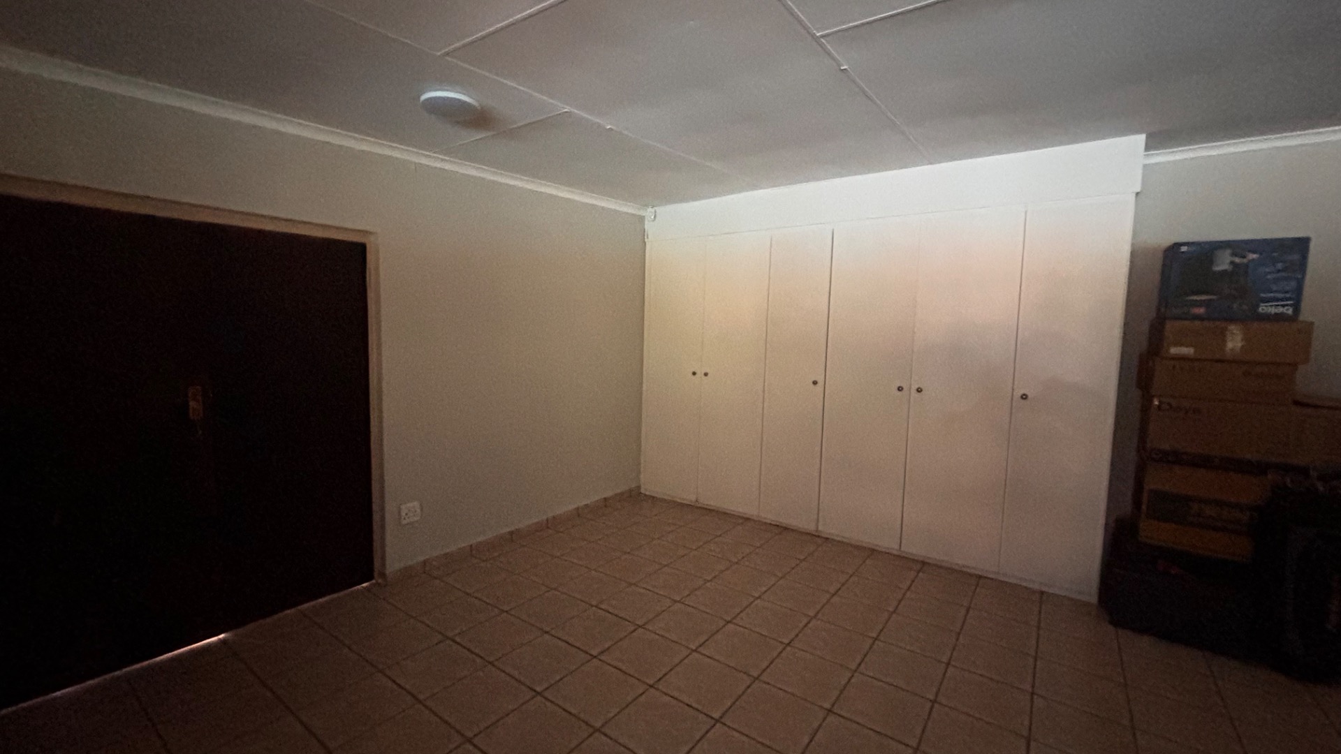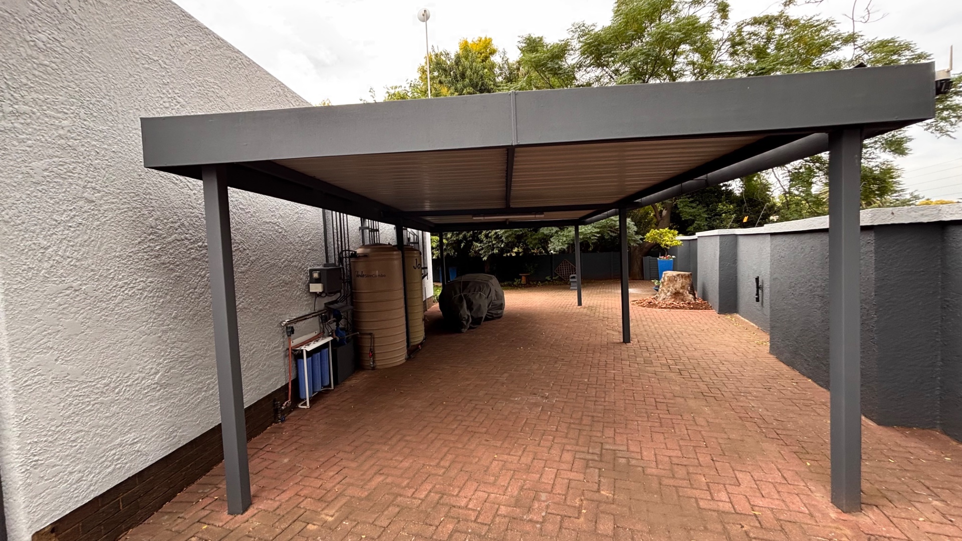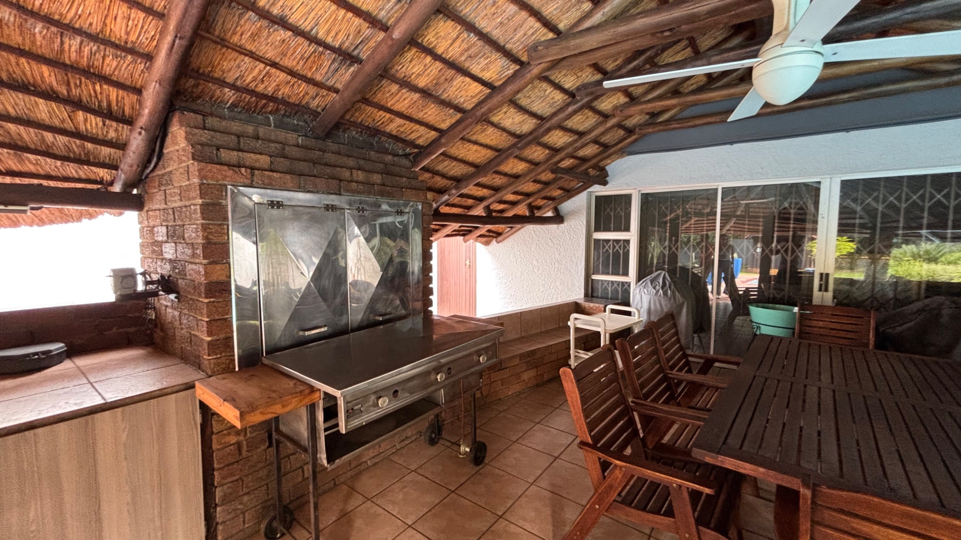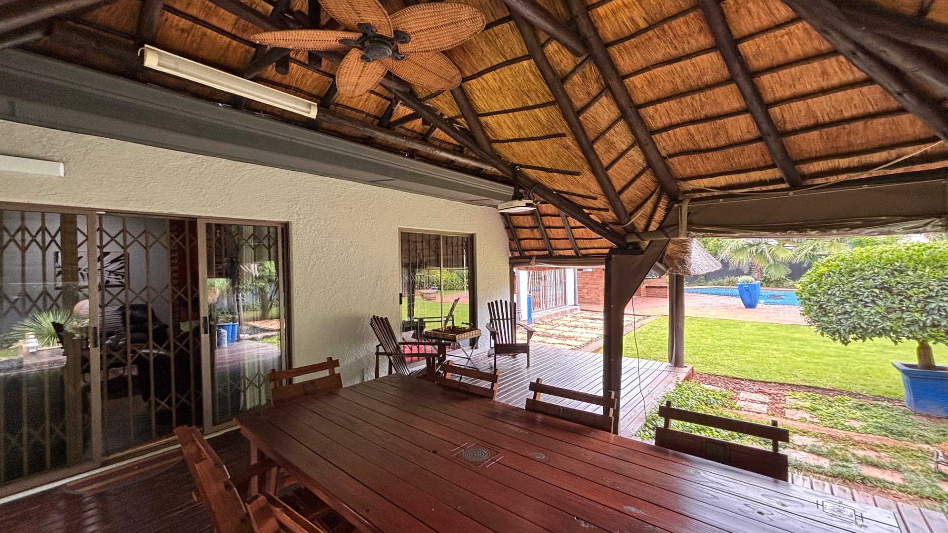 The outdoor spaces are designed for relaxation and entertainment. A lush, well-maintained garden boasts mature trees, a spacious lawn, and a tranquil water feature. The highlight is a charming thatched lapa with a wooden deck, perfect for outdoor entertaining, complete with a built-in braai and a projector. A private swimming pool with a safety net further enhances the leisure options. The property also benefits from four garages and four additional parking spaces.