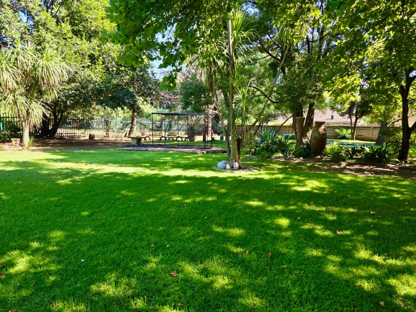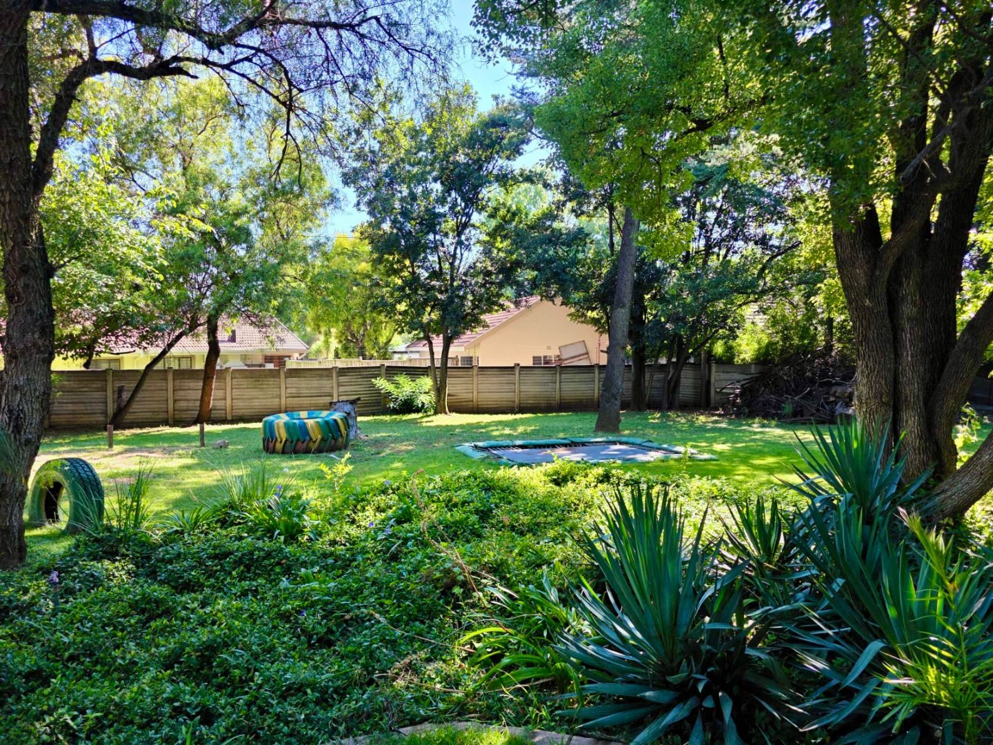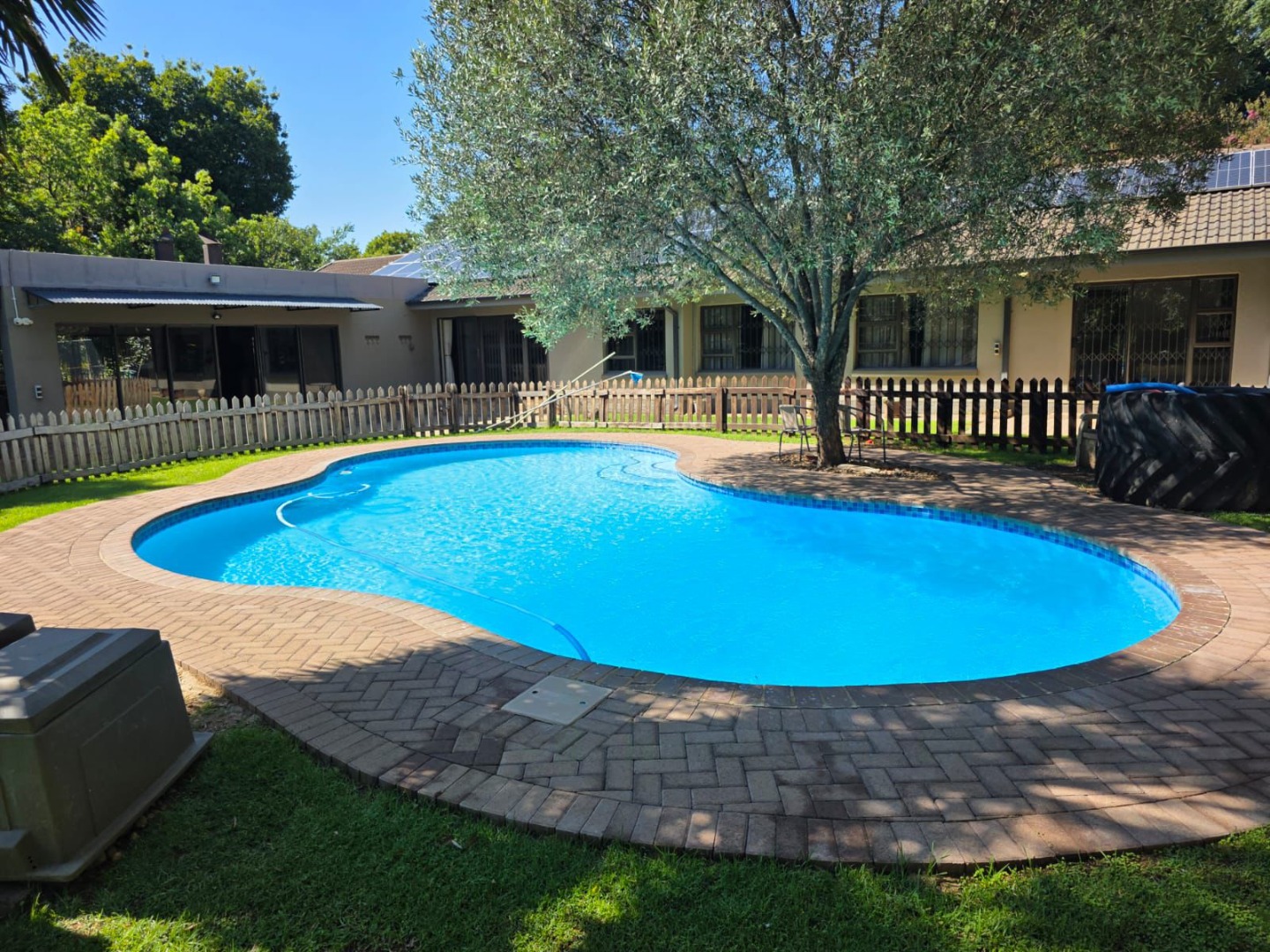 Step outside to a private oasis designed for relaxation and recreation. The property features a sparkling swimming pool, perfect for cooling off during warm South African days. The large, manicured garden is adorned with mature trees providing natural shade, an irrigation system, and paved areas. Family-friendly elements such as a sunken trampoline are visible, enhancing the outdoor lifestyle. Parking is well catered for with two lock up garages and two additional parking spaces.