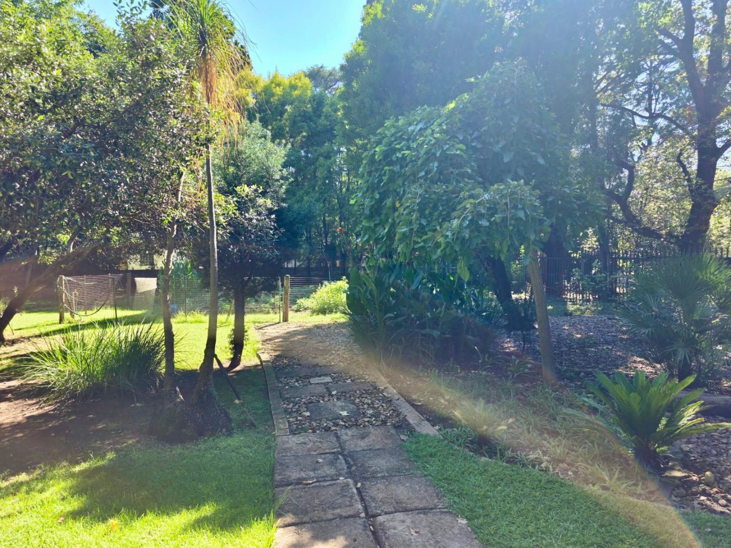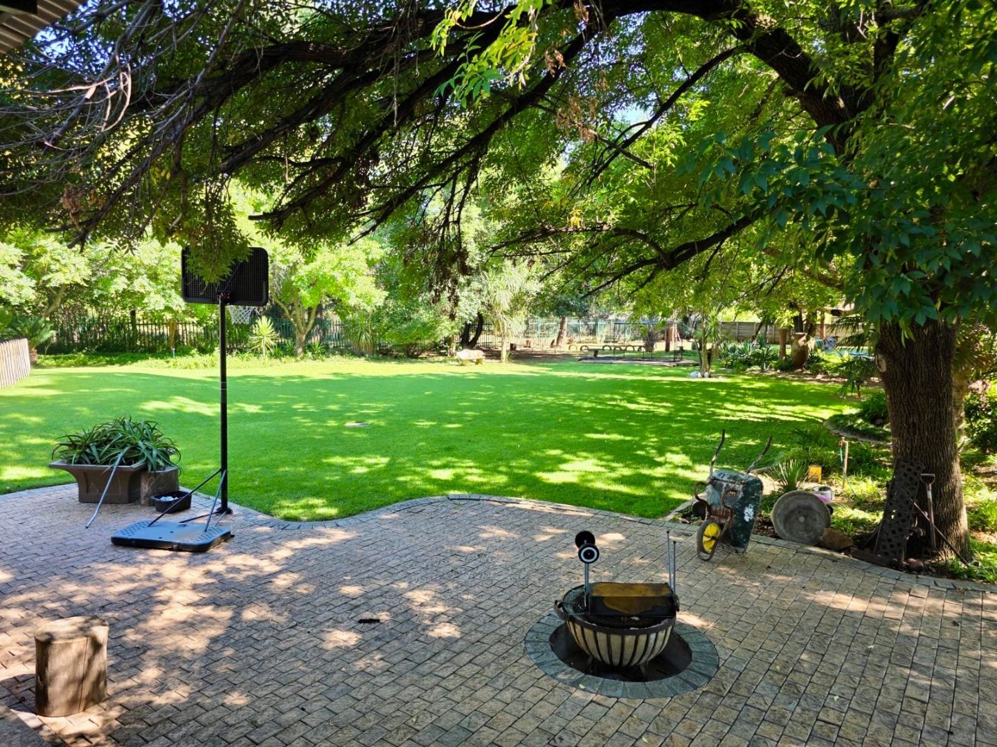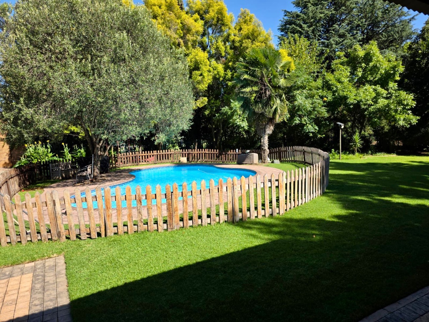 Step outside to a private oasis designed for relaxation and recreation. The property features a sparkling swimming pool, perfect for cooling off during warm South African days. The large, manicured garden is adorned with mature trees providing natural shade, an irrigation system, and paved areas. Family-friendly elements such as a sunken trampoline are visible, enhancing the outdoor lifestyle. Parking is well catered for with two lock up garages and two additional parking spaces.