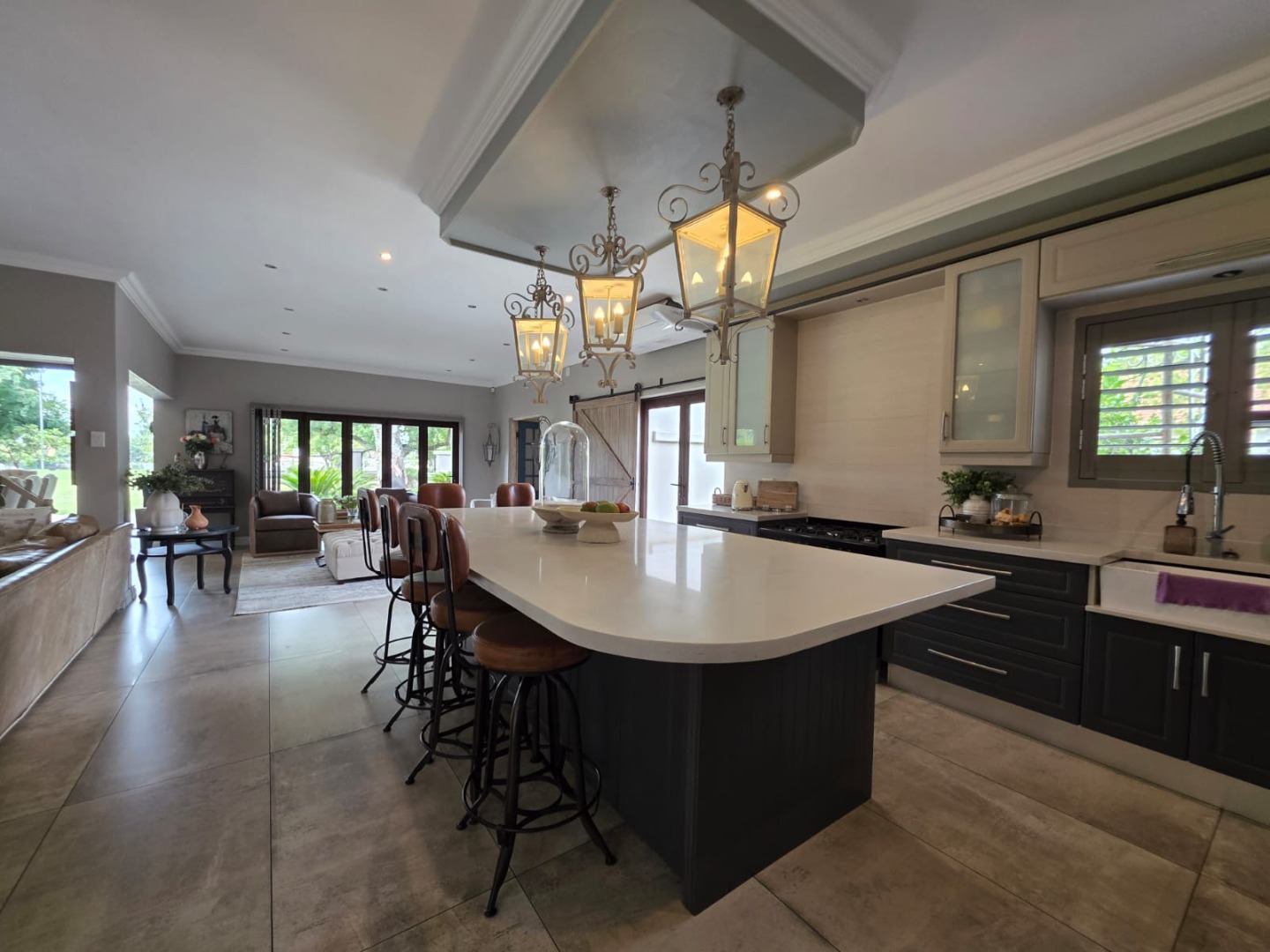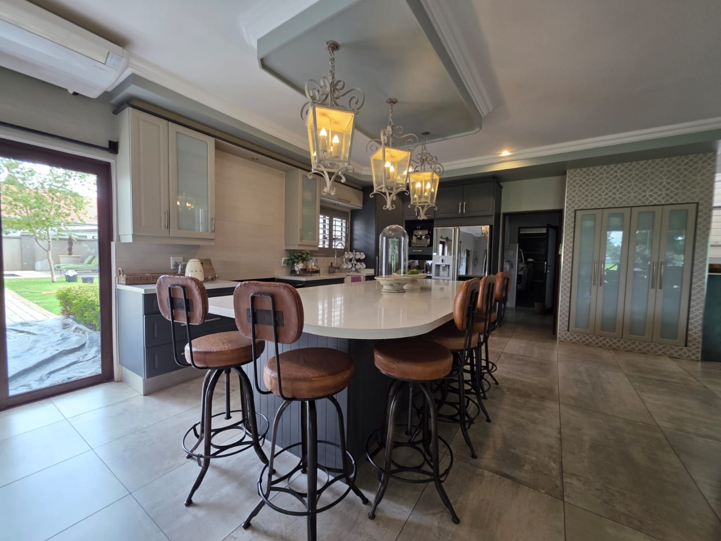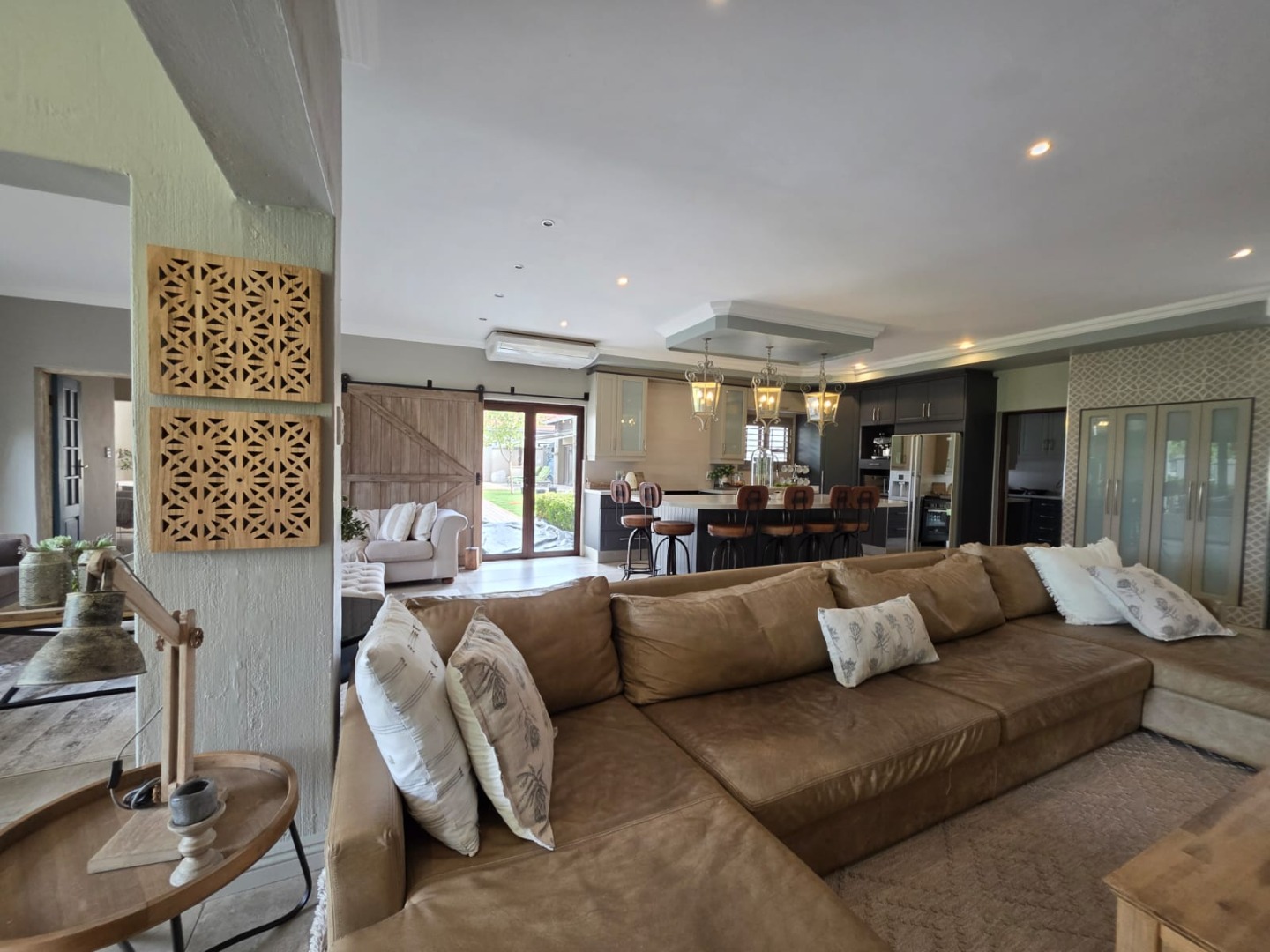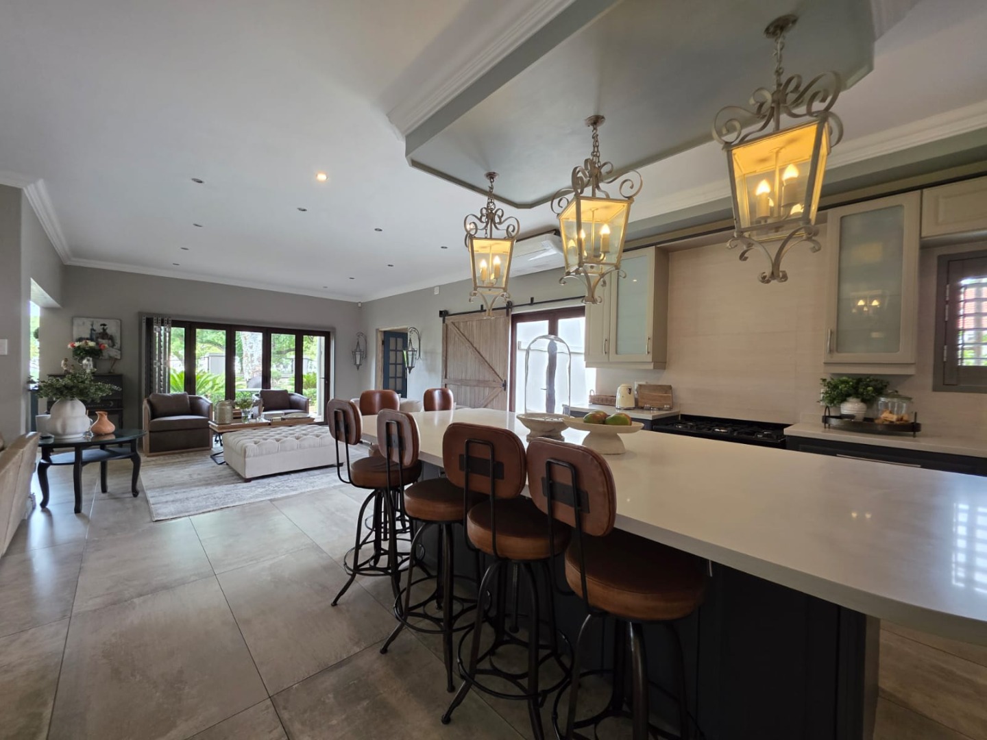 Step inside to discover an expansive open-plan layout, seamlessly connecting the living and dining areas. The home boasts four lounges and a dedicated dining room, providing ample space for relaxation and entertaining. The modern kitchen is a highlight, featuring a large island with seating, a gas stove, and stylish cabinetry. Large glass doors ensure abundant natural light and create a fluid transition to the outdoor spaces, complemented by quality tiled flooring and recessed lighting.