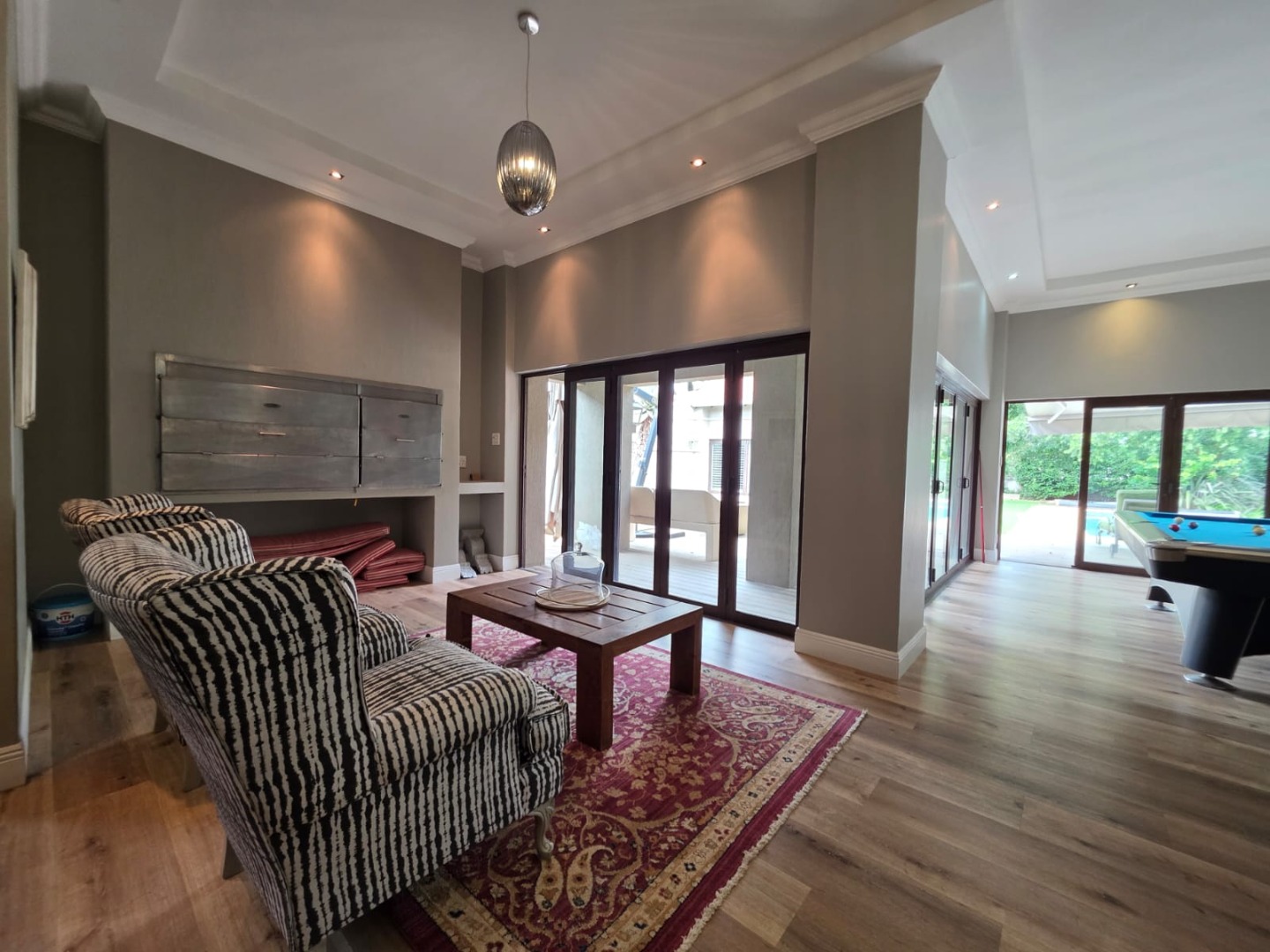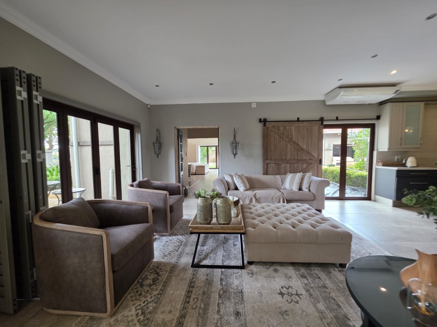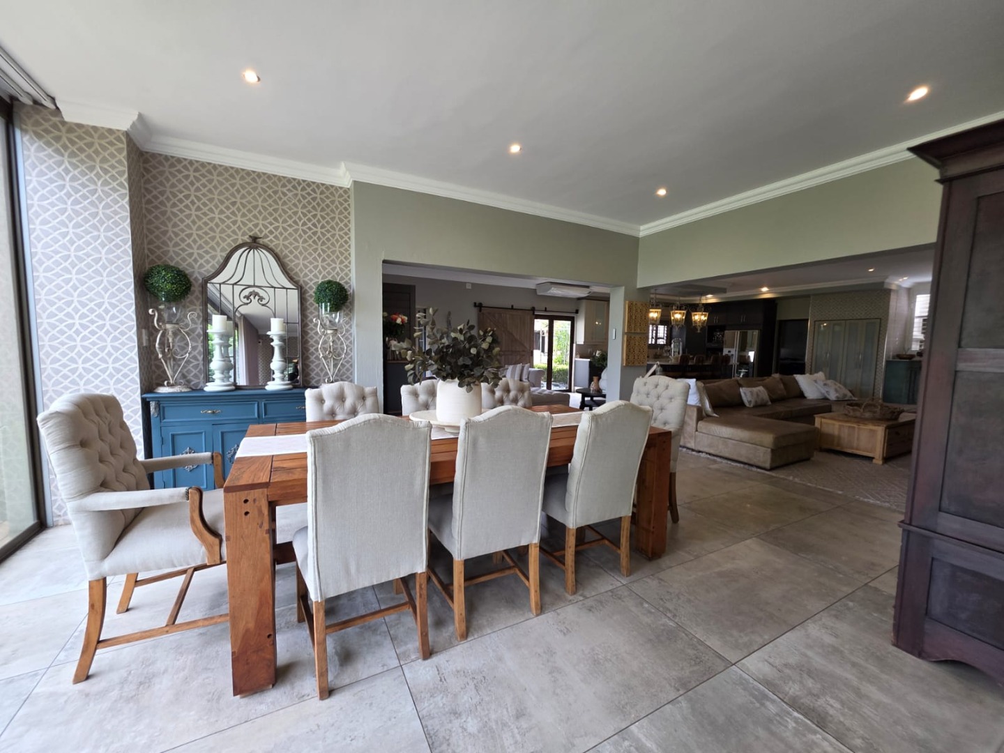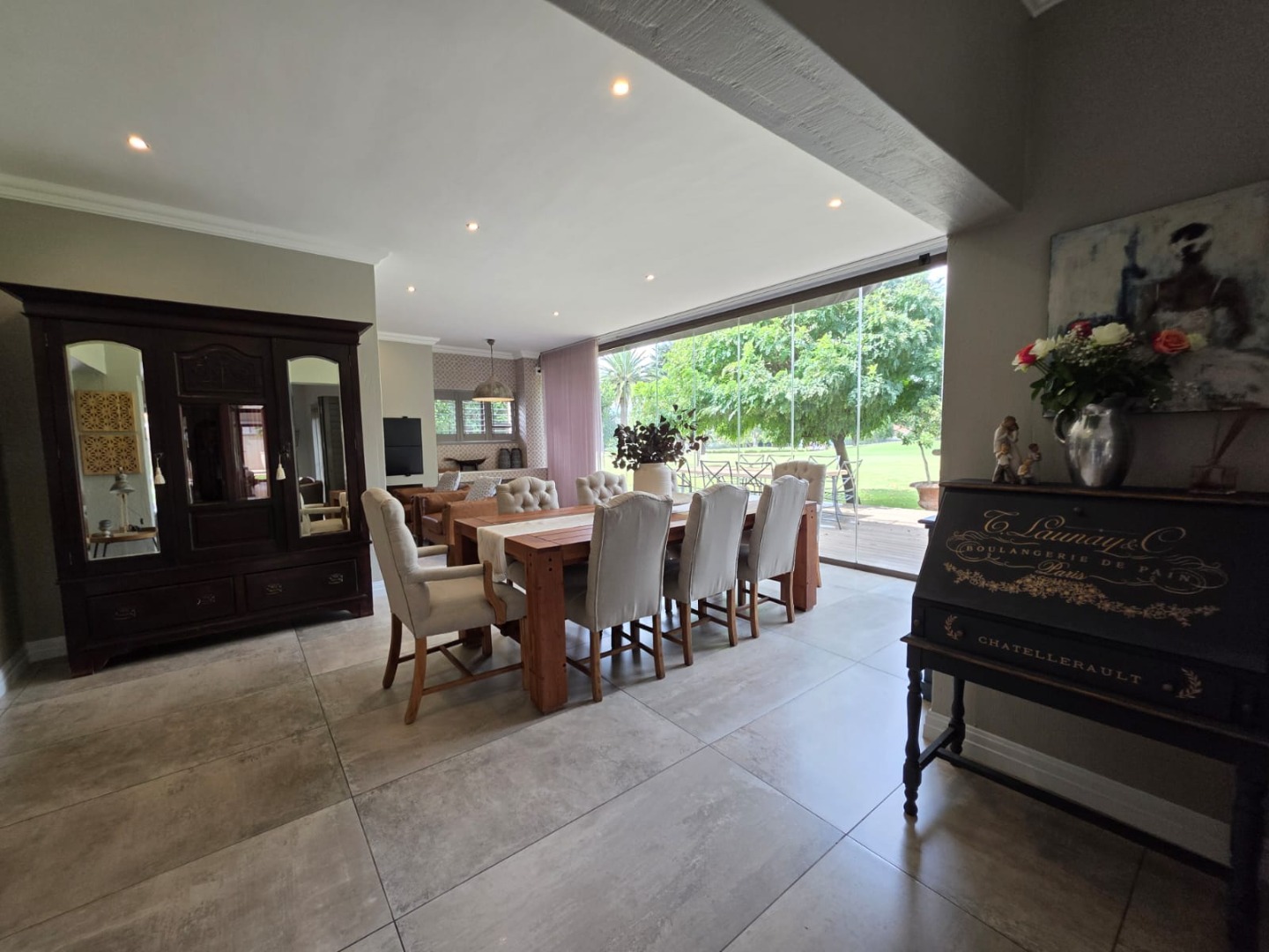 Step inside to discover an expansive open-plan layout, seamlessly connecting the living and dining areas. The home boasts four lounges and a dedicated dining room, providing ample space for relaxation and entertaining. The modern kitchen is a highlight, featuring a large island with seating, a gas stove, and stylish cabinetry. Large glass doors ensure abundant natural light and create a fluid transition to the outdoor spaces, complemented by quality tiled flooring and recessed lighting.
