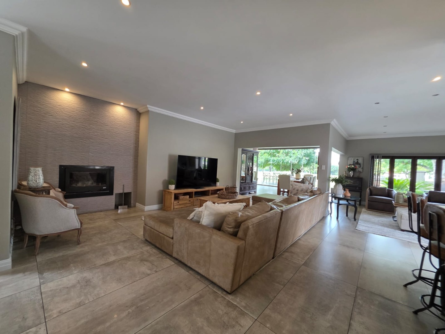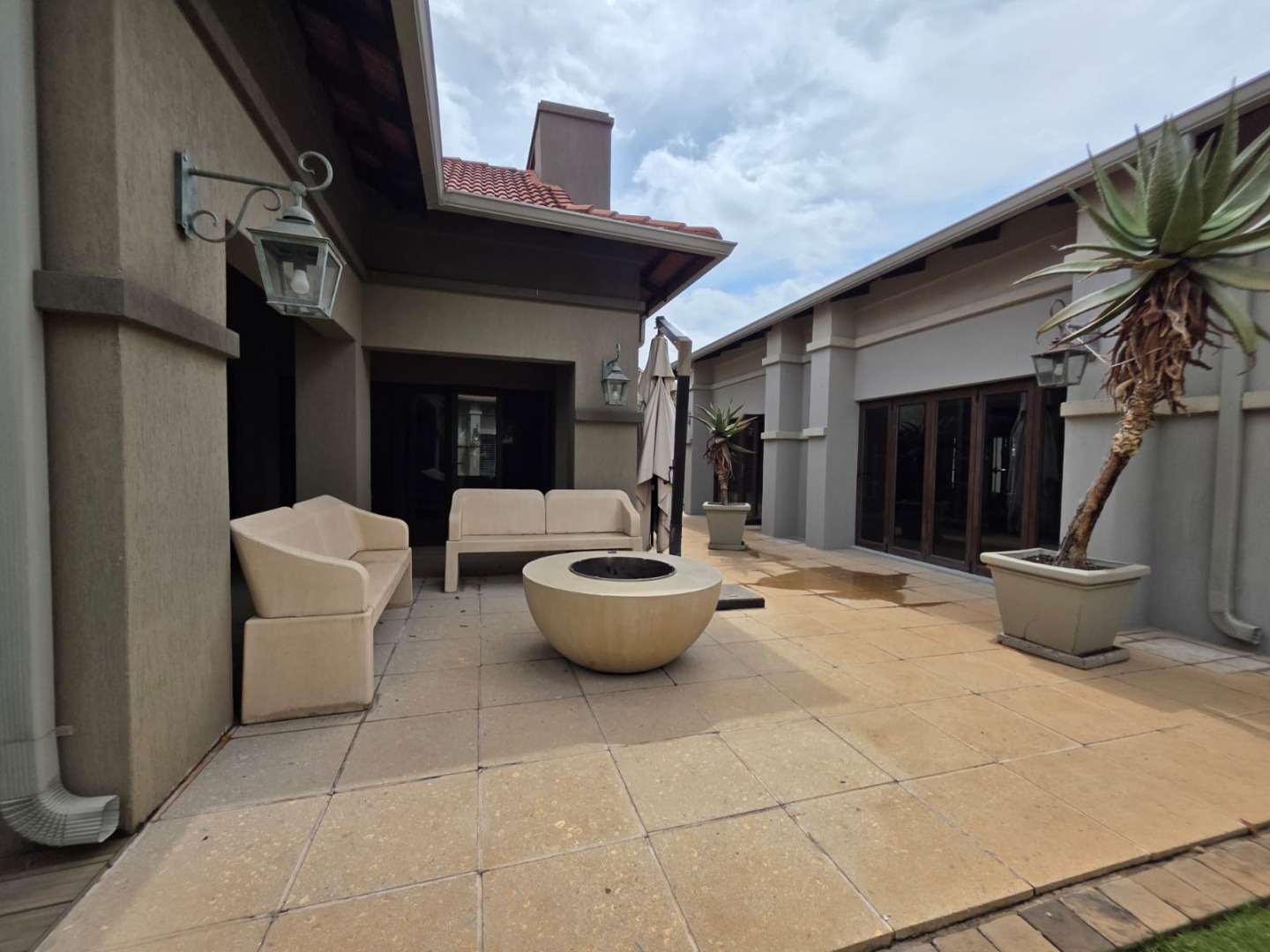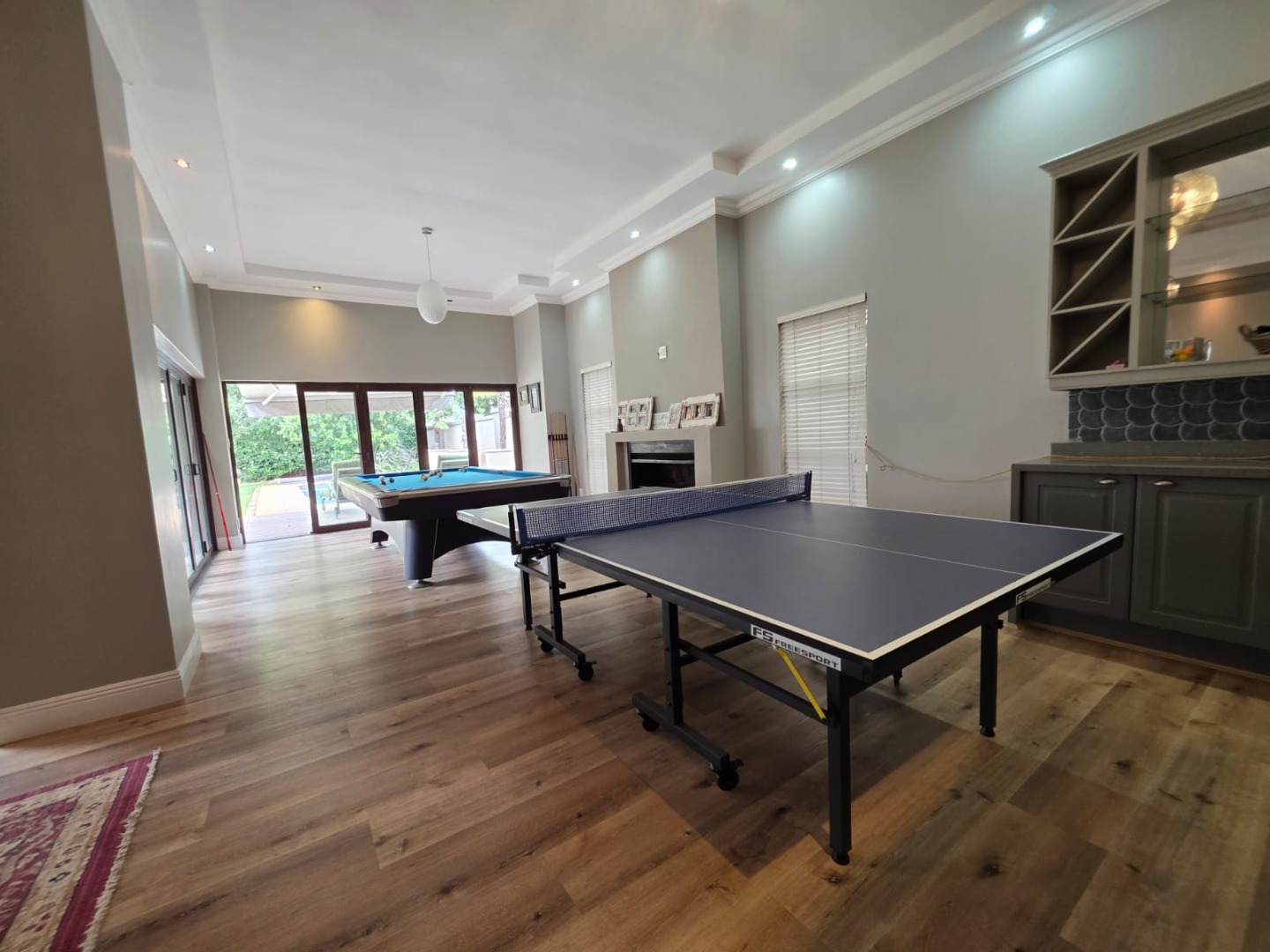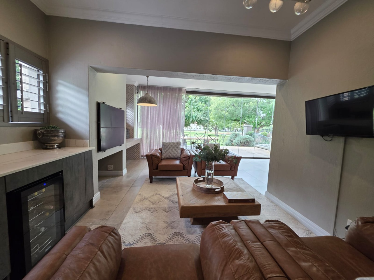 The outdoor areas are designed for ultimate enjoyment. A private swimming pool, complete with a wooden deck and retractable awning, provides a perfect setting for leisure. The spacious patio features built-in seating and a central fire pit, ideal for social gatherings. Enjoy scenic views from the balcony, enhancing the indoor-outdoor living experience. Amenities include a private gym, 2 built-in braais (1 wood and 1 gas) as well as a winter braai room and a wine room, a cozy fireplace, and three garages, ensuring convenience and luxury.