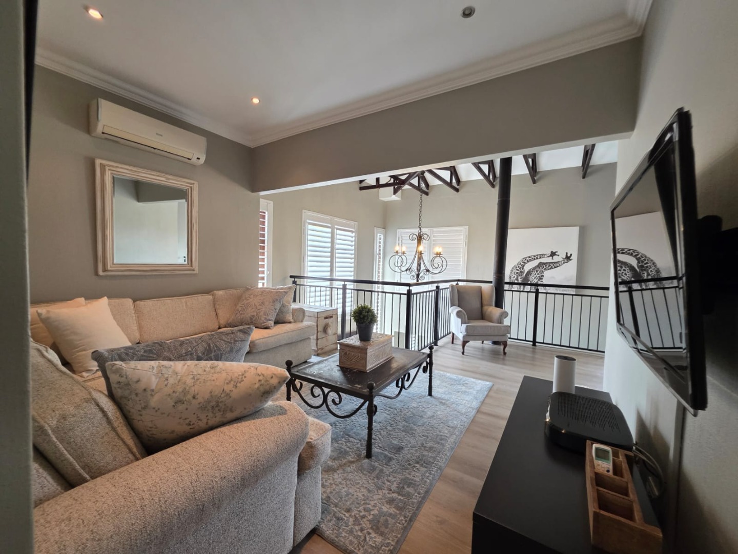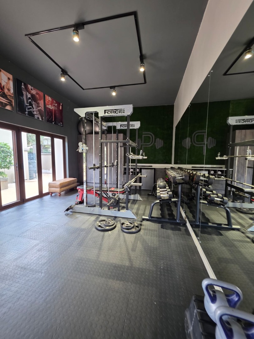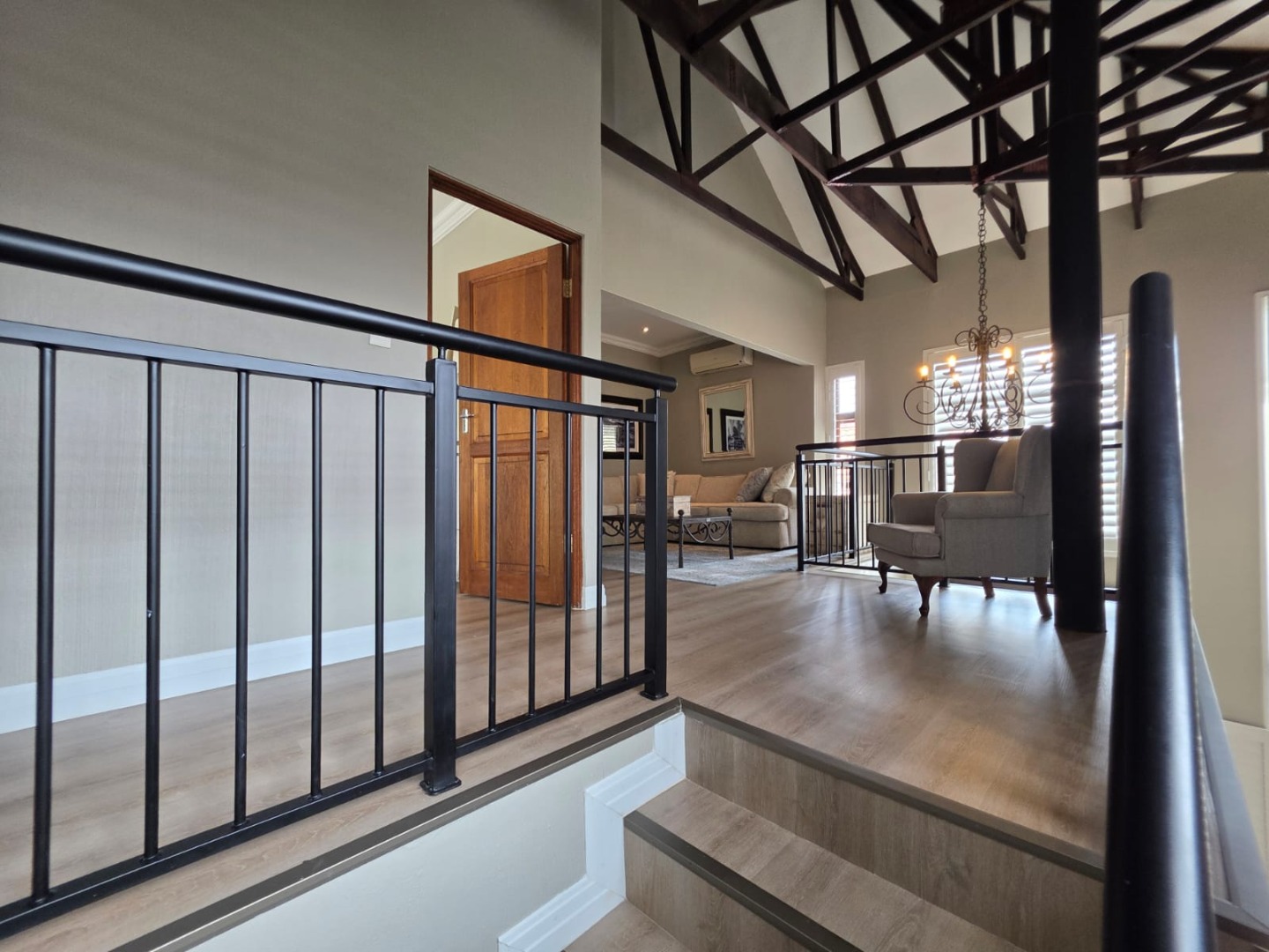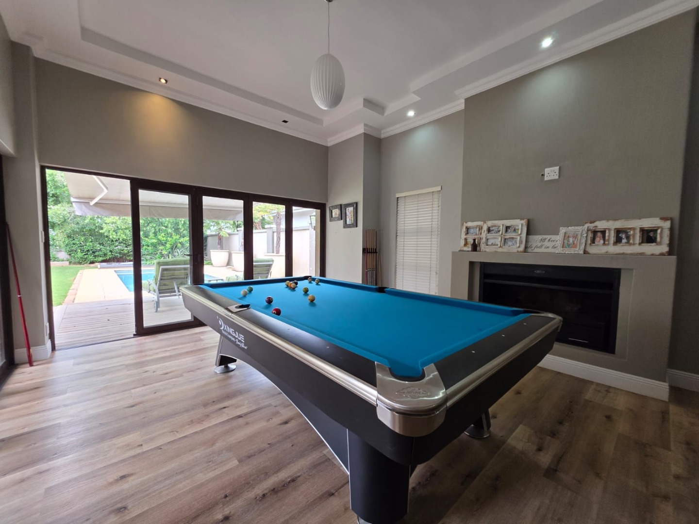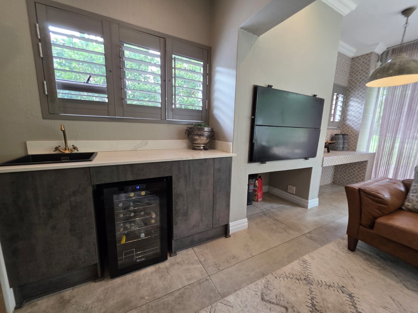 The outdoor areas are designed for ultimate enjoyment. A private swimming pool, complete with a wooden deck and retractable awning, provides a perfect setting for leisure. The spacious patio features built-in seating and a central fire pit, ideal for social gatherings. Enjoy scenic views from the balcony, enhancing the indoor-outdoor living experience. Amenities include a private gym, 2 built-in braais (1 wood and 1 gas) as well as a winter braai room and a wine room, a cozy fireplace, and three garages, ensuring convenience and luxury.