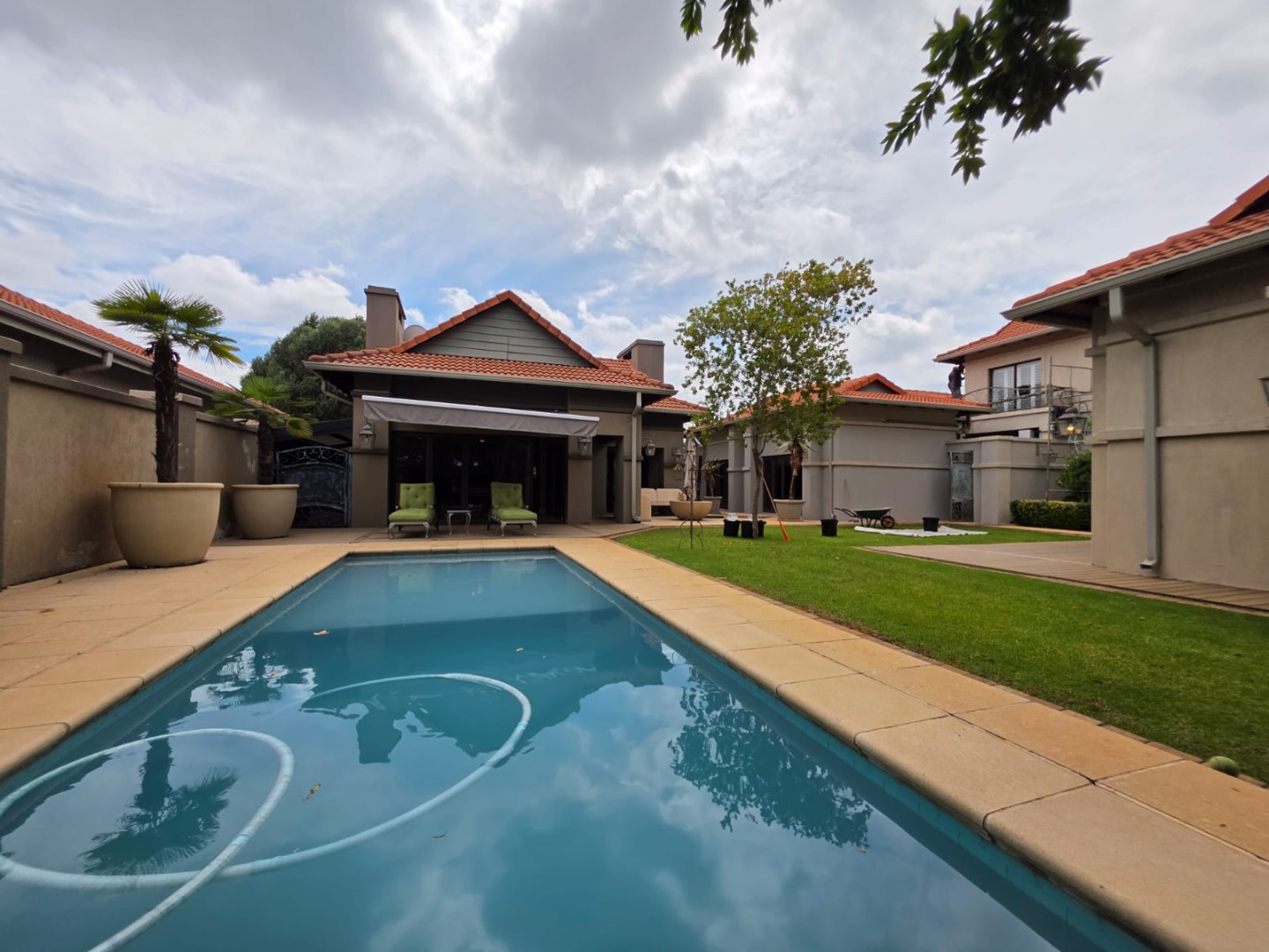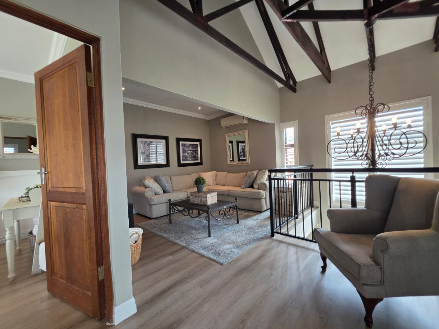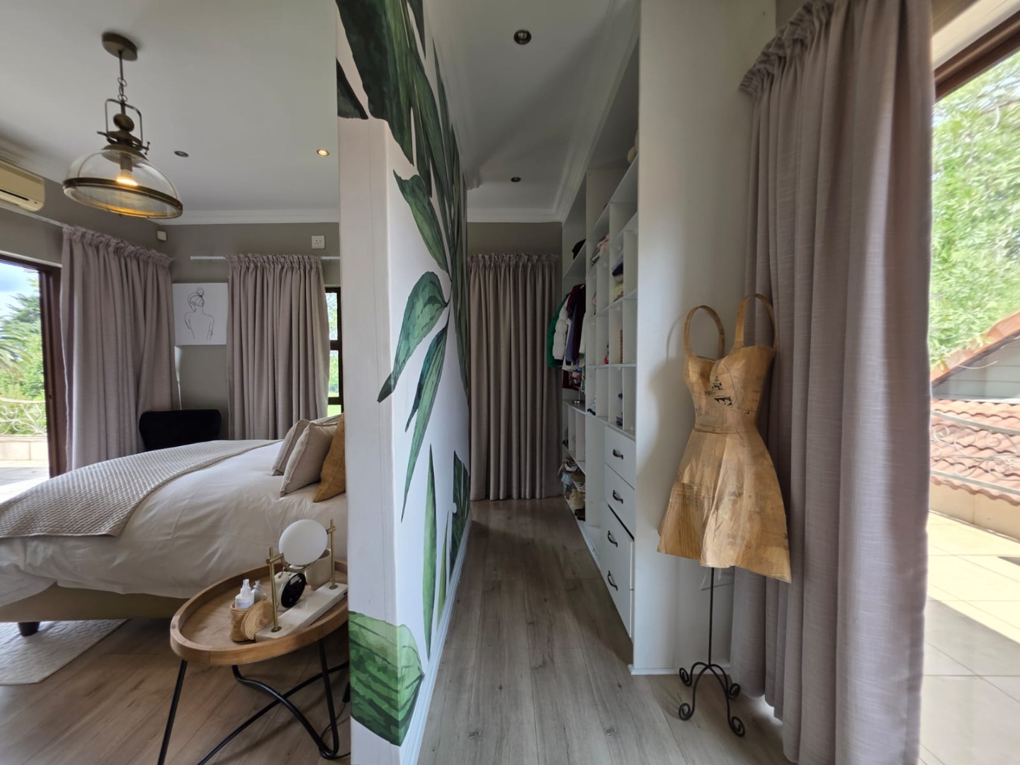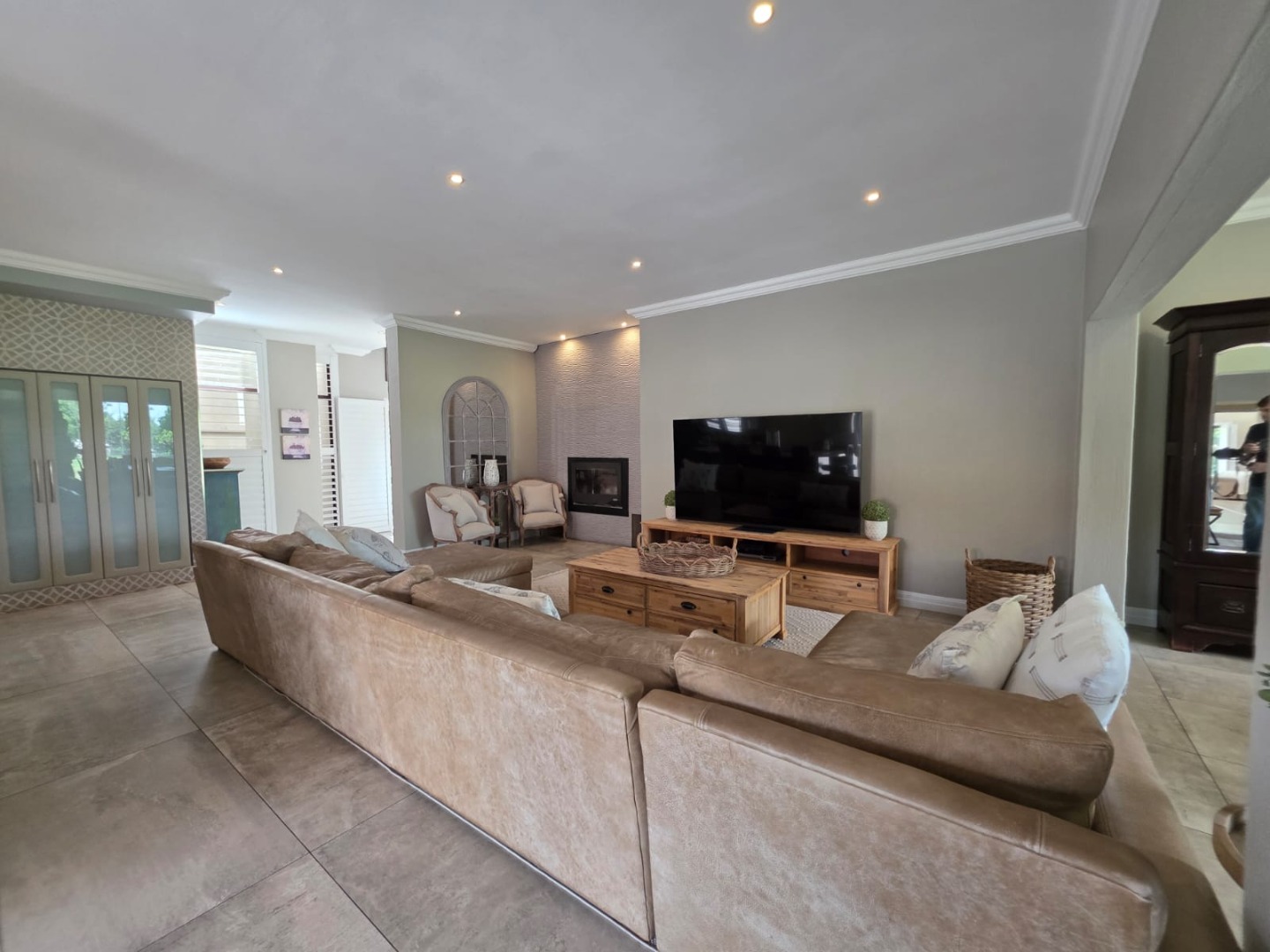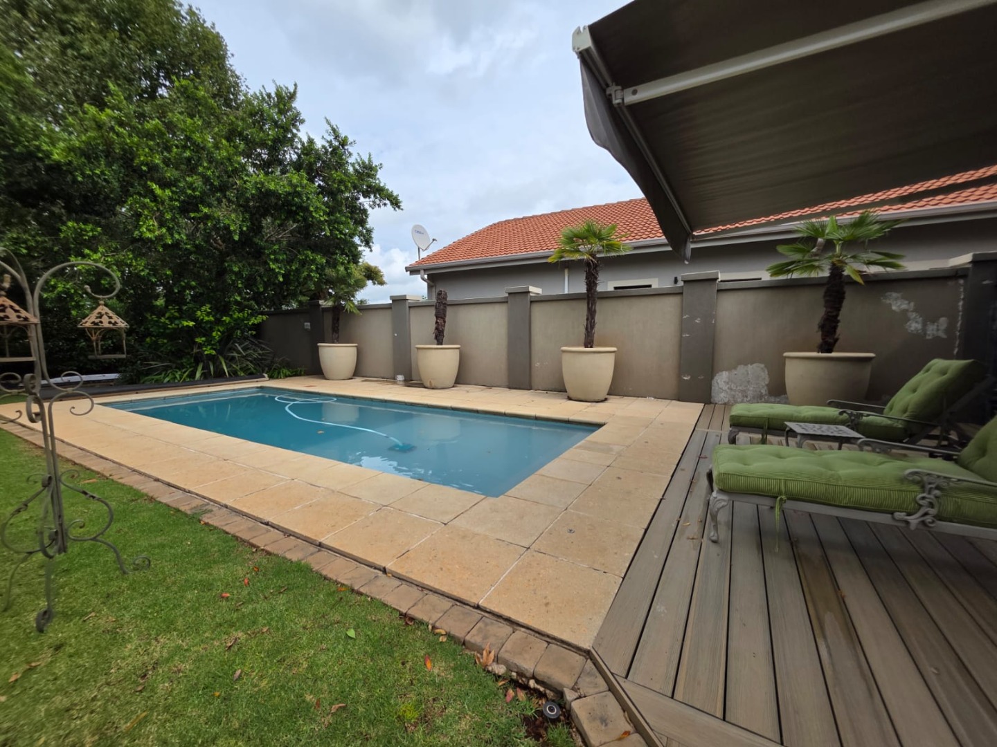 The outdoor areas are designed for ultimate enjoyment. A private swimming pool, complete with a wooden deck and retractable awning, provides a perfect setting for leisure. The spacious patio features built-in seating and a central fire pit, ideal for social gatherings. Enjoy scenic views from the balcony, enhancing the indoor-outdoor living experience. Amenities include a private gym, 2 built-in braais (1 wood and 1 gas) as well as a winter braai room and a wine room, a cozy fireplace, and three garages, ensuring convenience and luxury.