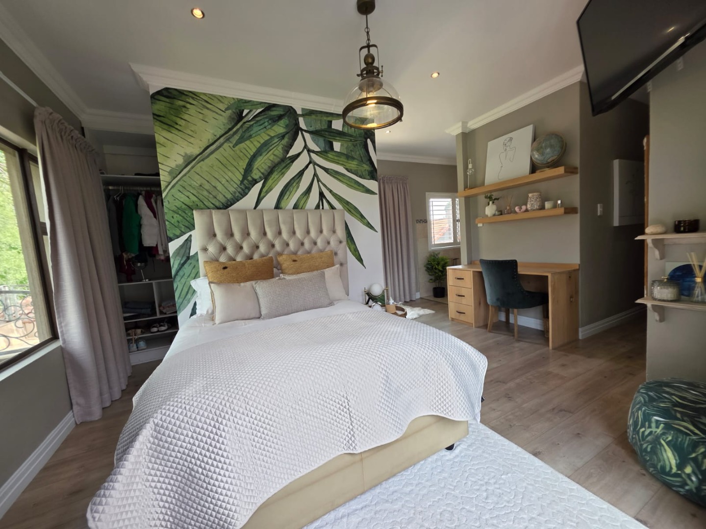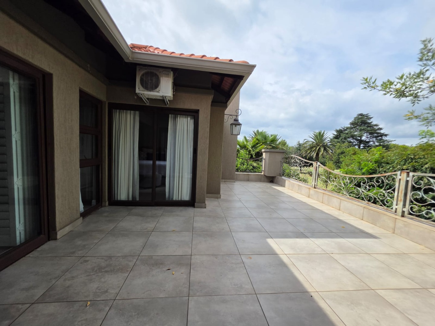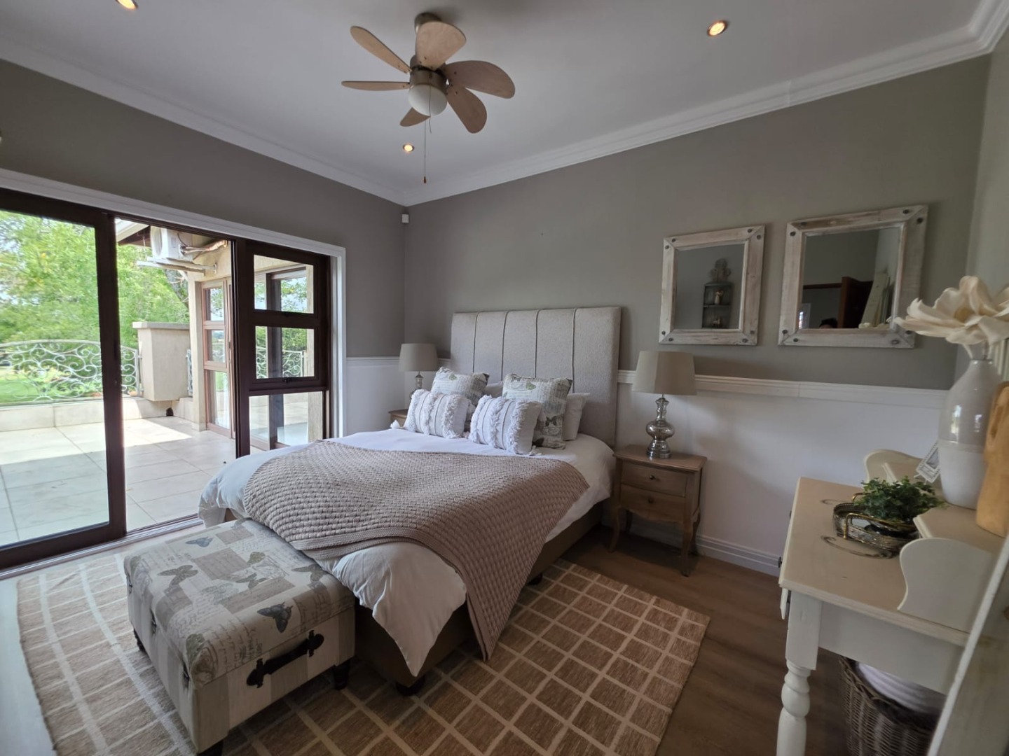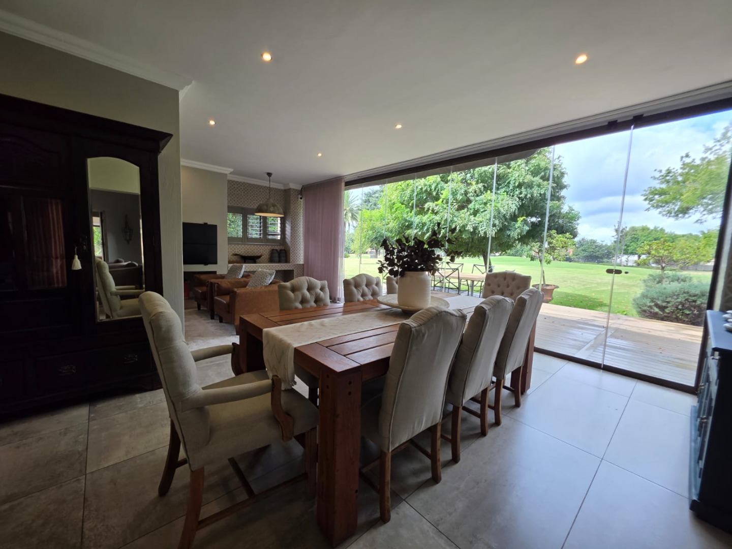 The outdoor areas are designed for ultimate enjoyment. A private swimming pool, complete with a wooden deck and retractable awning, provides a perfect setting for leisure. The spacious patio features built-in seating and a central fire pit, ideal for social gatherings. Enjoy scenic views from the balcony, enhancing the indoor-outdoor living experience. Amenities include a private gym, 2 built-in braais (1 wood and 1 gas) as well as a winter braai room and a wine room, a cozy fireplace, and three garages, ensuring convenience and luxury.