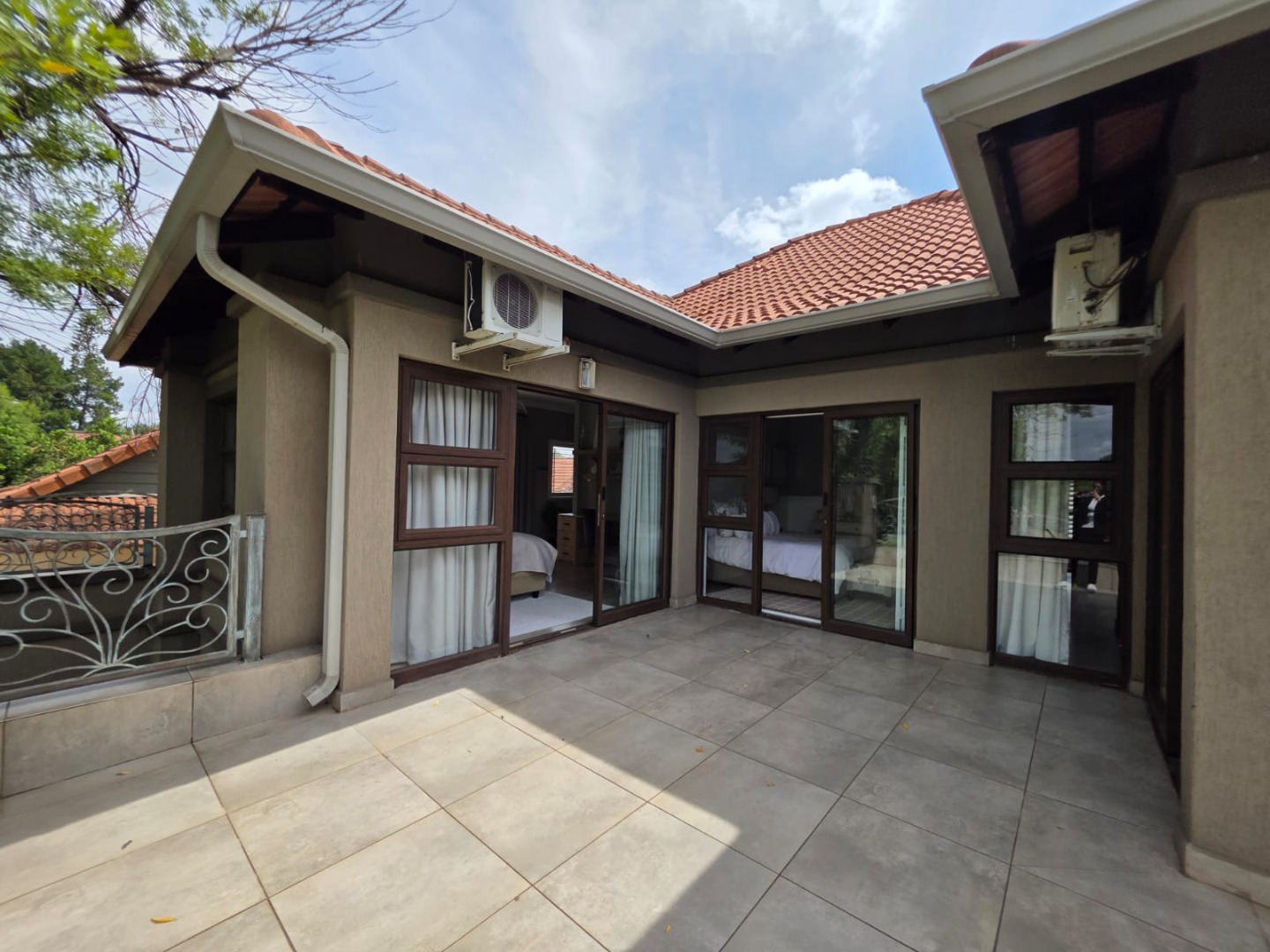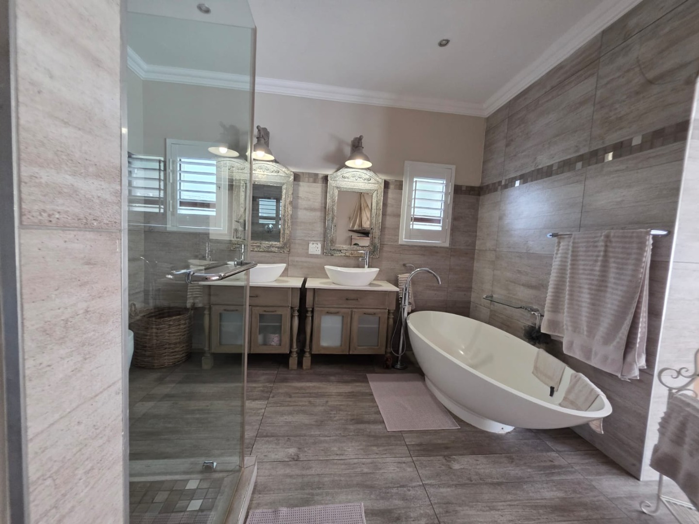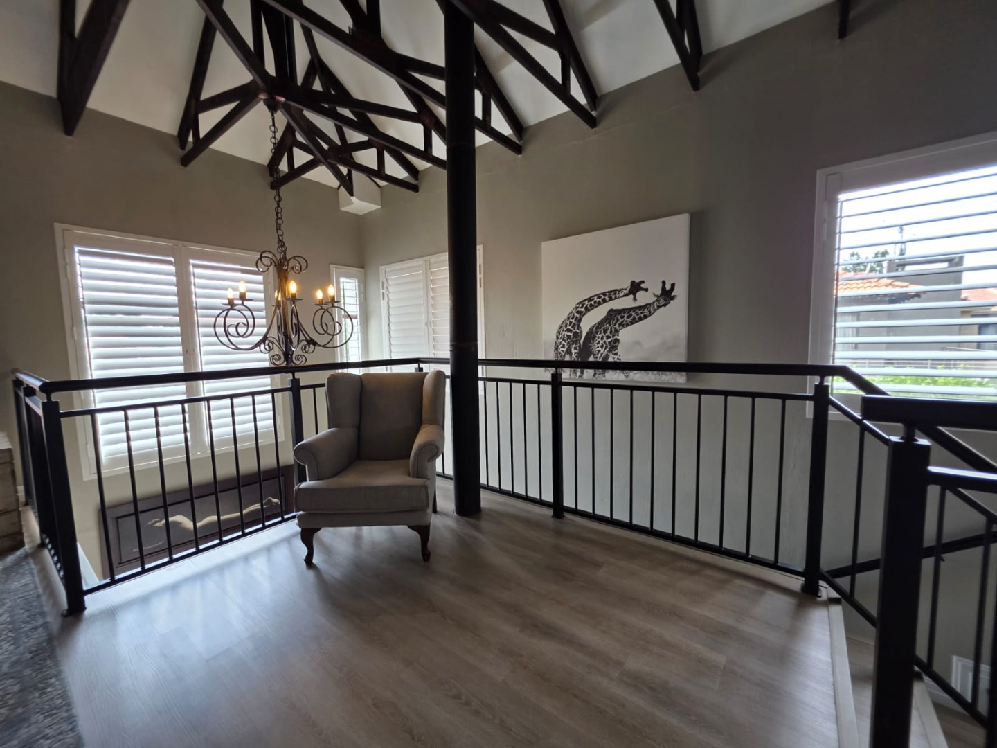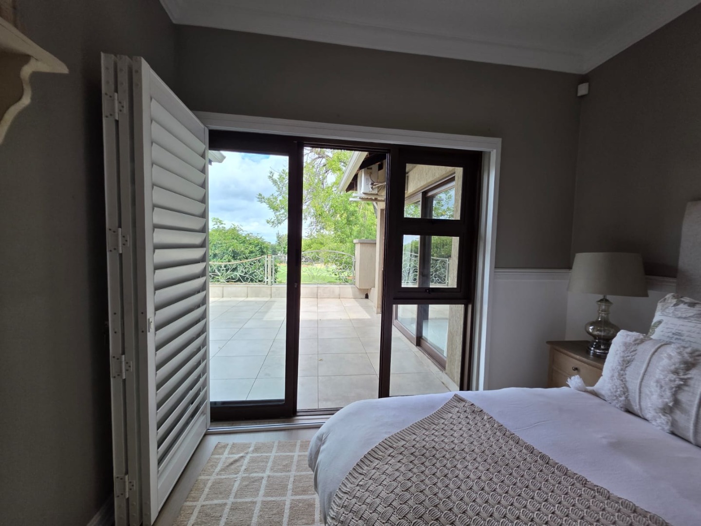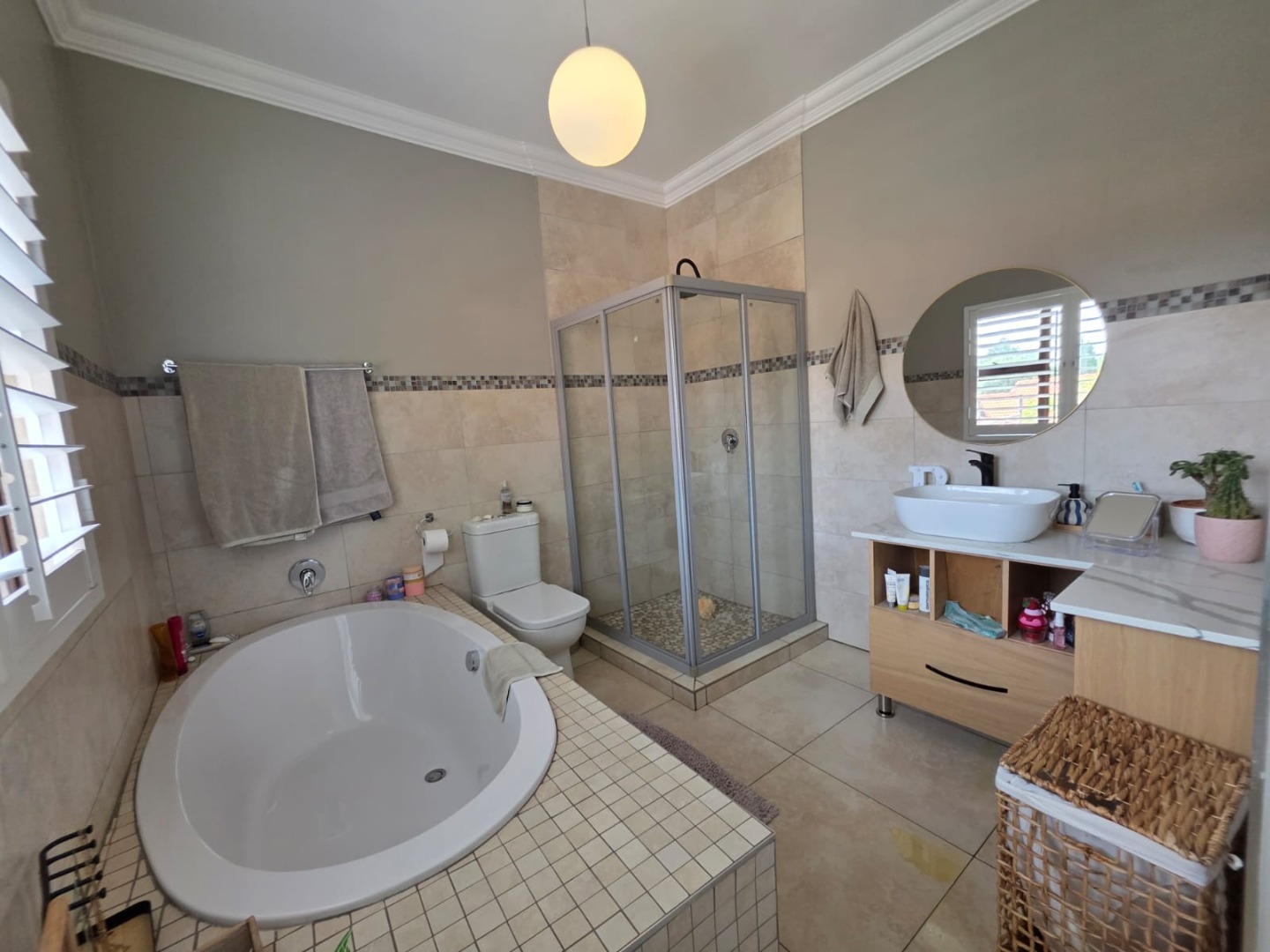 The outdoor areas are designed for ultimate enjoyment. A private swimming pool, complete with a wooden deck and retractable awning, provides a perfect setting for leisure. The spacious patio features built-in seating and a central fire pit, ideal for social gatherings. Enjoy scenic views from the balcony, enhancing the indoor-outdoor living experience. Amenities include a private gym, 2 built-in braais (1 wood and 1 gas) as well as a winter braai room and a wine room, a cozy fireplace, and three garages, ensuring convenience and luxury.