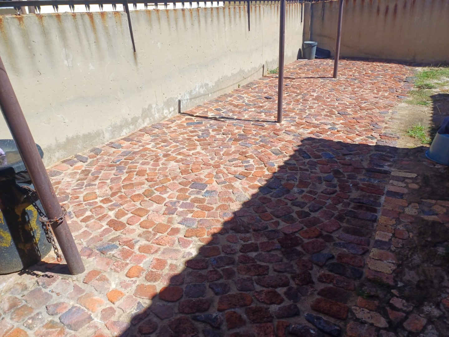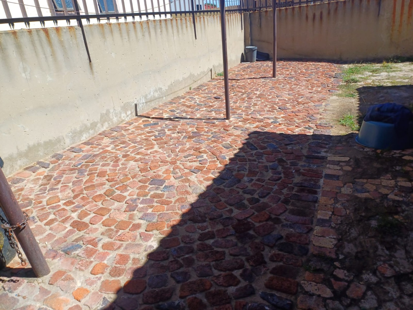 The outdoor areas are practical, featuring extensive brick cobblestone paving that provides durable surfaces for various uses. The property offers two dedicated parking spaces, catering to household needs. Additional security is provided by a security gate on the external door, further contributing to a secure living environment.