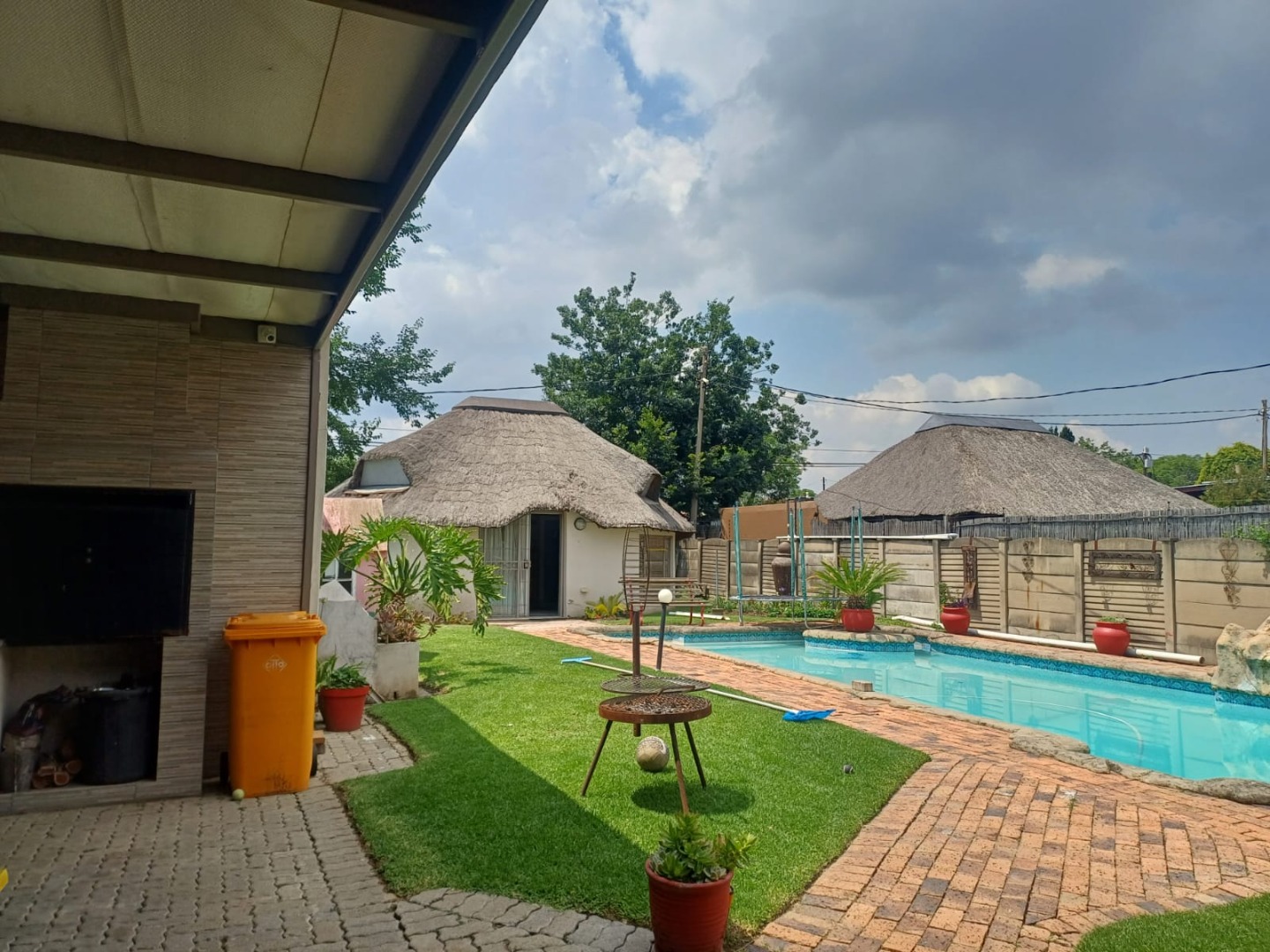 Outdoor living is well-catered for with a refreshing pool, a lapa, and a built-in braai, perfect for entertaining. The property also includes a single garage and four additional parking spaces. Enhanced security features such as burglar bars, an alarm system, and an access gate provide peace of mind. Additional amenities include a laundry area, storage, and domestic rooms with outside toilets.