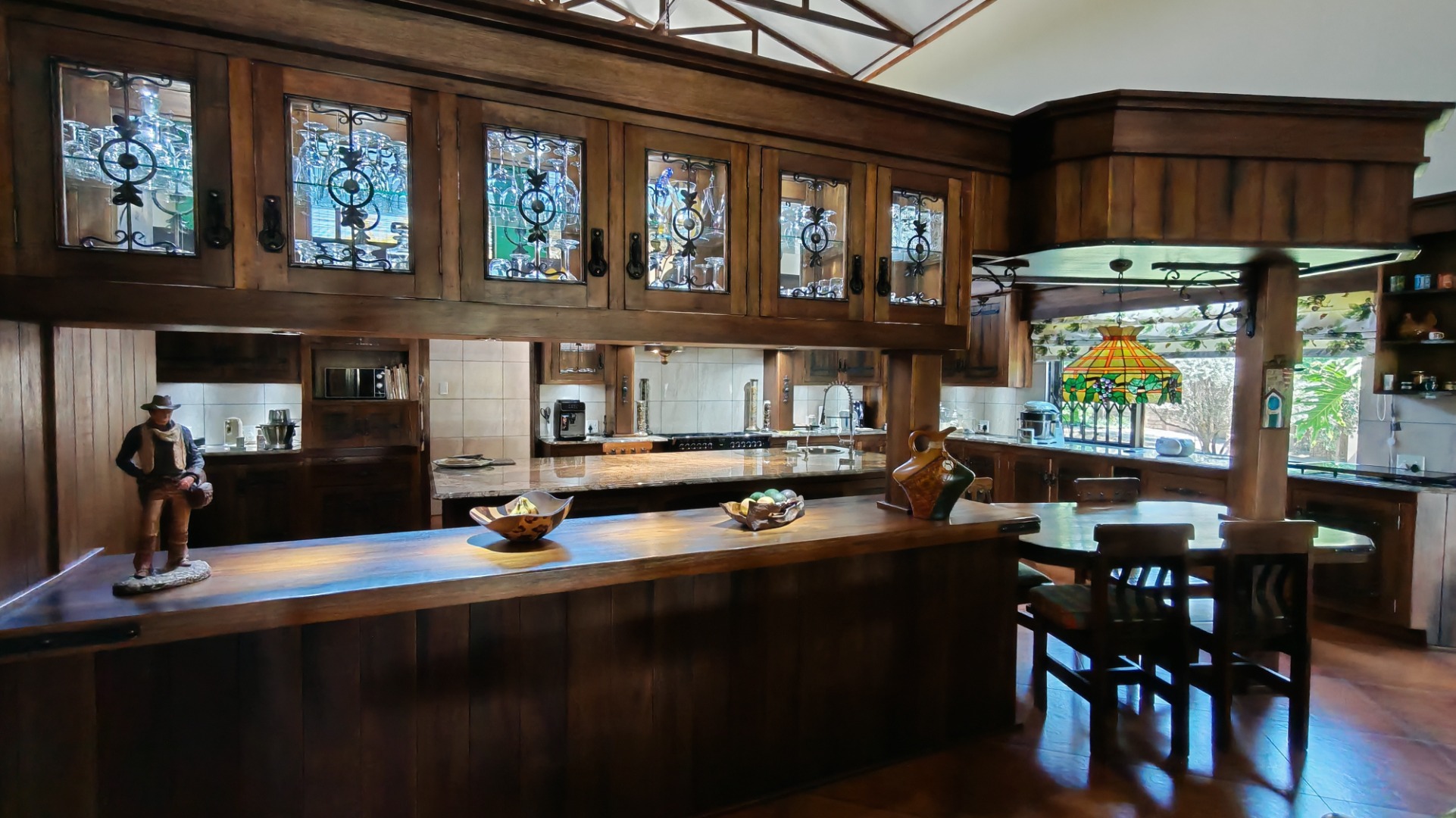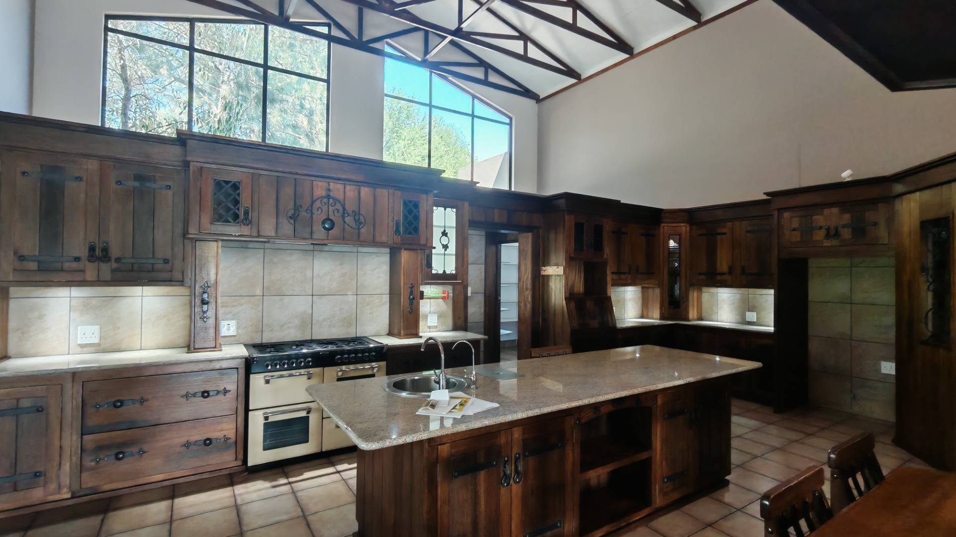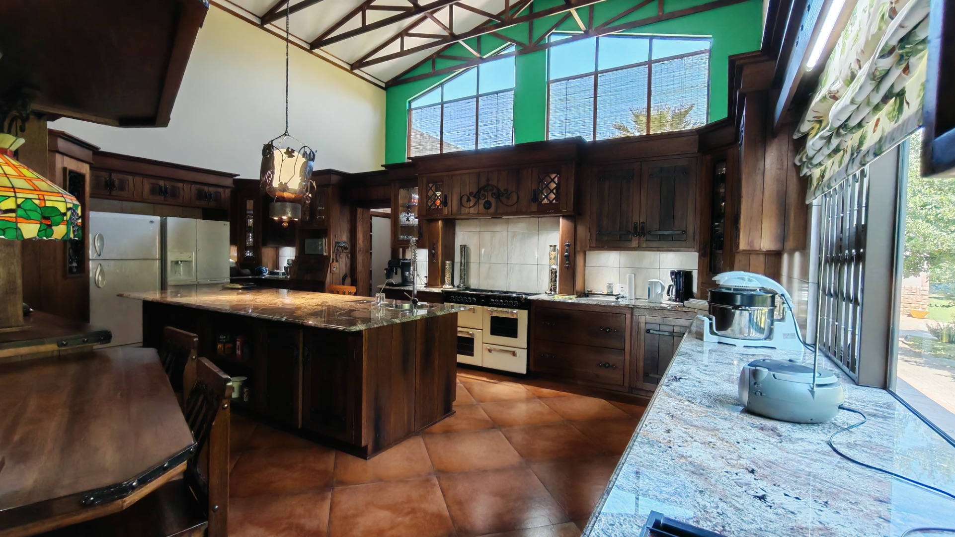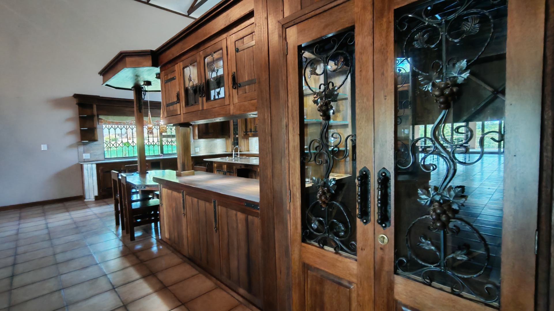 You have a gorgeous entrance hallway leading to a large open-plan living area with a built-in braai with rotisserie, stacker doors, a spacious kitchen with custom-made meranti cupboards, high-end appliances, seperate wash-up, laundry, walk in pantry and built in wood and stained glass wine cellar.