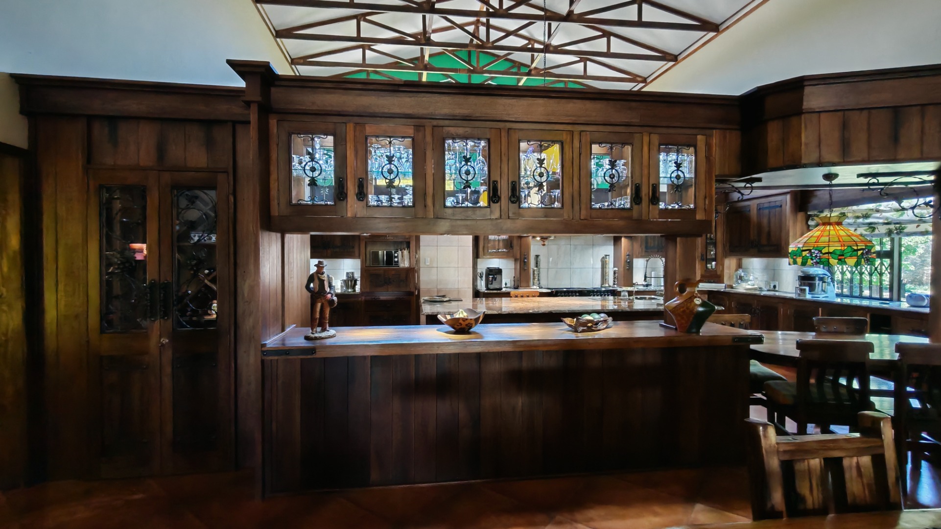 You have a gorgeous entrance hallway leading to a large open-plan living area with a built-in braai with rotisserie, stacker doors, a spacious kitchen with custom-made meranti cupboards, high-end appliances, seperate wash-up, laundry, walk in pantry and built in wood and stained glass wine cellar.