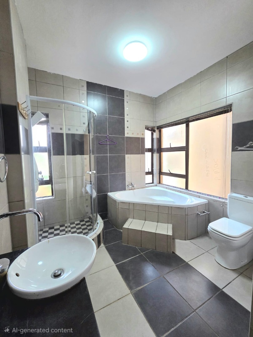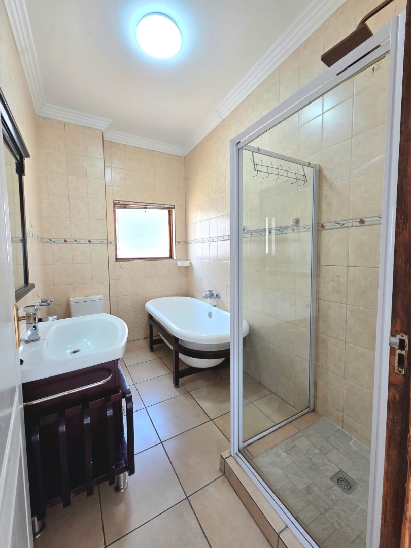 The modern kitchen is a chef’s delight with an open-plan dining area, separate pantry, and scullery for added convenience. Outside, the well-maintained garden offers a peaceful space to unwind. The home also features a double garage, pre-paid electricity, and utilities billed separately.