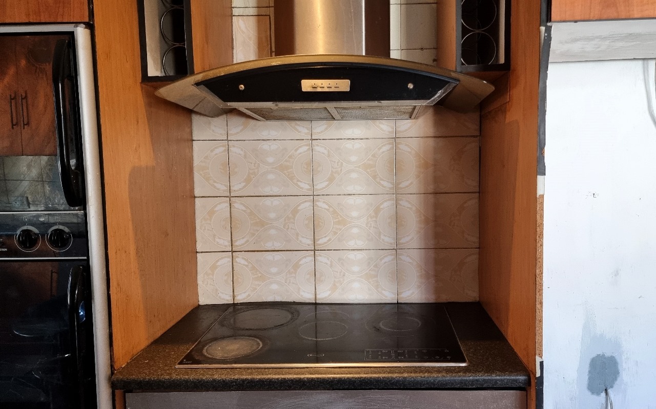 ii) Whirlpool electric glass hob with touch buttons and a fan extractor.