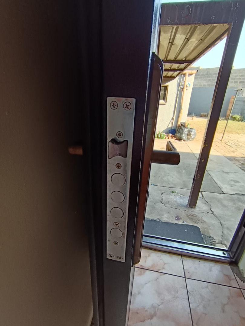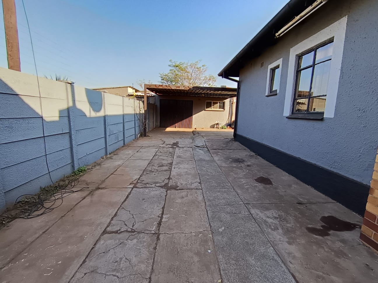 Security is a key consideration, with the property featuring burglar bars on windows and a robust security gate at the entrance, including a multi-point security door. Externally, the property benefits from a fenced backyard, offering a private outdoor space. A covered outdoor area, which can serve as a carport or additional storage, provides practical utility. Paved areas lead to the entrance, which is further protected by an awning.
